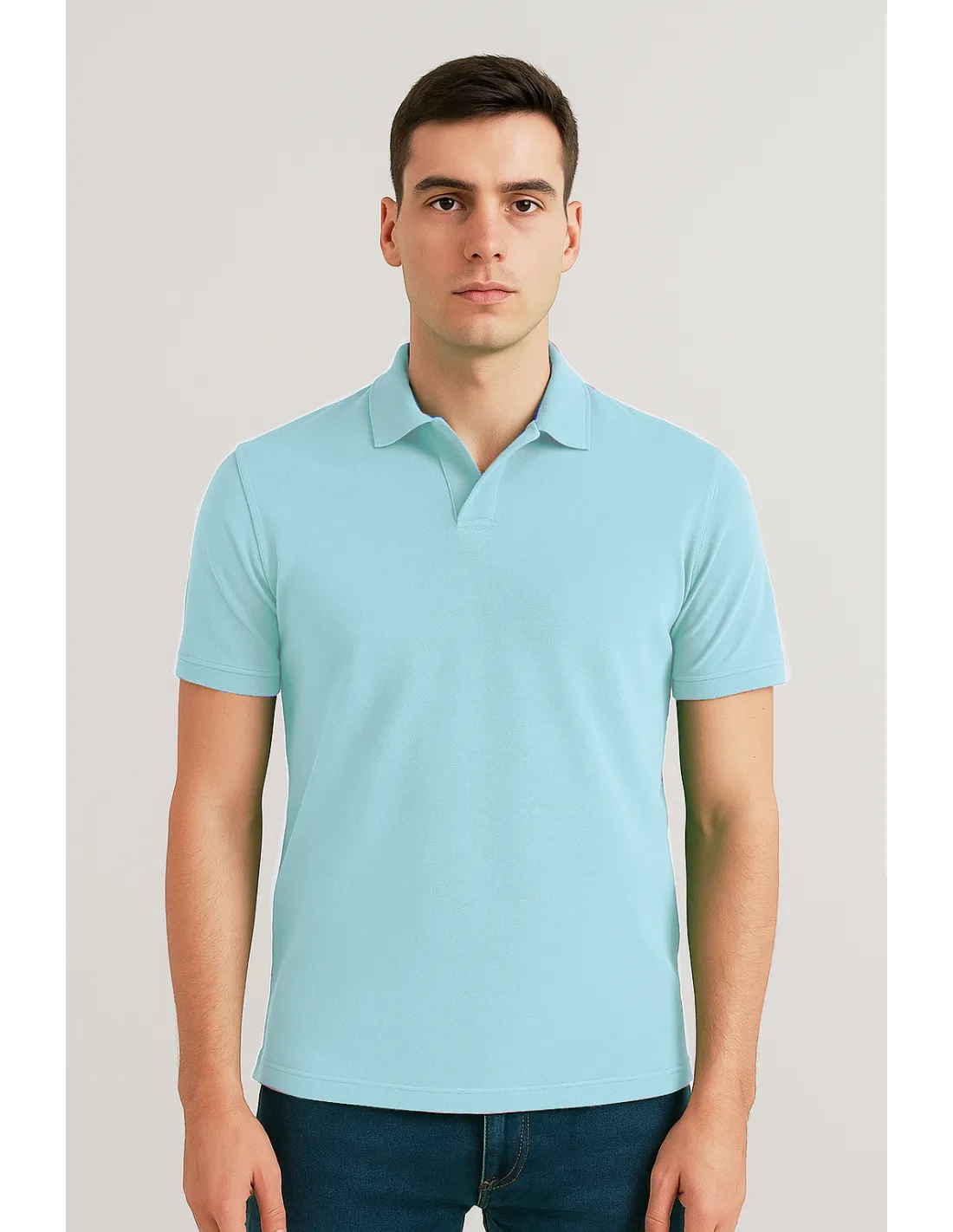 Collezione estiva, polo uomo Filippo De Laurentiis, in piquet di cotone celeste, manica corta, scollo senza bottoni, vestibilità regular