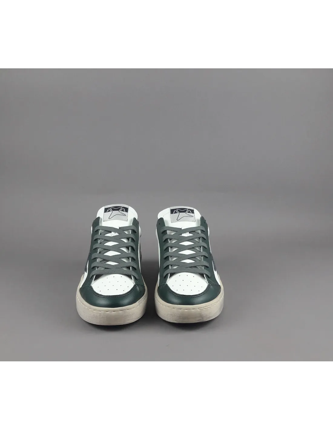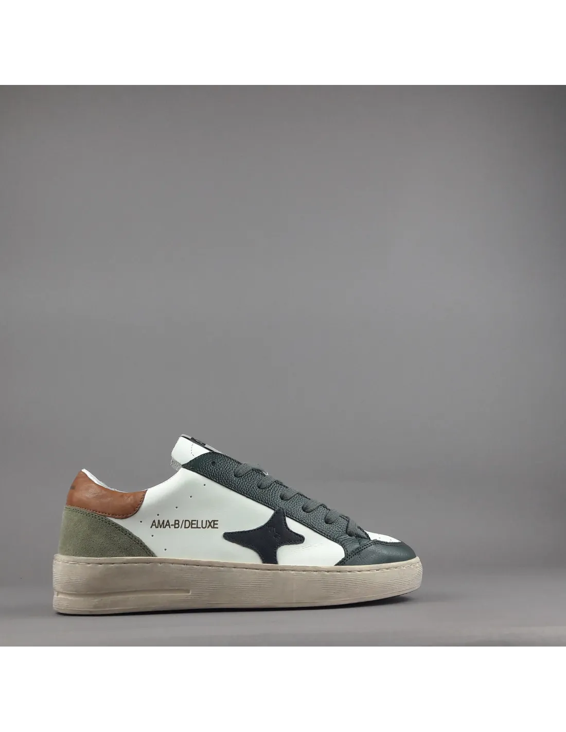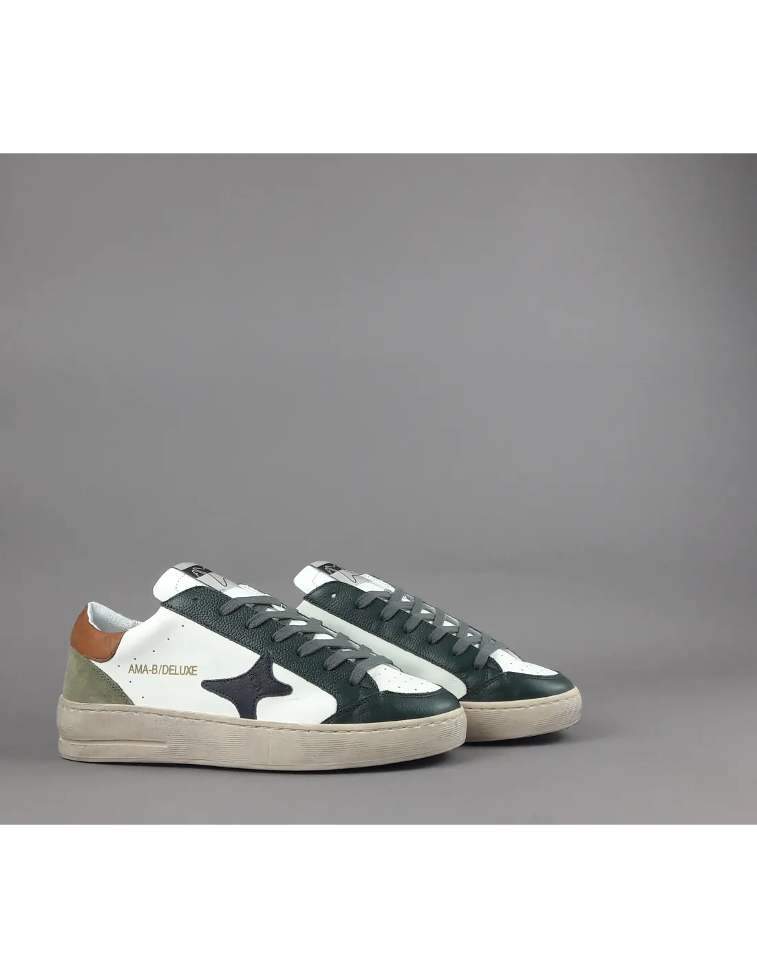 Collezione invernale, sneakers uomo slam, in pelle martellata verde scuro e pelle bianco, logo laterale in pelle blu scuro, spoiler tallone in pelle cuoio, dettagli tallone in camoscio, fussbett estraibile, fondo cucito in gomma 4cm