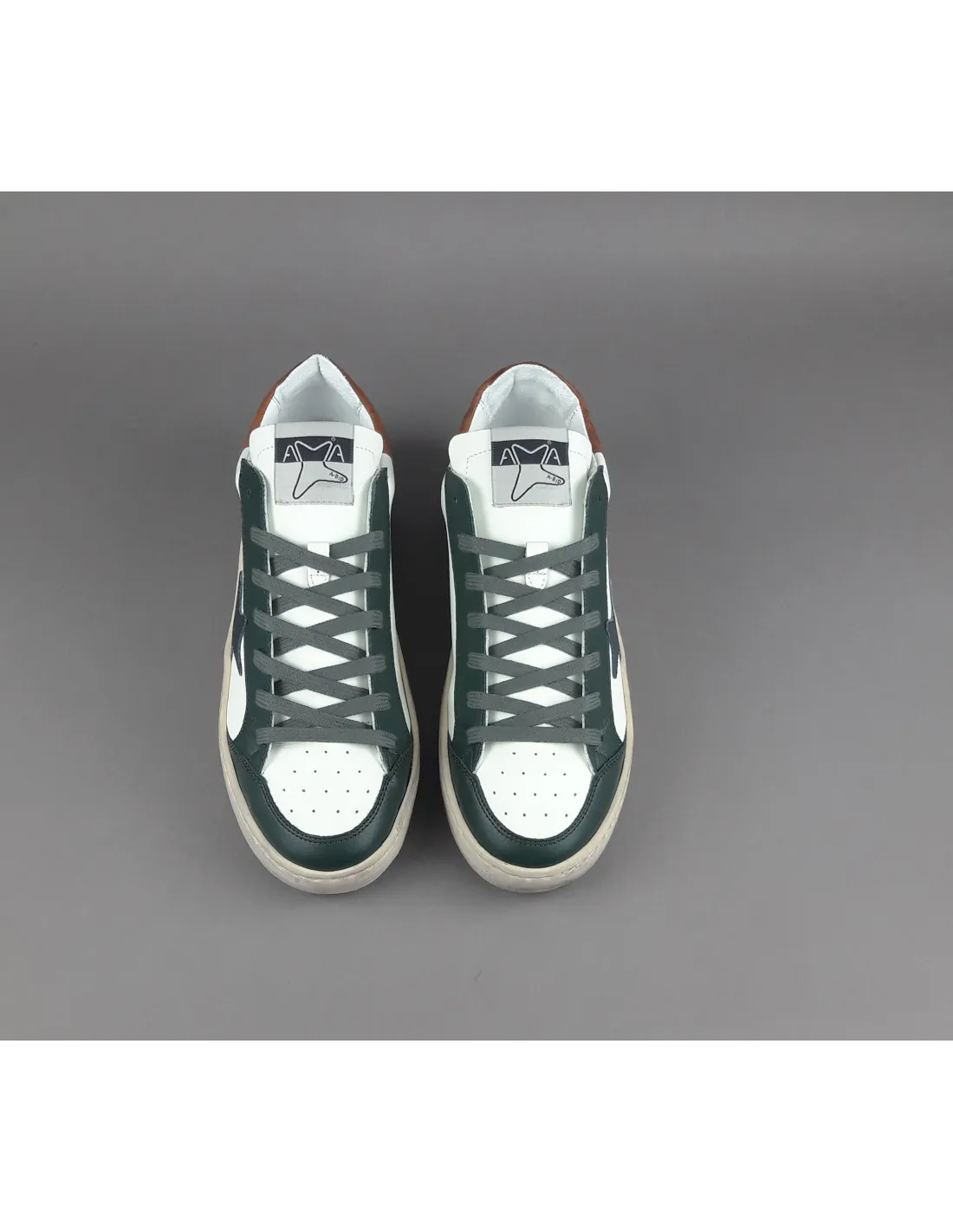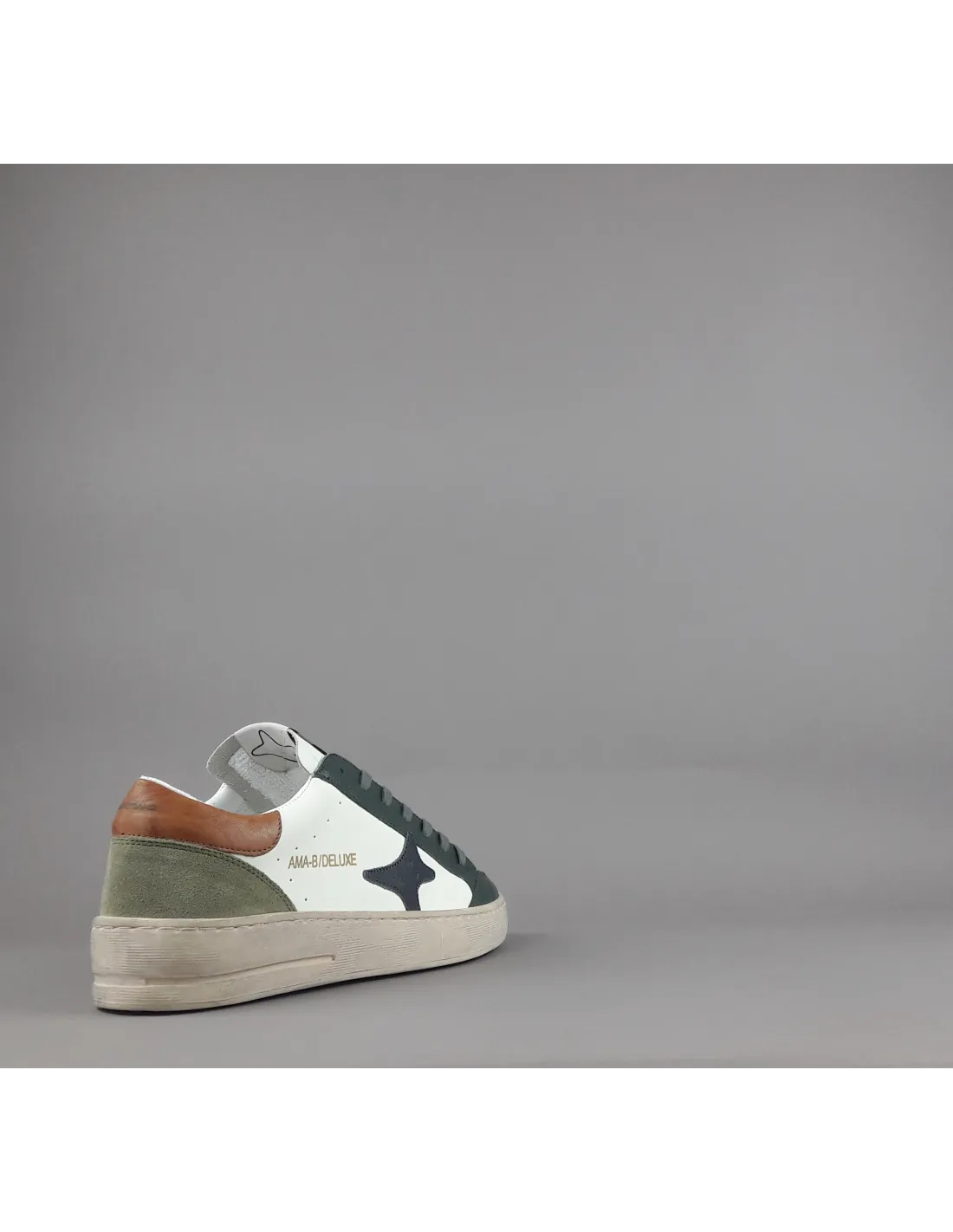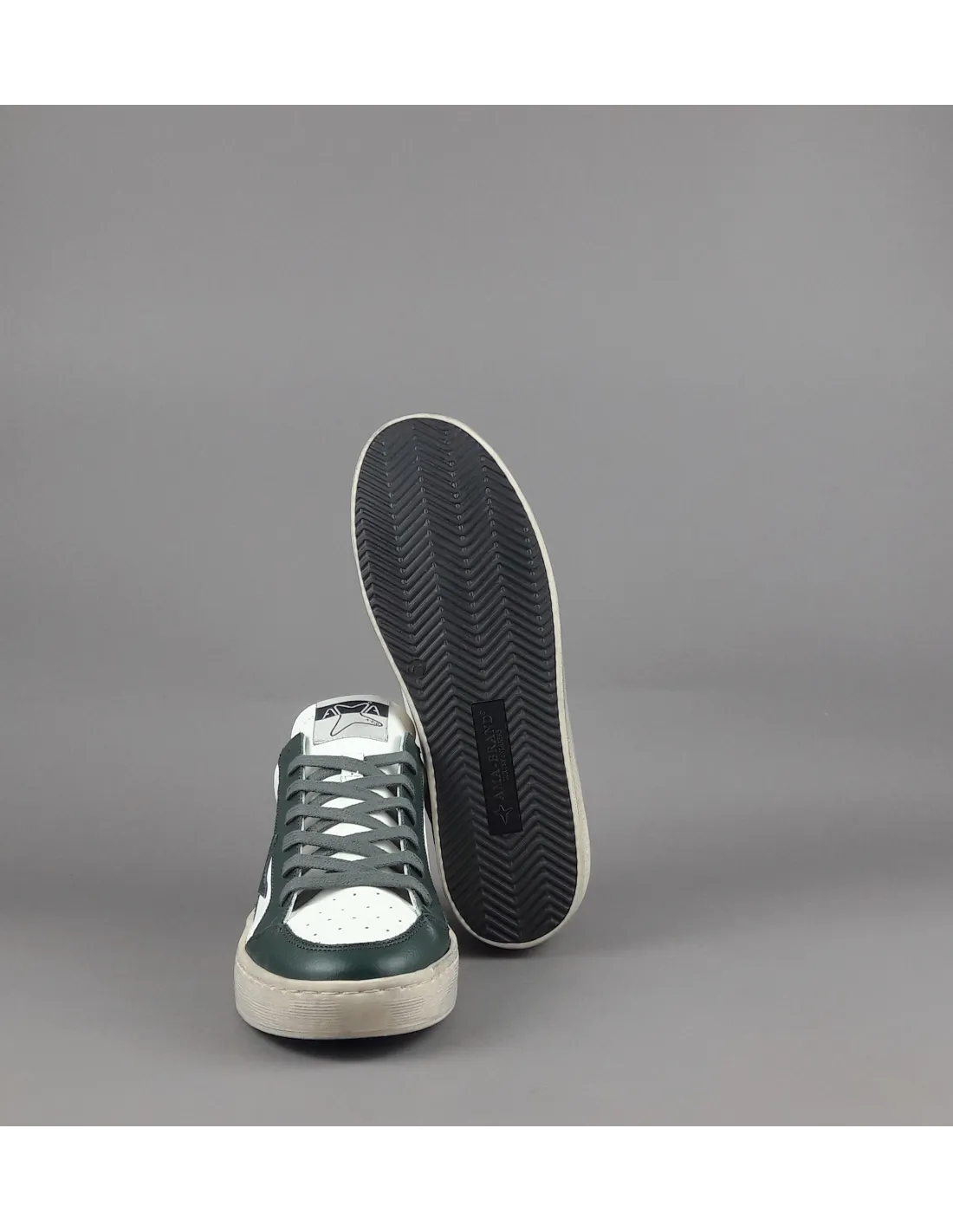 Collezione invernale, sneakers uomo slam, in pelle martellata verde scuro e pelle bianco, logo laterale in pelle blu scuro, spoiler tallone in pelle cuoio, dettagli tallone in camoscio, fussbett estraibile, fondo cucito in gomma 4cm