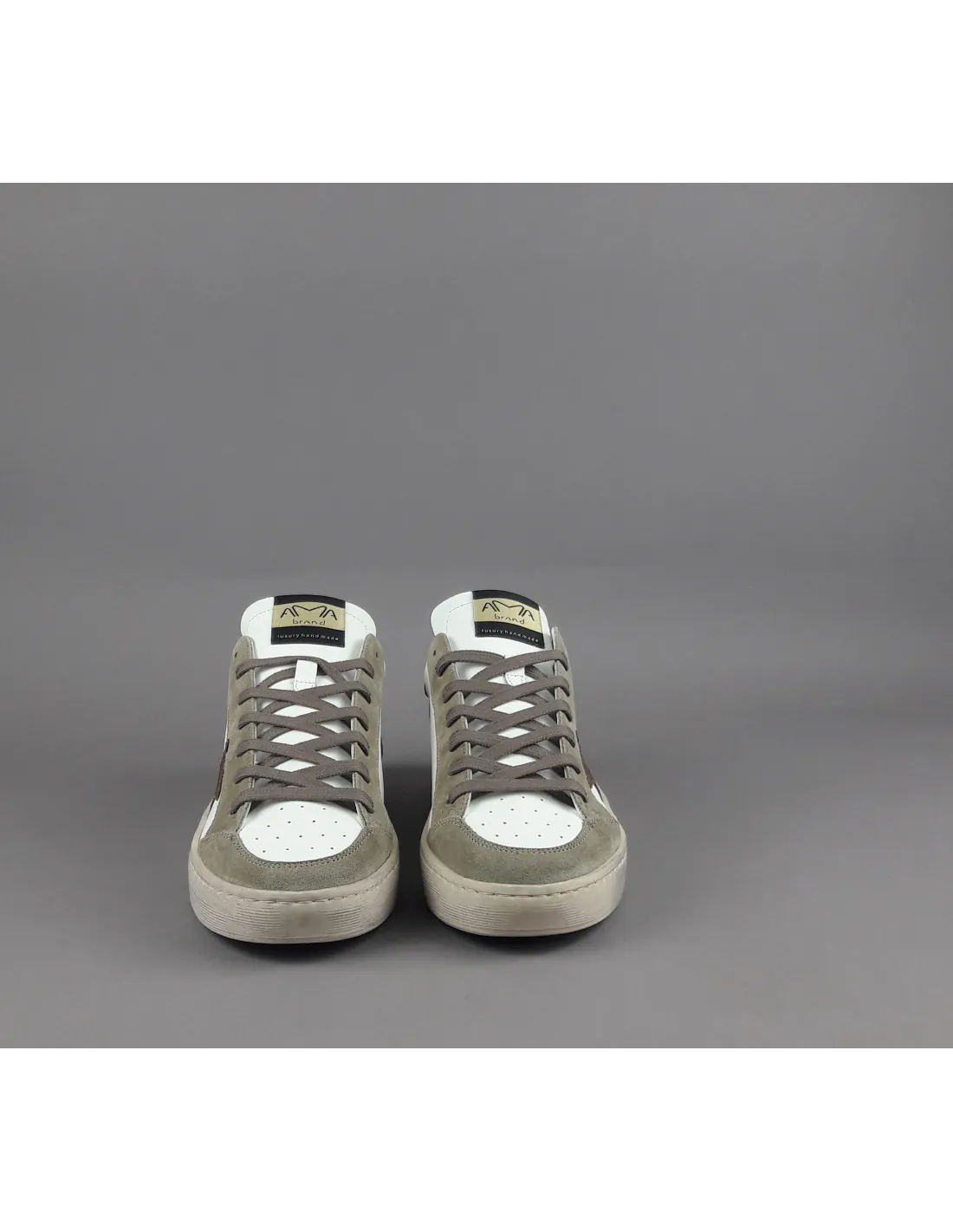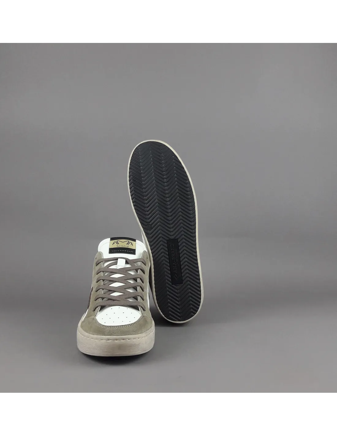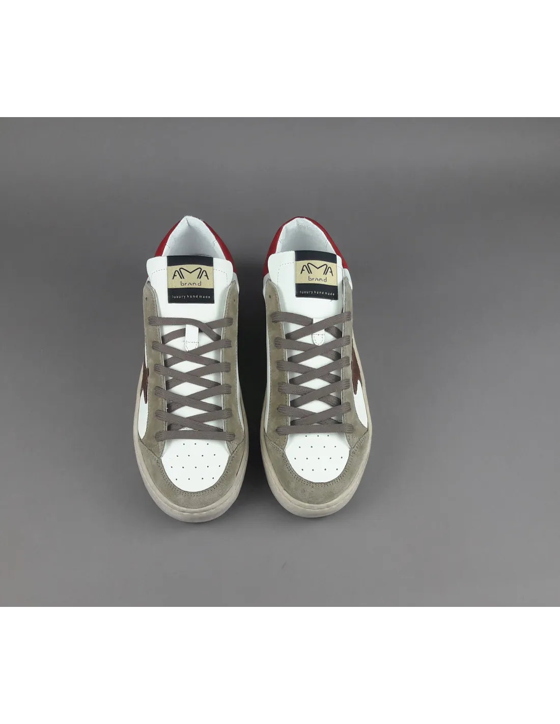 Collezione invernale, sneakers uomo slam, in camoscio verde militare tenue e pelle bianco, logo laterale in pelle marrone scuro, spoiler tallone in pelle rosso, dettagli tallone in camoscio, fussbett estraibile, fondo cucito in gomma 4cm