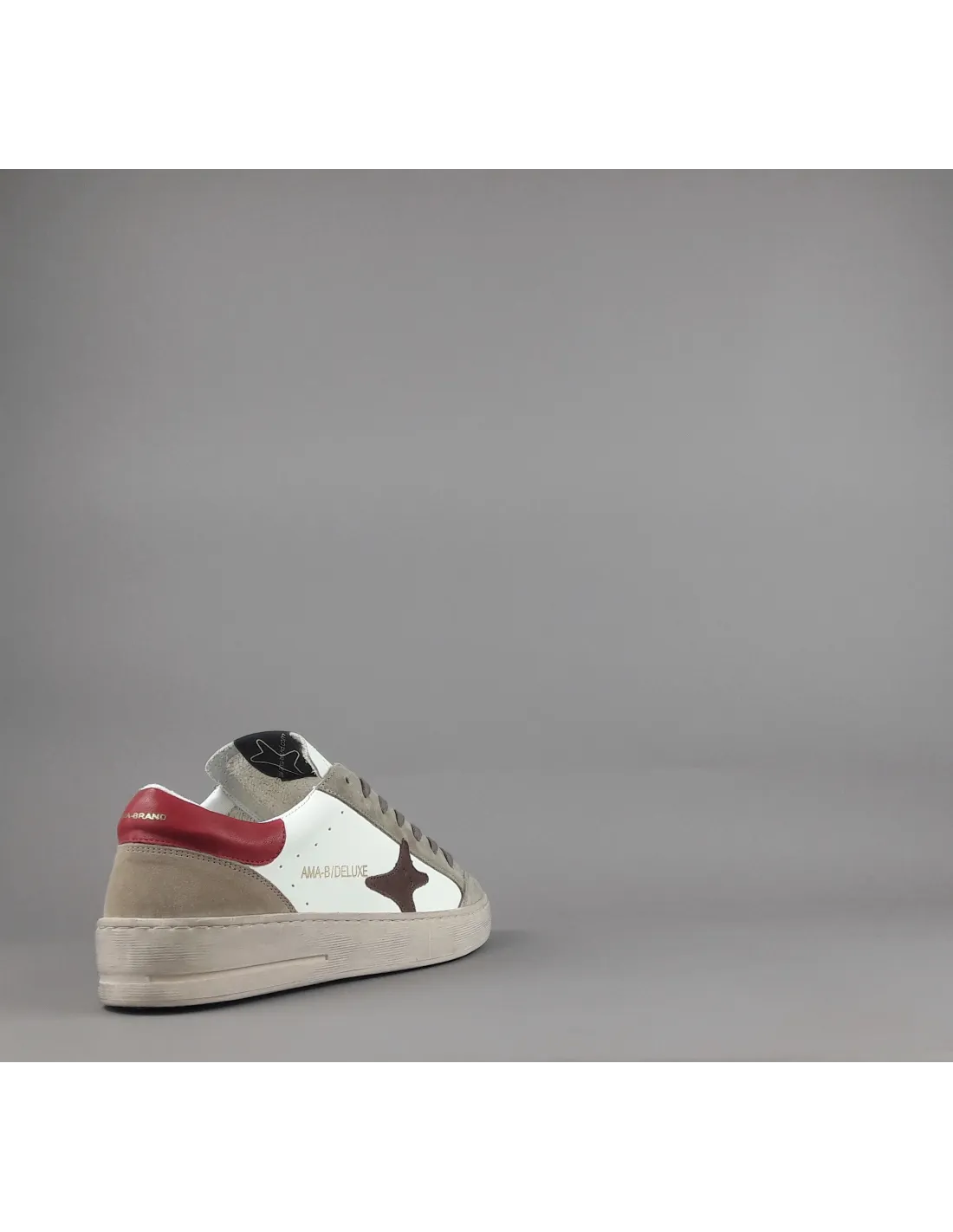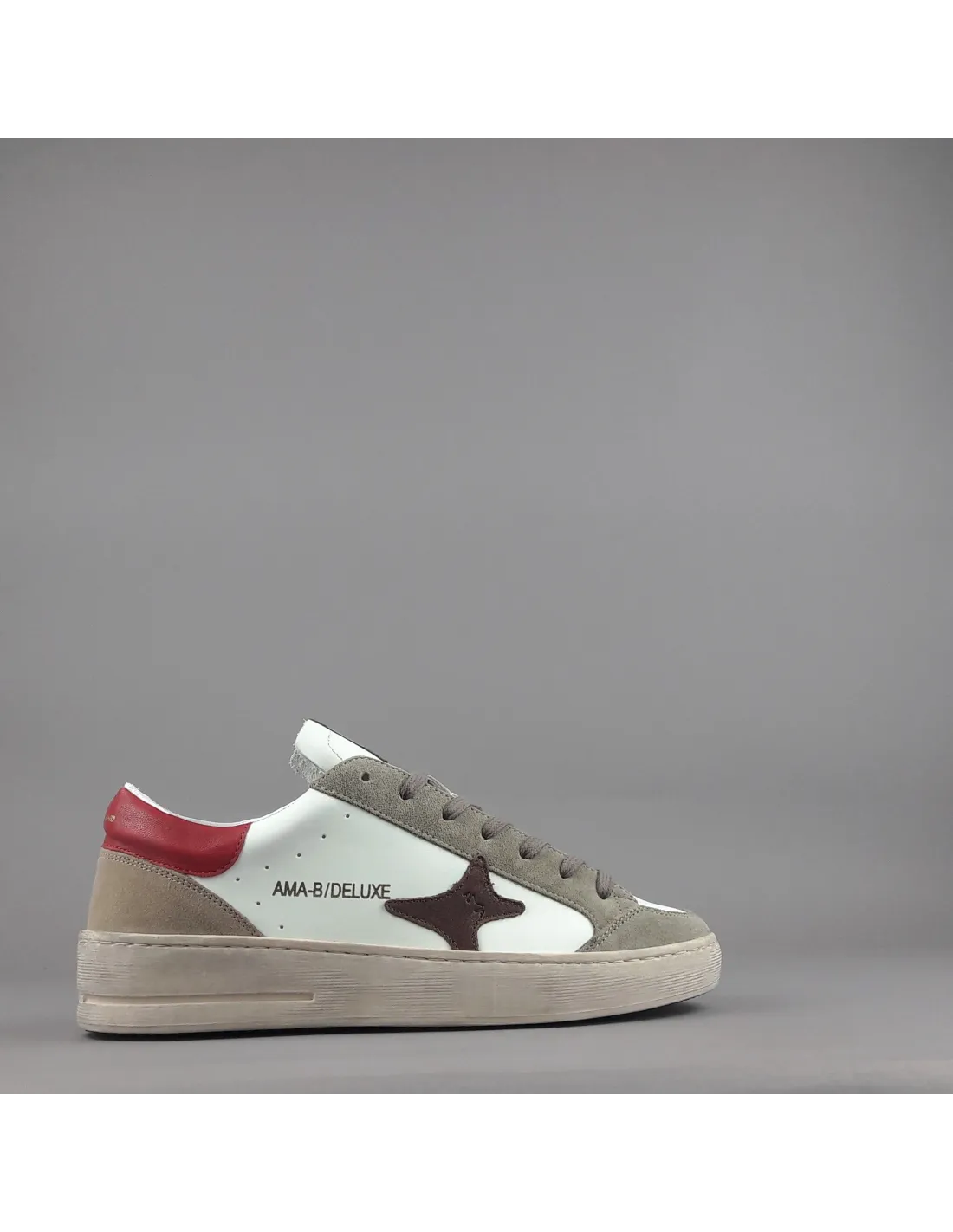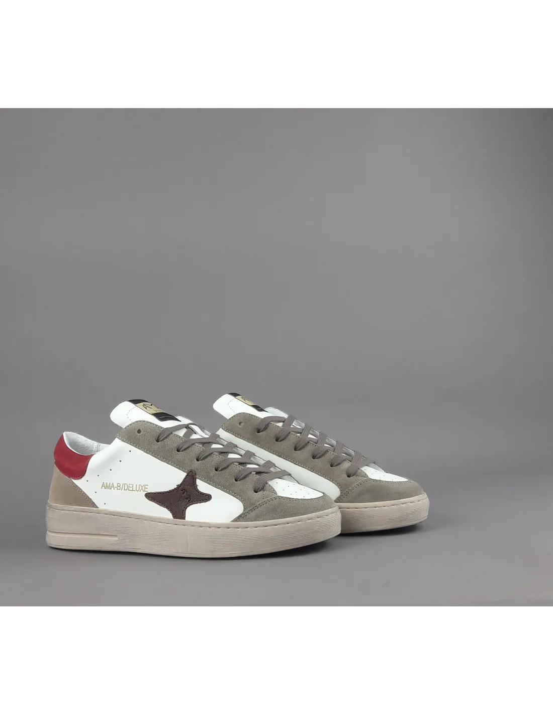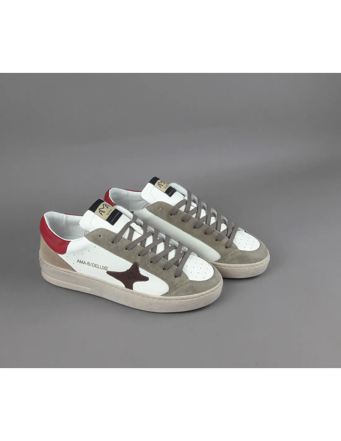 Collezione invernale, sneakers uomo slam, in camoscio verde militare tenue e pelle bianco, logo laterale in pelle marrone scuro, spoiler tallone in pelle rosso, dettagli tallone in camoscio, fussbett estraibile, fondo cucito in gomma 4cm