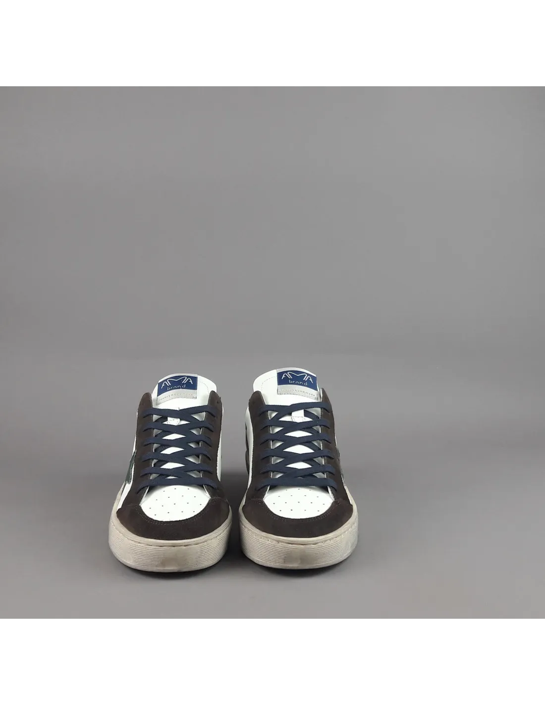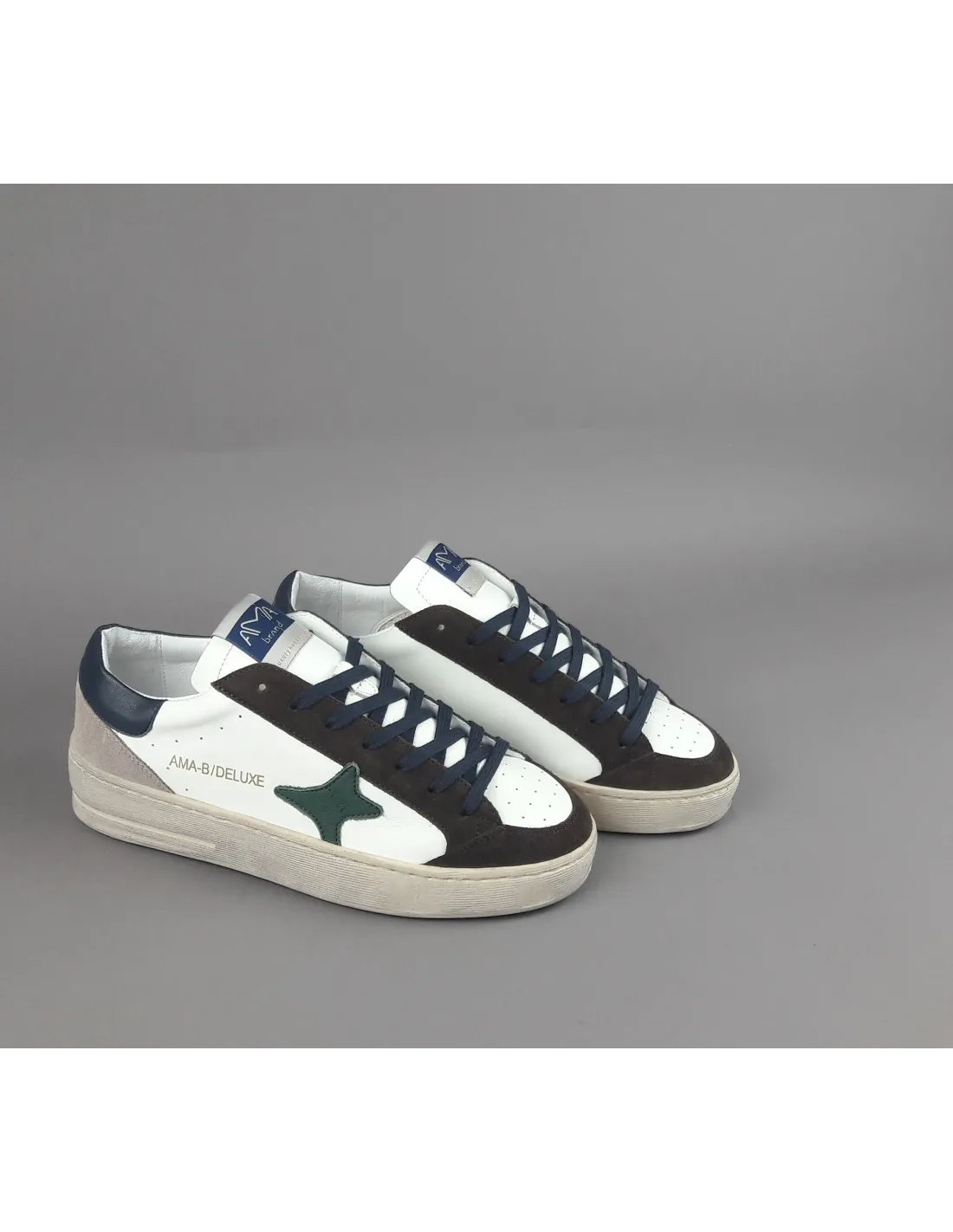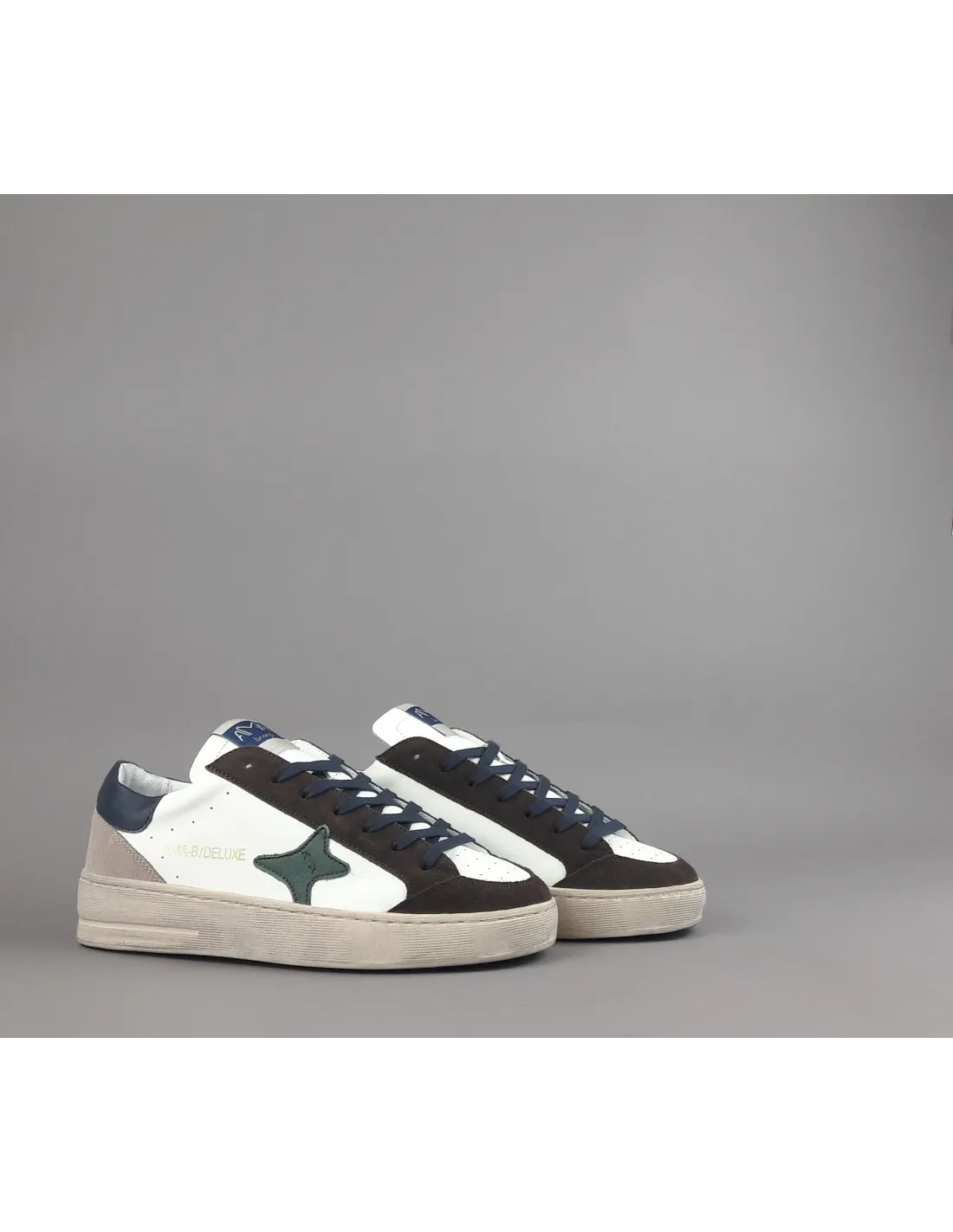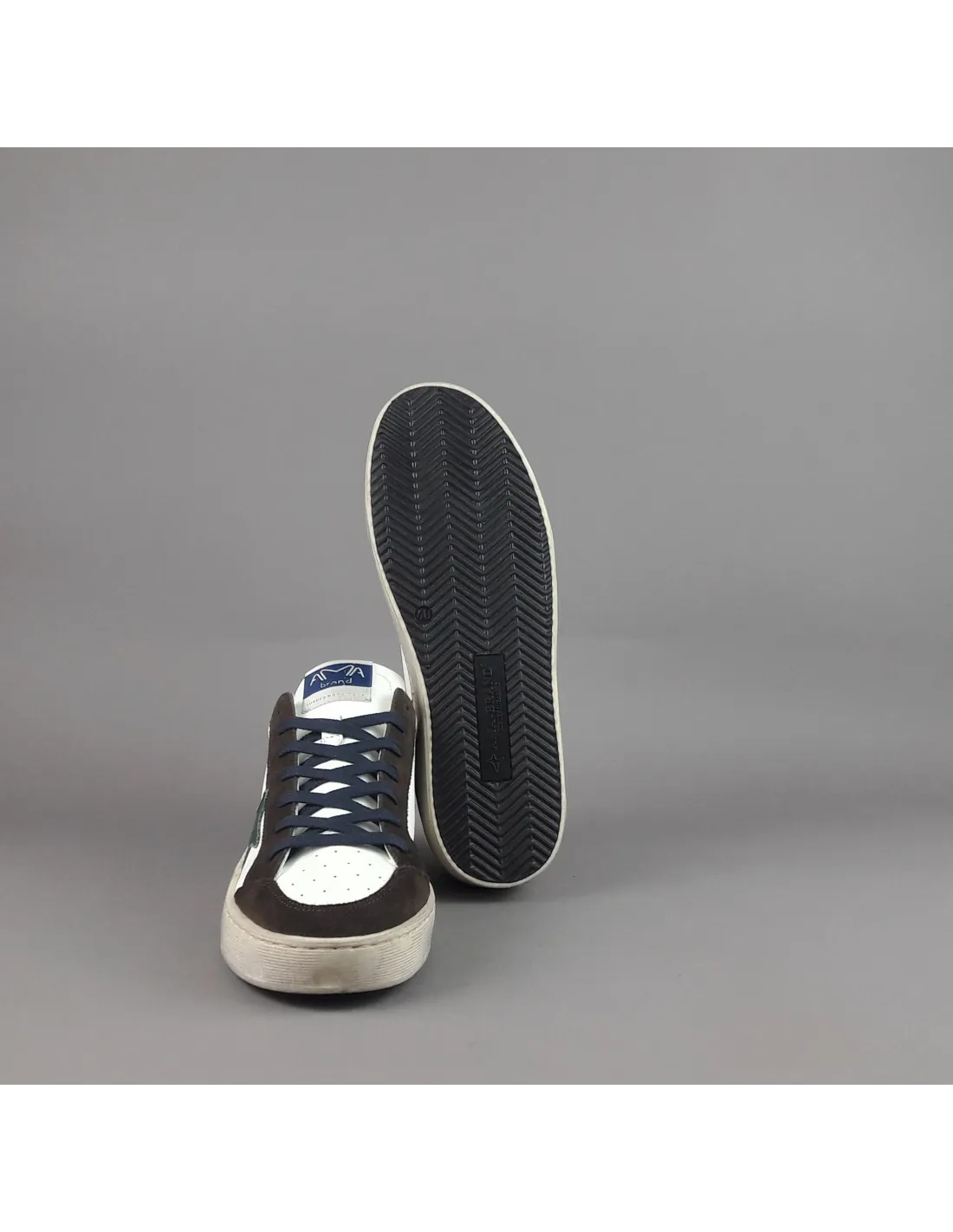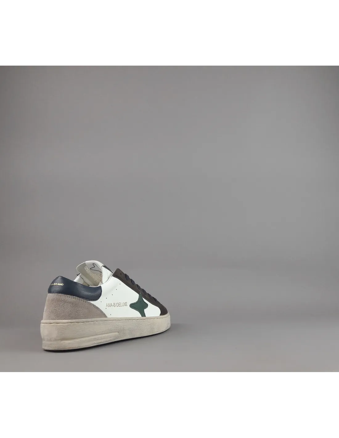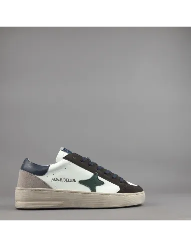 Collezione invernale, sneakers uomo slam, in camoscio marrone scuro e pelle bianco, logo laterale in pelle verde, spoiler tallone in pelle blu, dettagli tallone in camoscio, fussbett estraibile, fondo cucito in gomma 4cm