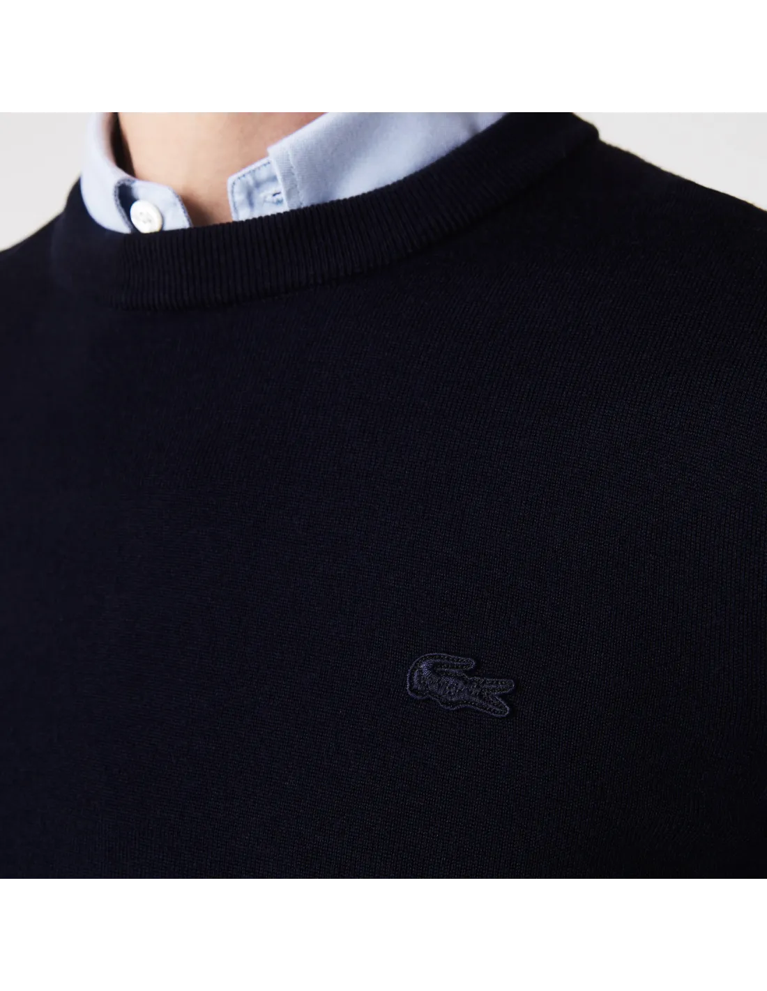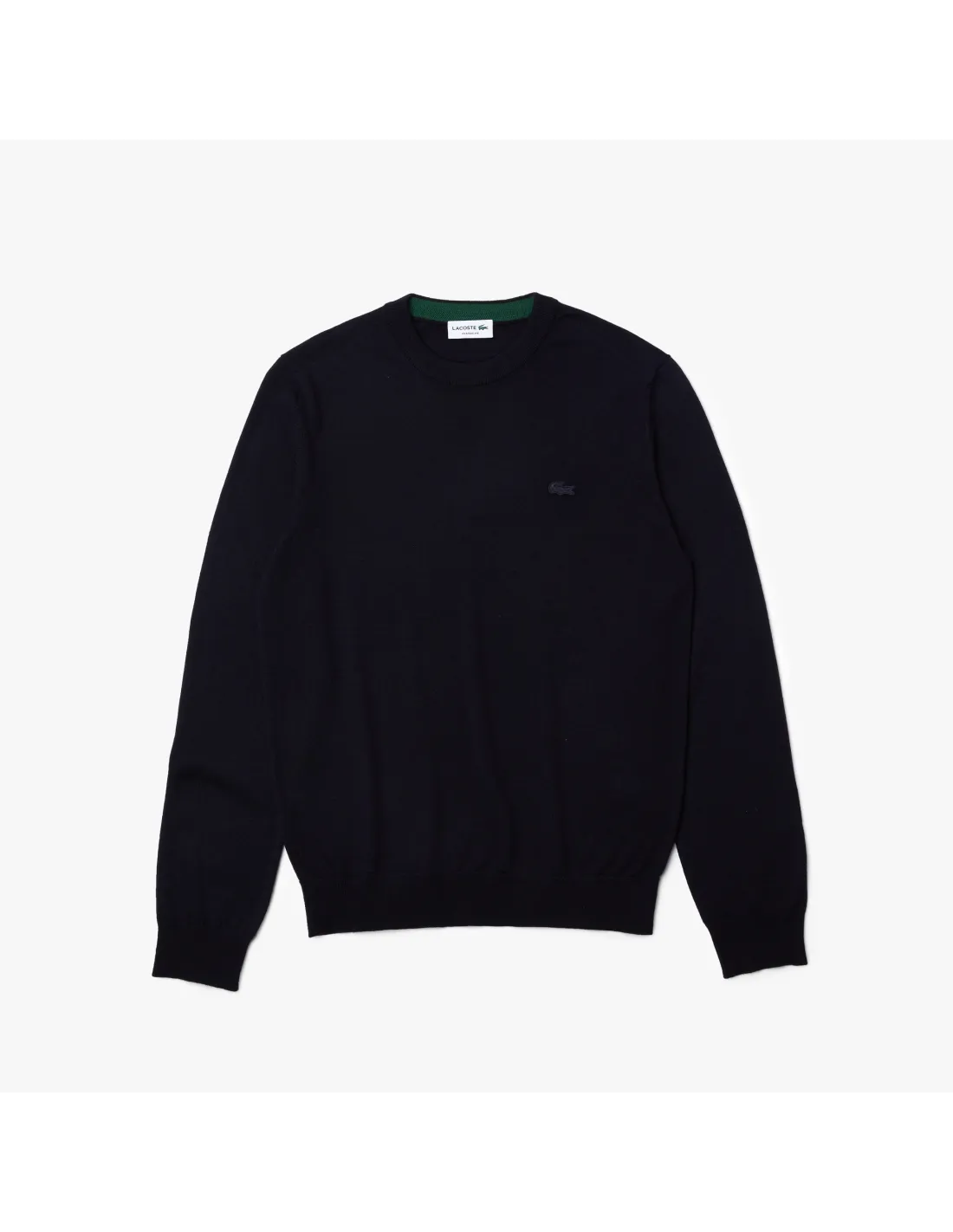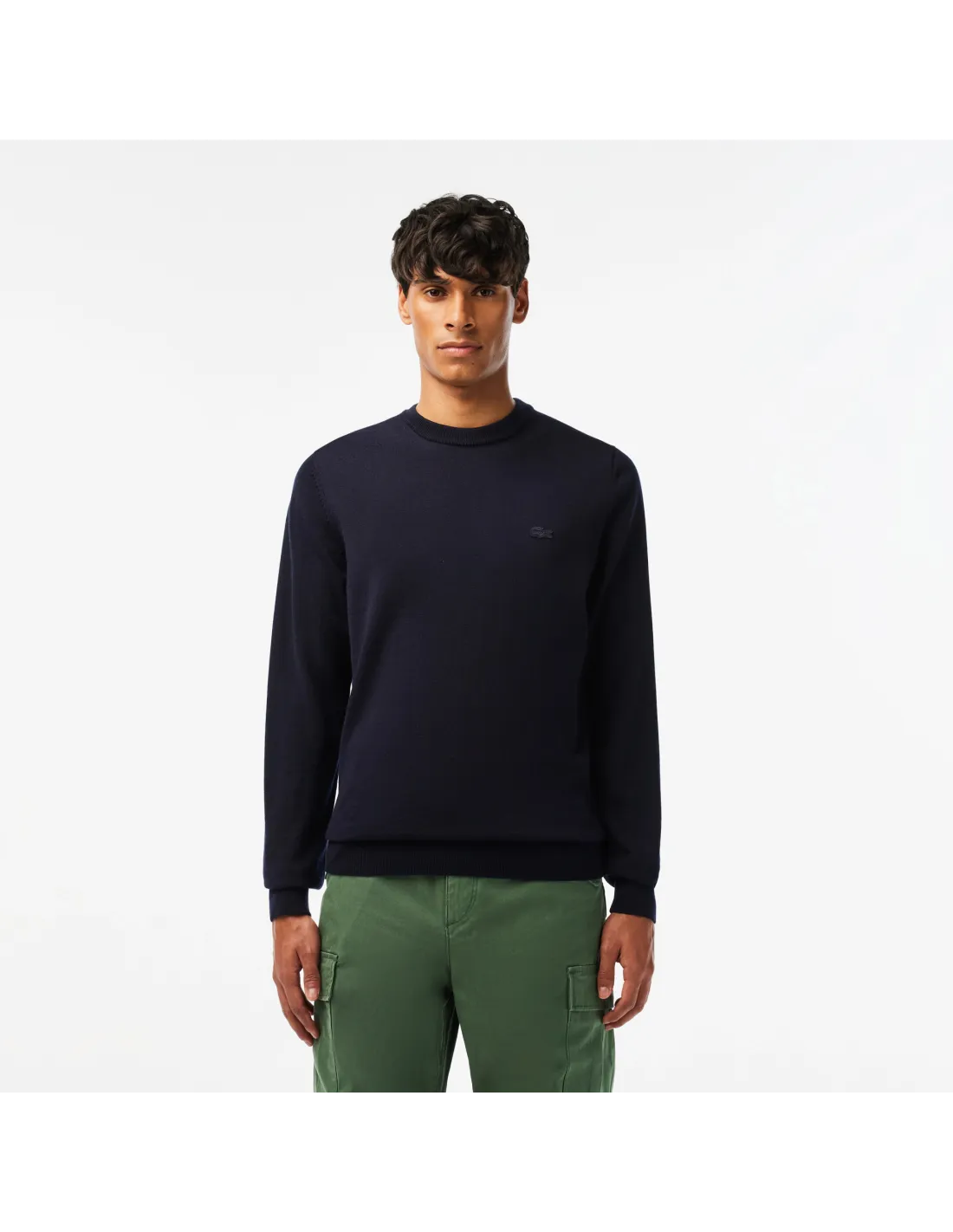 Collezione invernale, maglia pullover uomo in lana merino, girocollo, fondo e maniche in costine, logo coccodrillo in tinta