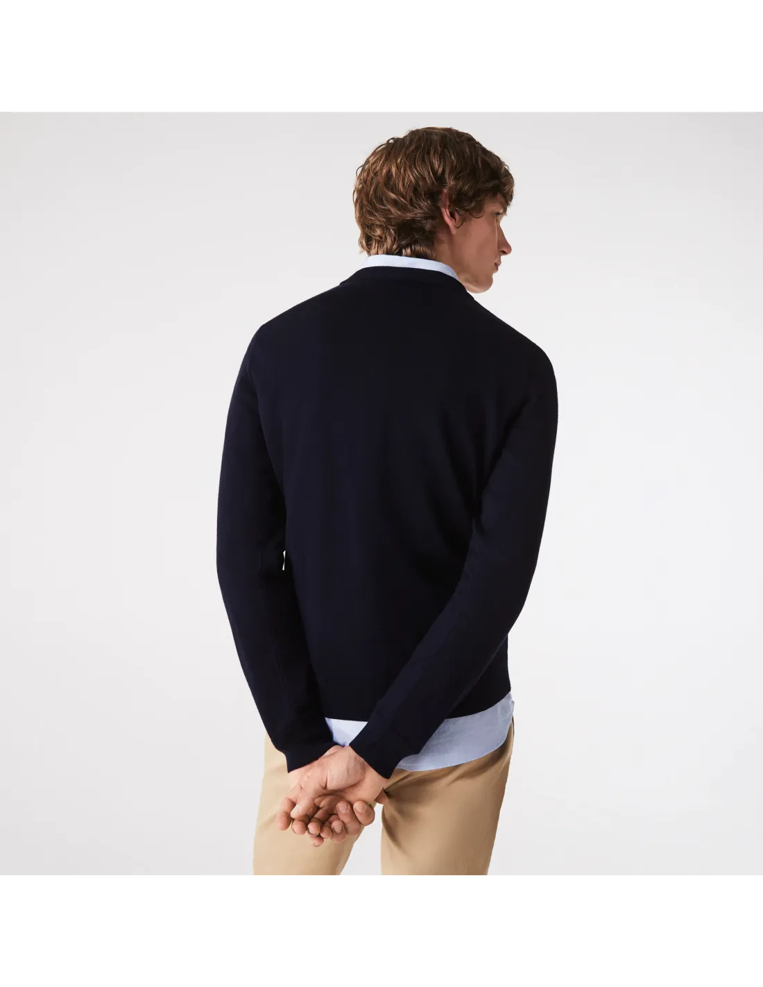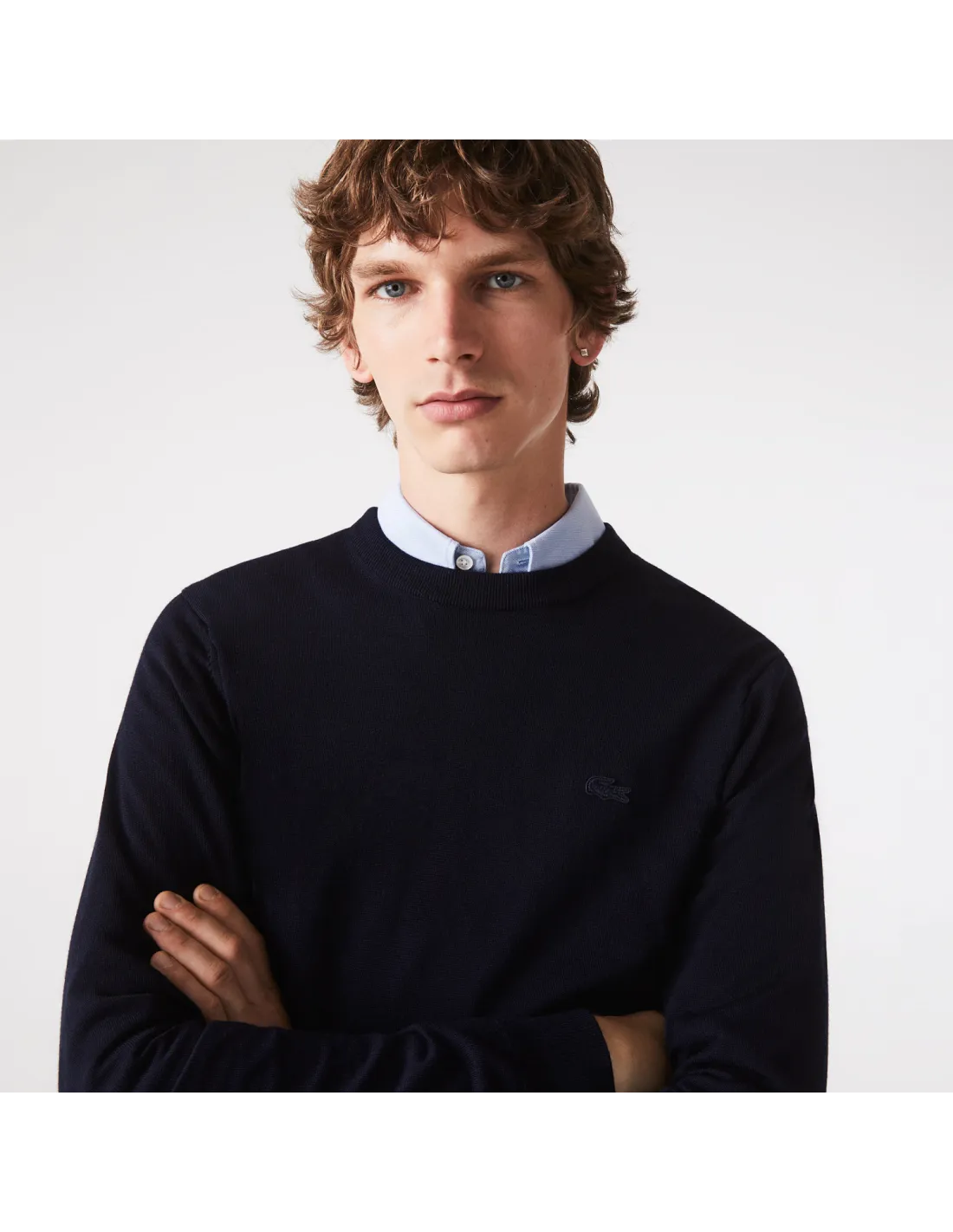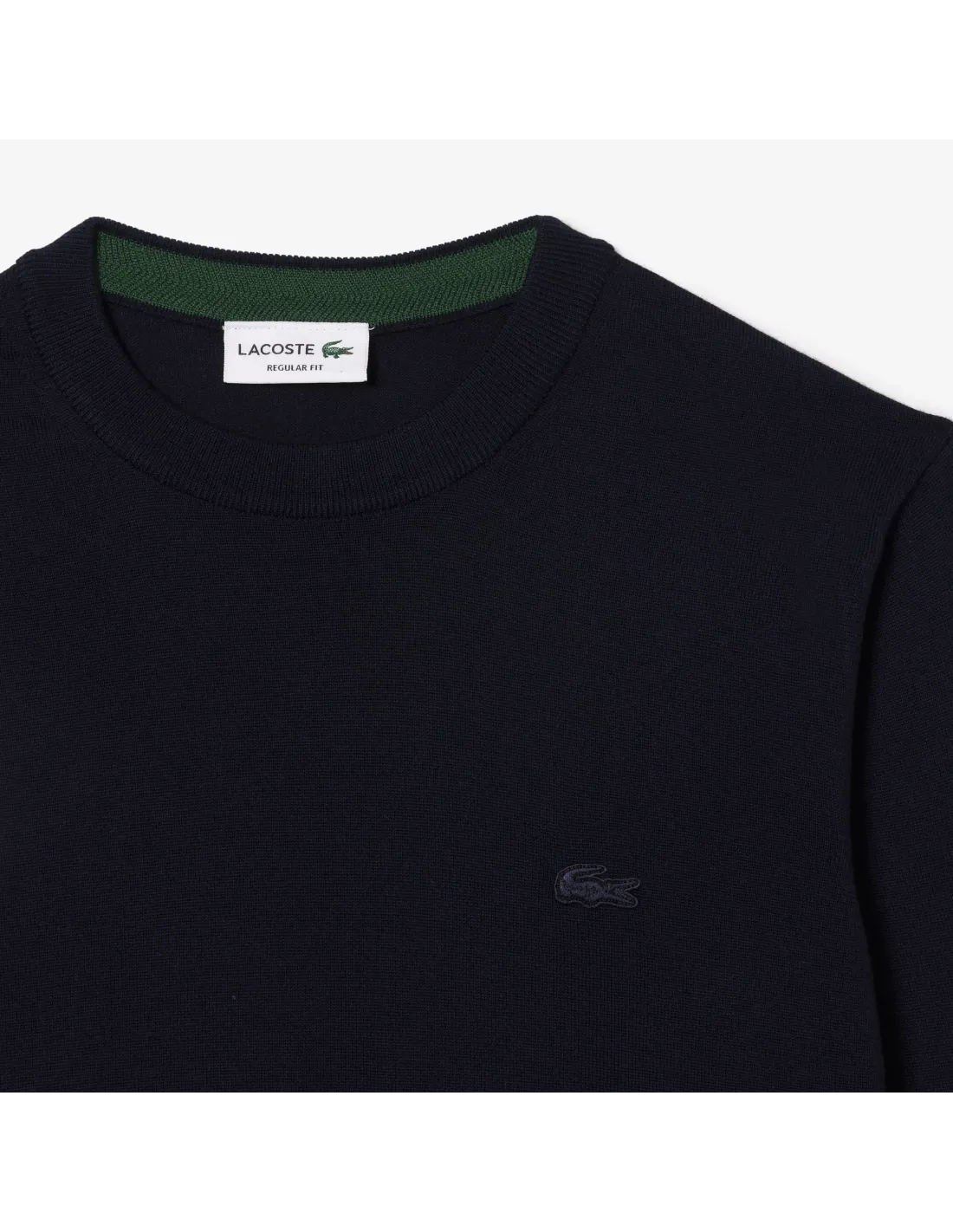 Collezione invernale, maglia pullover uomo in lana merino, girocollo, fondo e maniche in costine, logo coccodrillo in tinta
