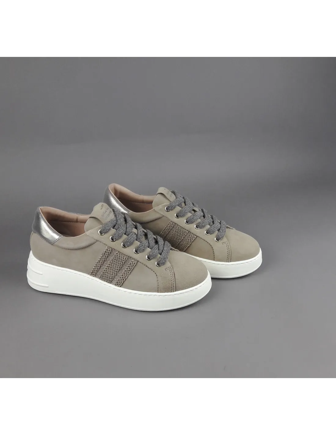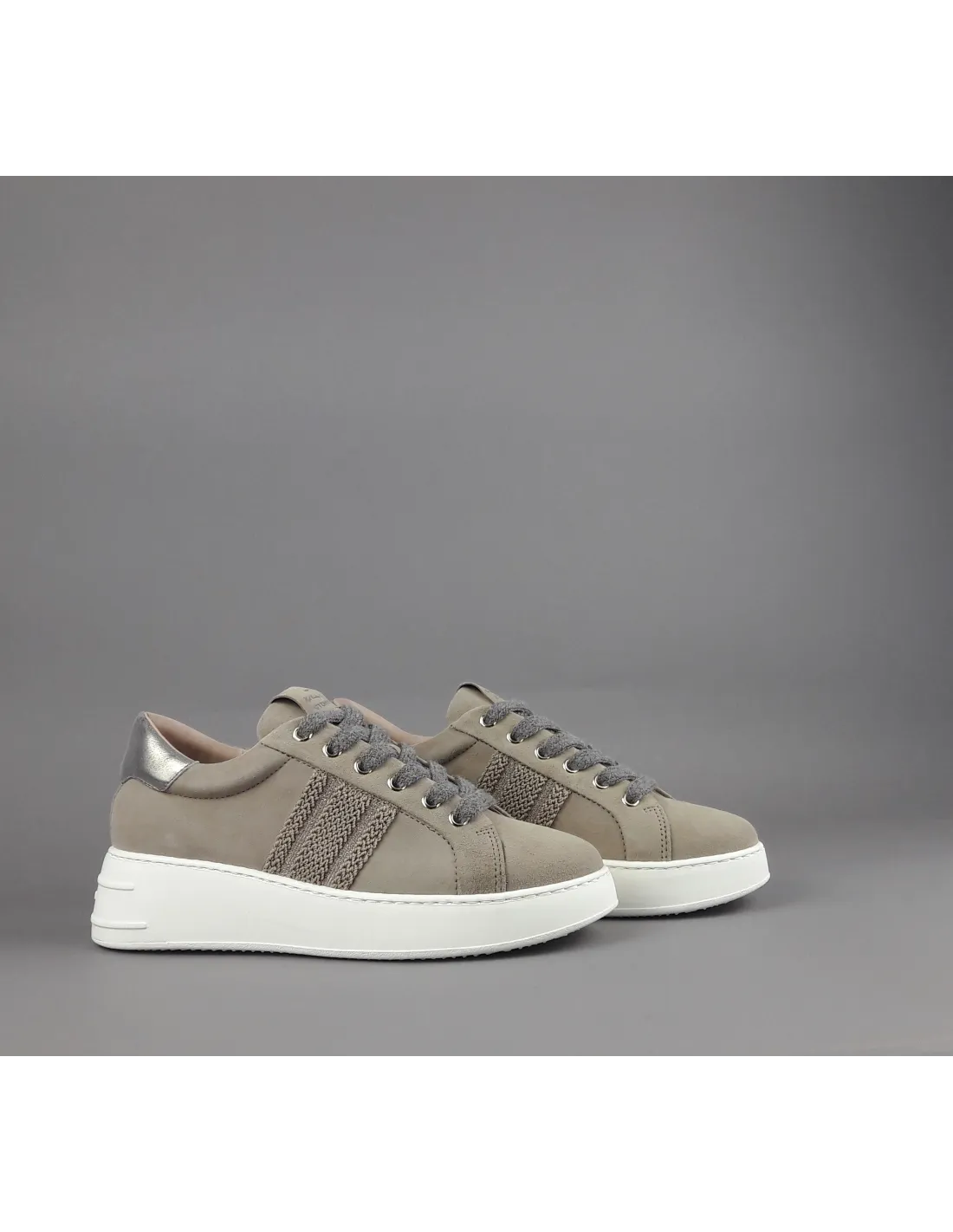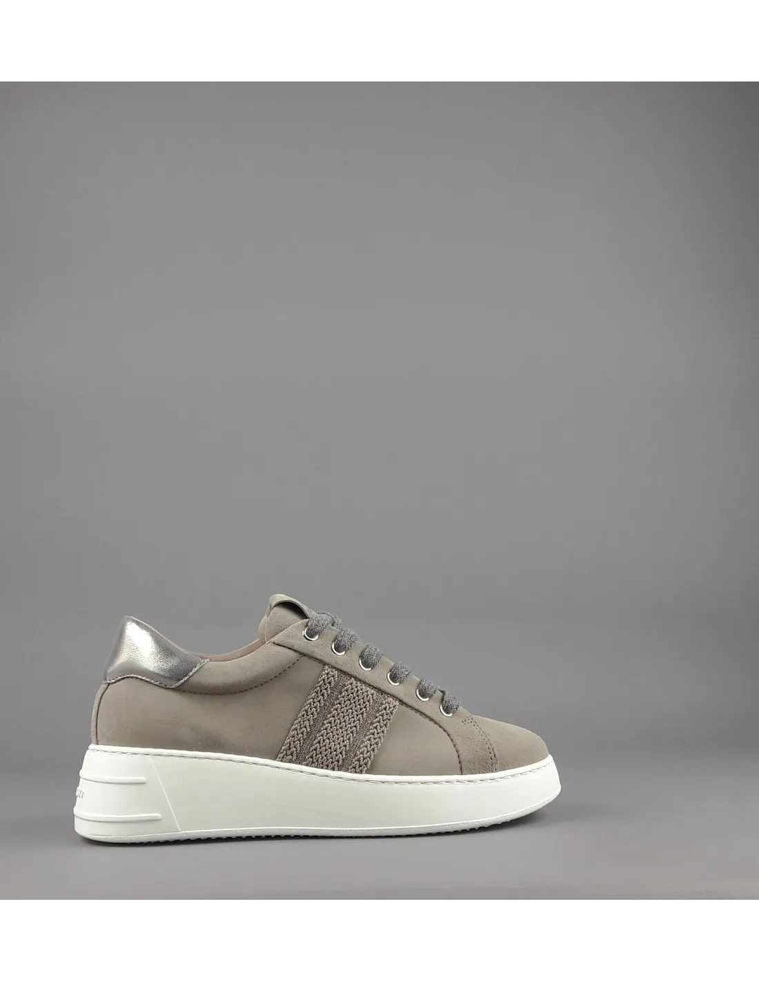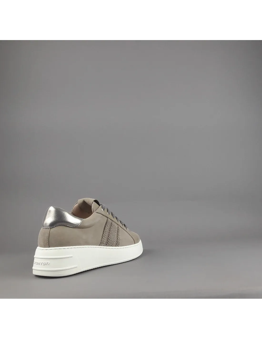 Collezione invernale, sneakers donna Stokton, in camoscio talpa, dettagli laterali cuciti, spoiler tallone in pelle metal platino, fussbett estraibile, fondo gomma 5 cm.