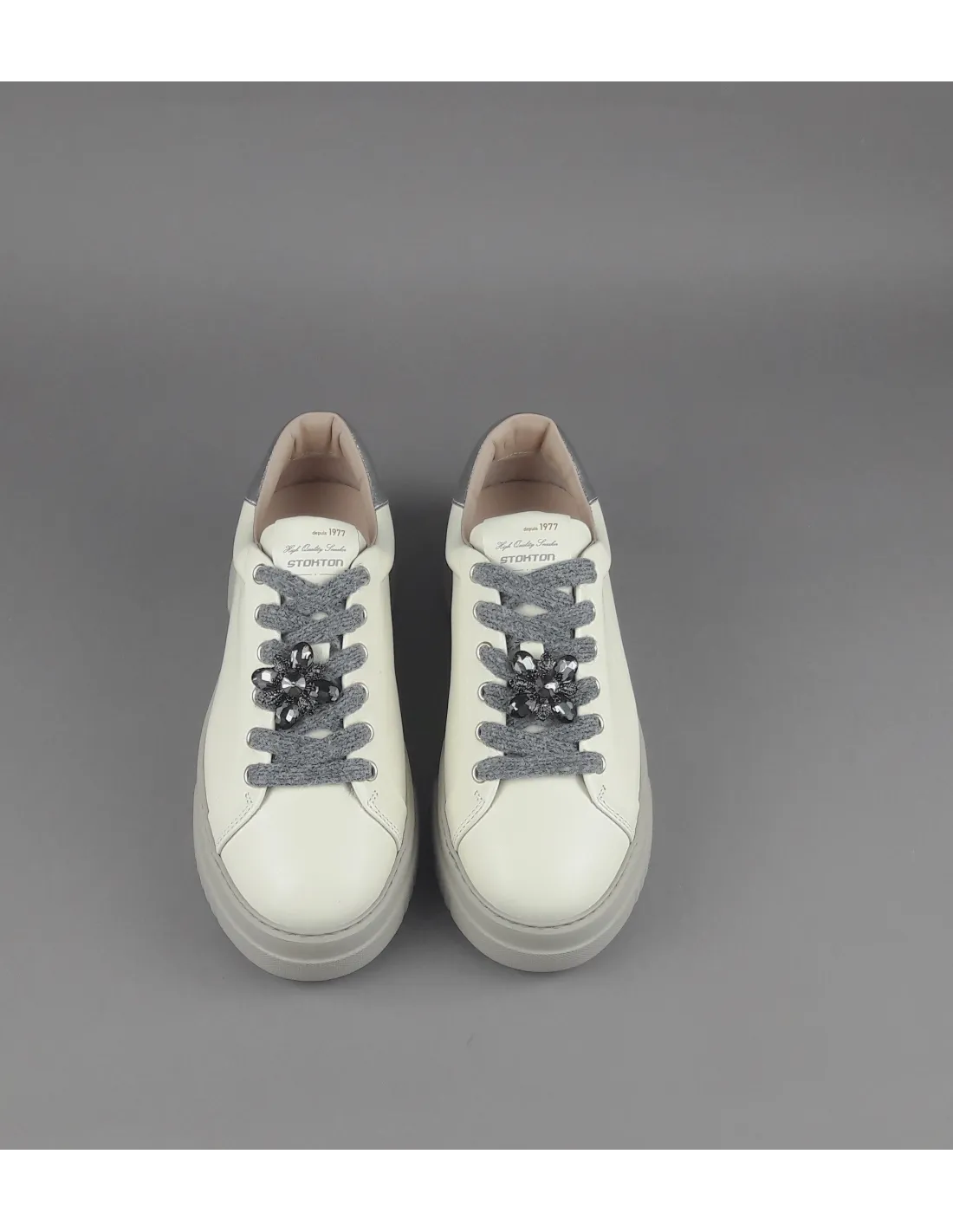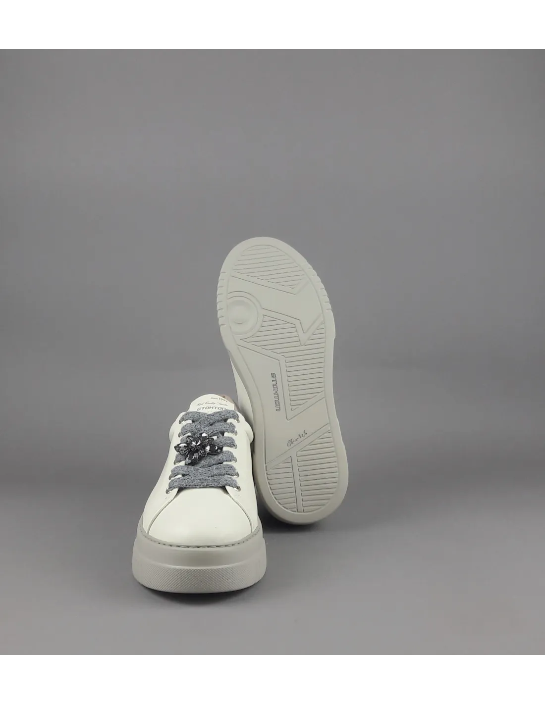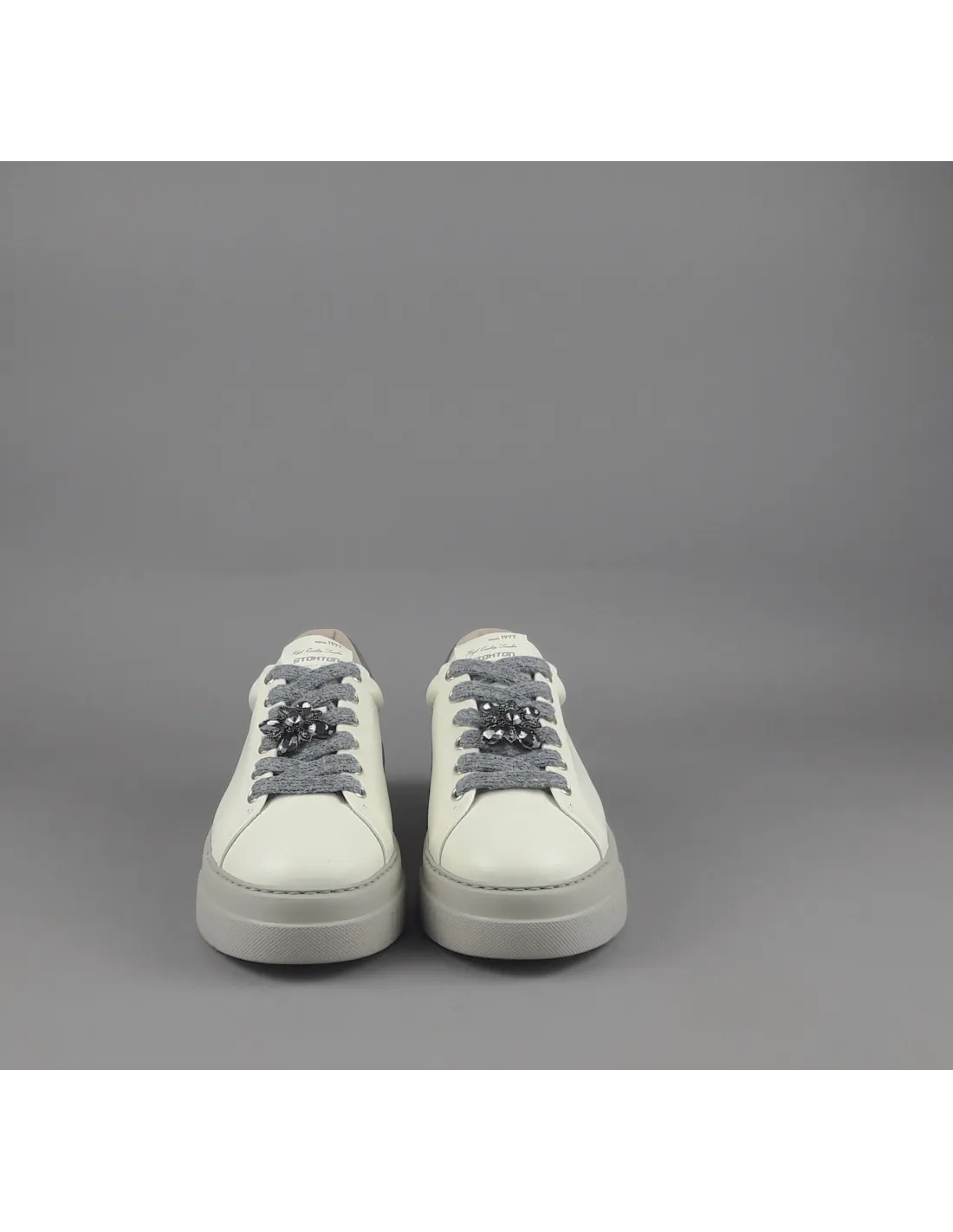 Collezione invernale, sneakers donna Stokton, in pelle avorio, lacci in lana, charms grigio, spoiler tallone in pelle metal platino, fussbett estraibile, fondo gomma 5 cm.