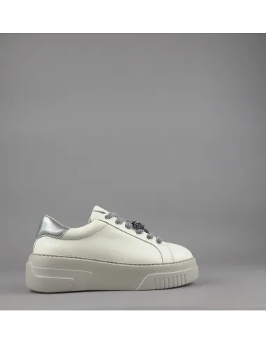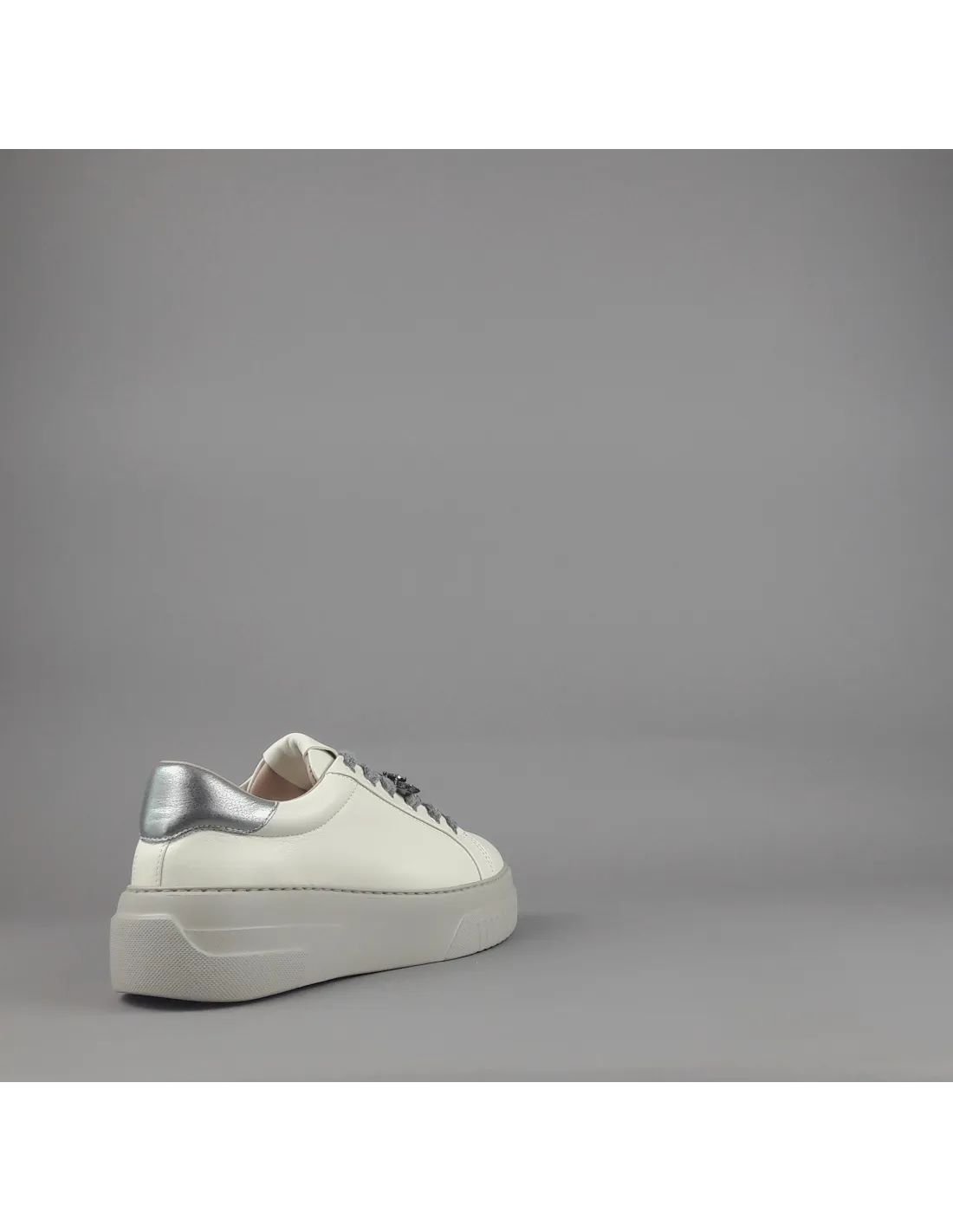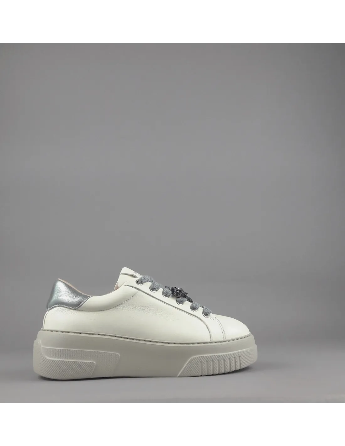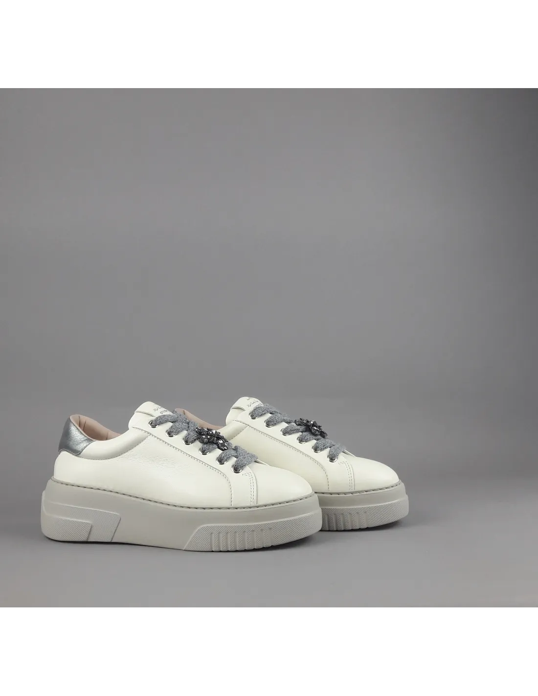 Collezione invernale, sneakers donna Stokton, in pelle avorio, lacci in lana, charms grigio, spoiler tallone in pelle metal platino, fussbett estraibile, fondo gomma 5 cm.