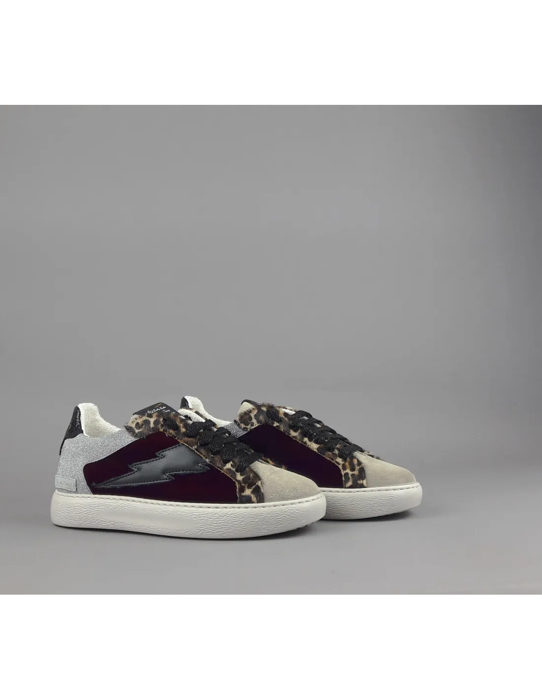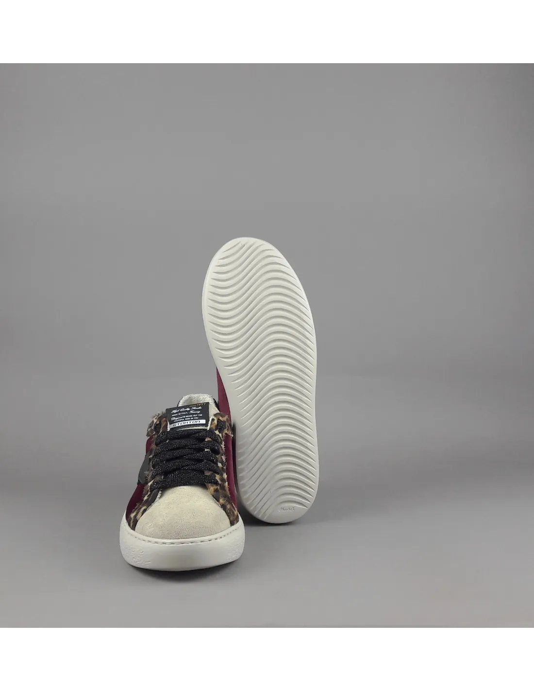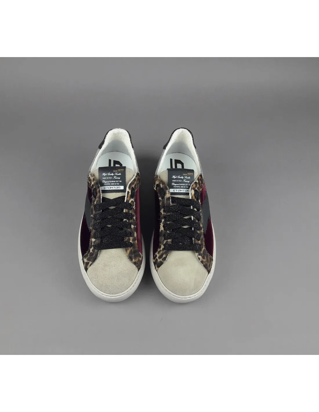Collezione invernale, sneakers donna Stokton, in velluto bordeaux, saetta laterale in pelle nero, lacci con lurex nero, inserti al tallone in tessuto shiny argento, dettagli animalier e puntale in camoscio, fussbett estraibile, fondo gomma 3 cm.