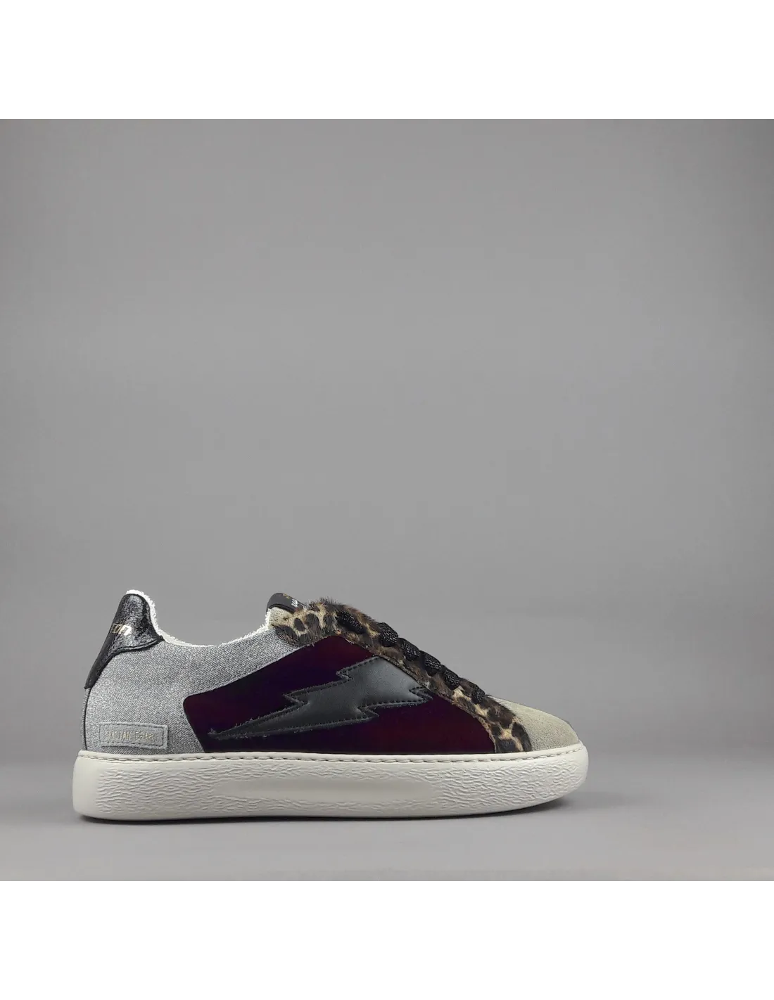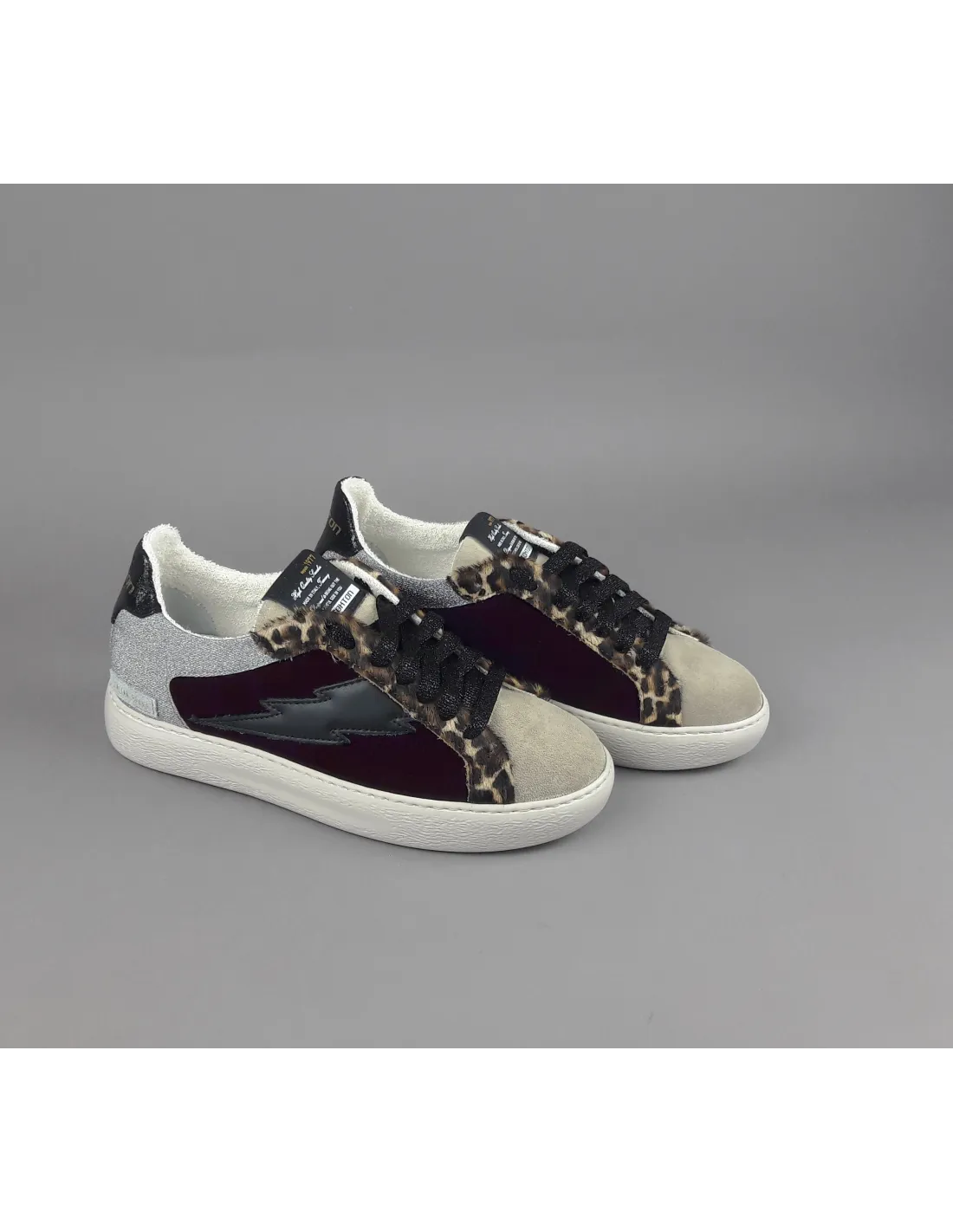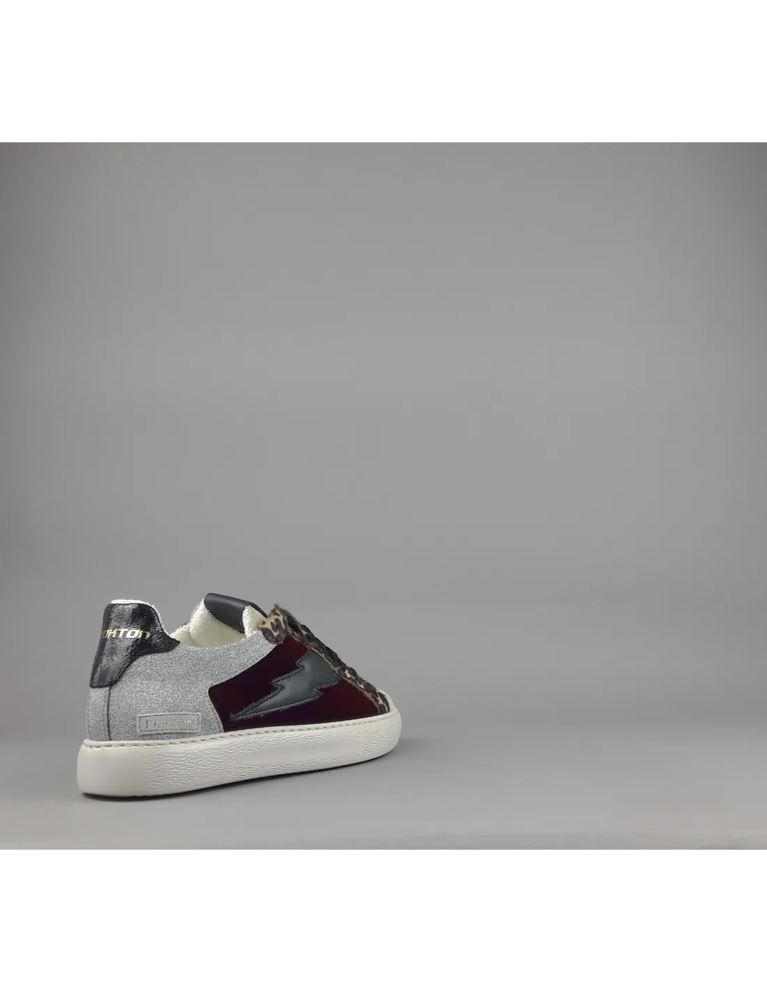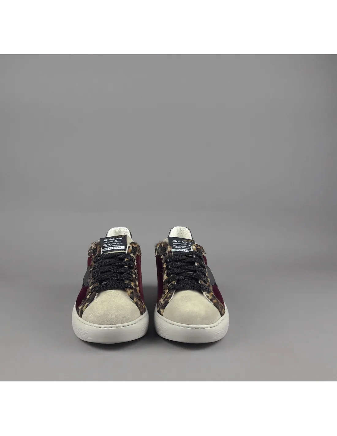 Collezione invernale, sneakers donna Stokton, in velluto bordeaux, saetta laterale in pelle nero, lacci con lurex nero, inserti al tallone in tessuto shiny argento, dettagli animalier e puntale in camoscio, fussbett estraibile, fondo gomma 3 cm.