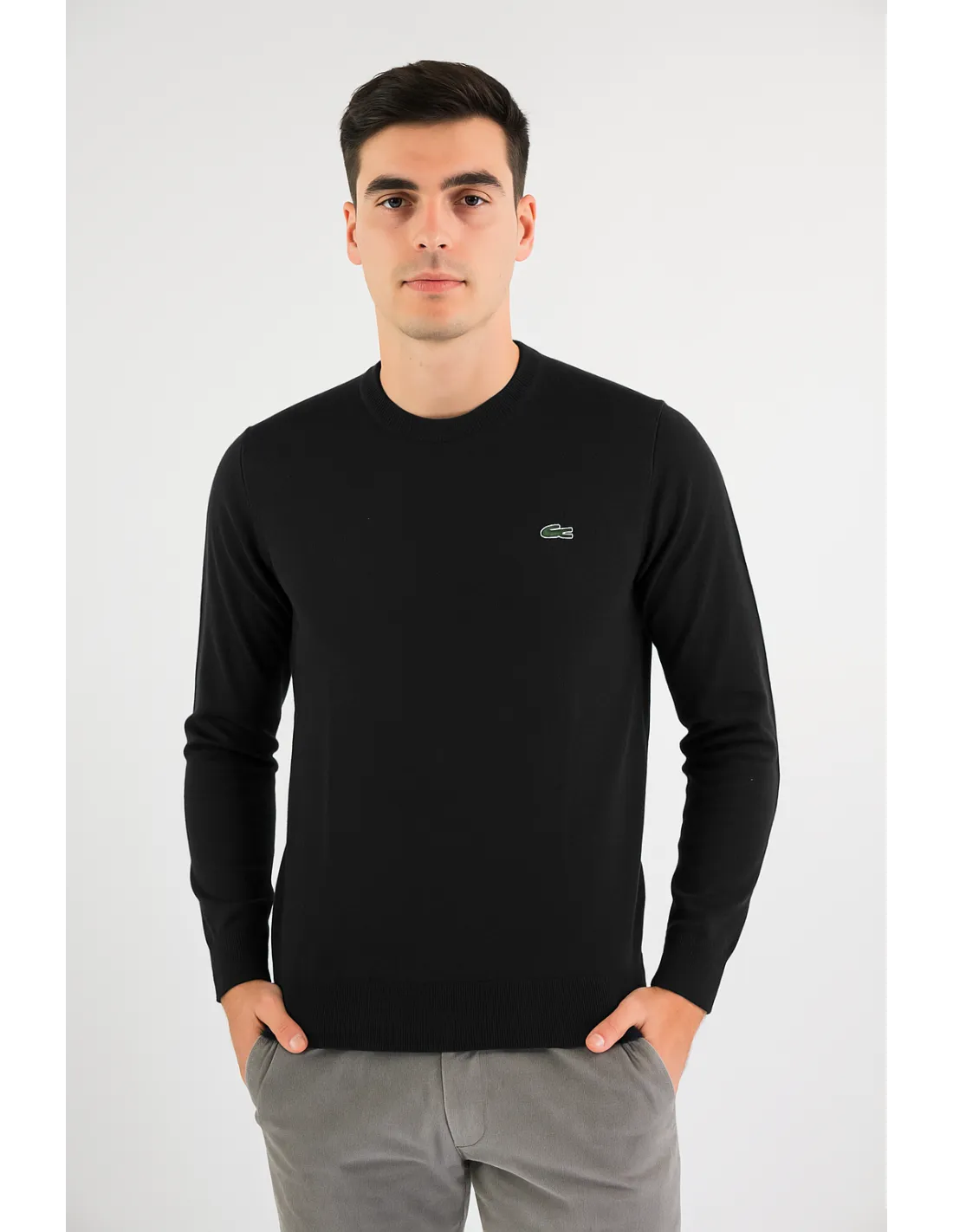 Collezione invernale, maglia pullover uomo in misto lana, girocollo, fondo e maniche in costine, logo coccodrillo in contrasto