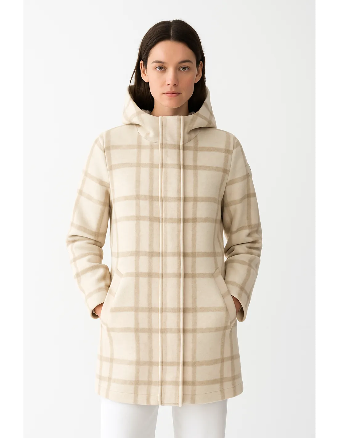 Collezione invernale, Cappotto donna in panno di lana accoppiato a tessuto tipo neoprene, fantasia tartan, Chiusura con zip doppio cursore e bottoni a pressione, cappuccio fisso, logo Colmar applicato