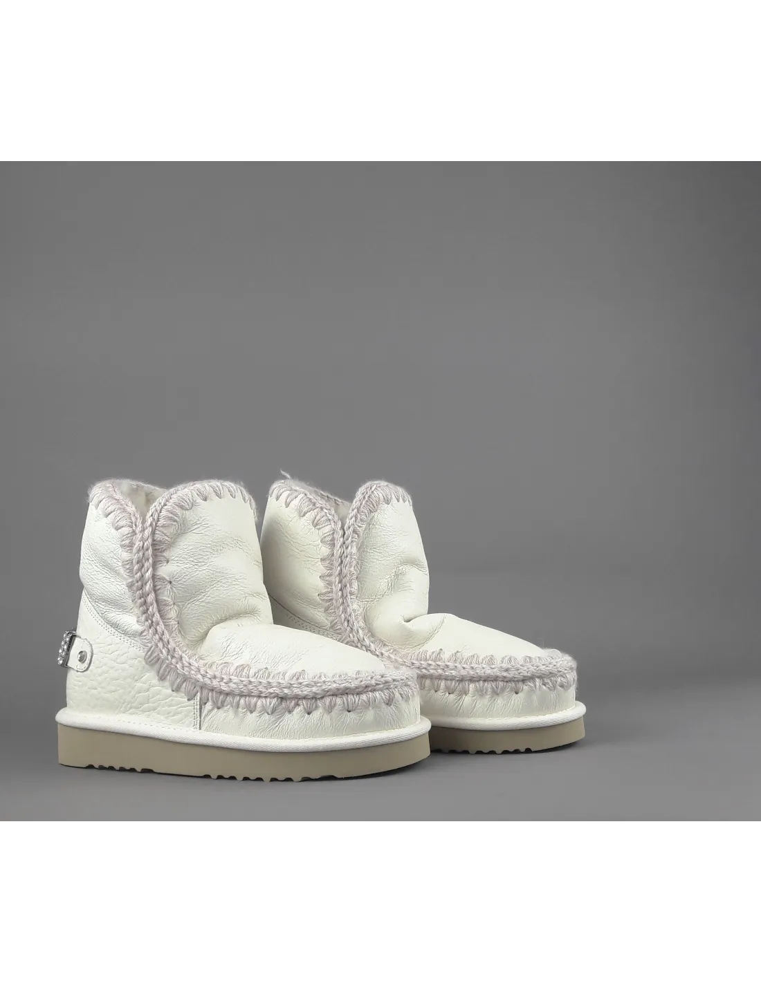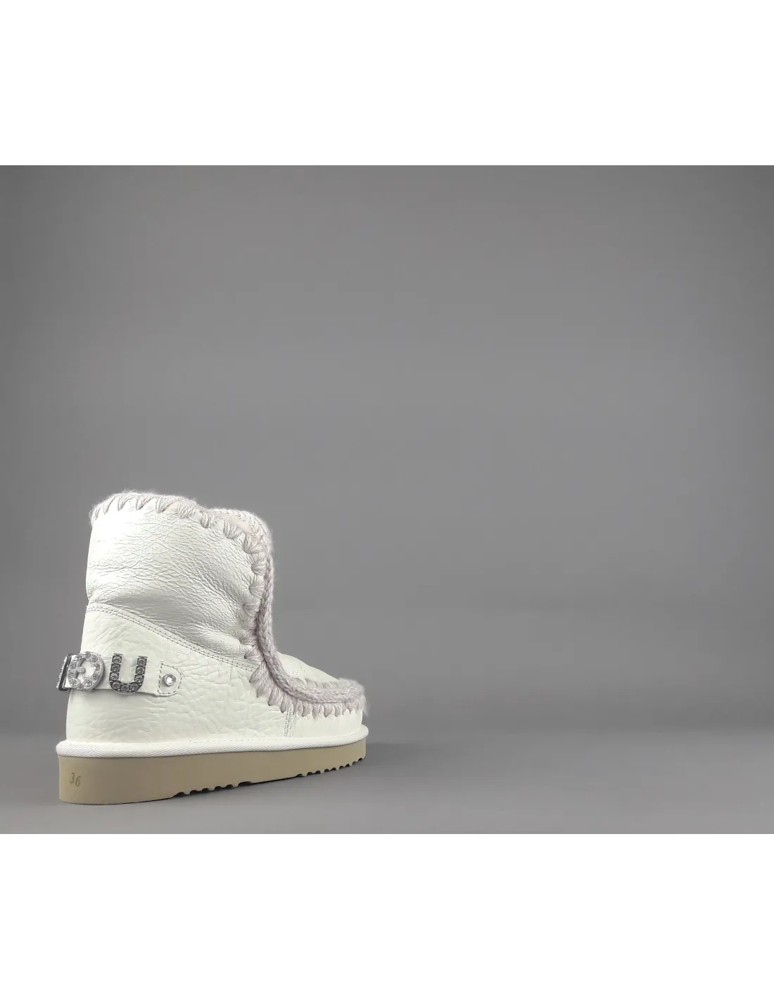 Collezione invernale, Mou eskimo 18 donna, montone double face effetto pelle lucida, logo in metallo posteriore con strass incastonati, dettagli all'uncinetto lavorati a mano, tallone rinforzato, altezza 18 cm, fondo gomma EVA.