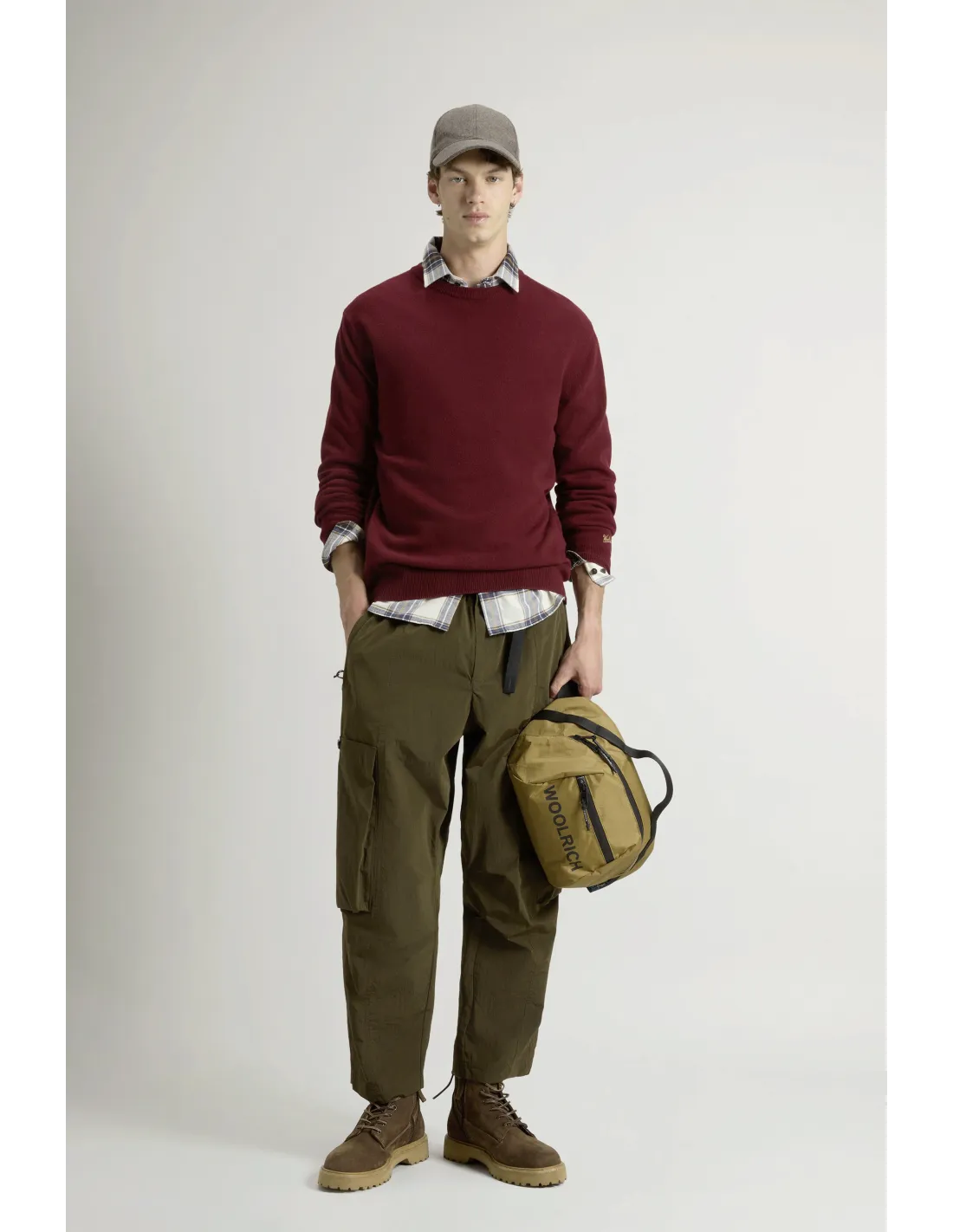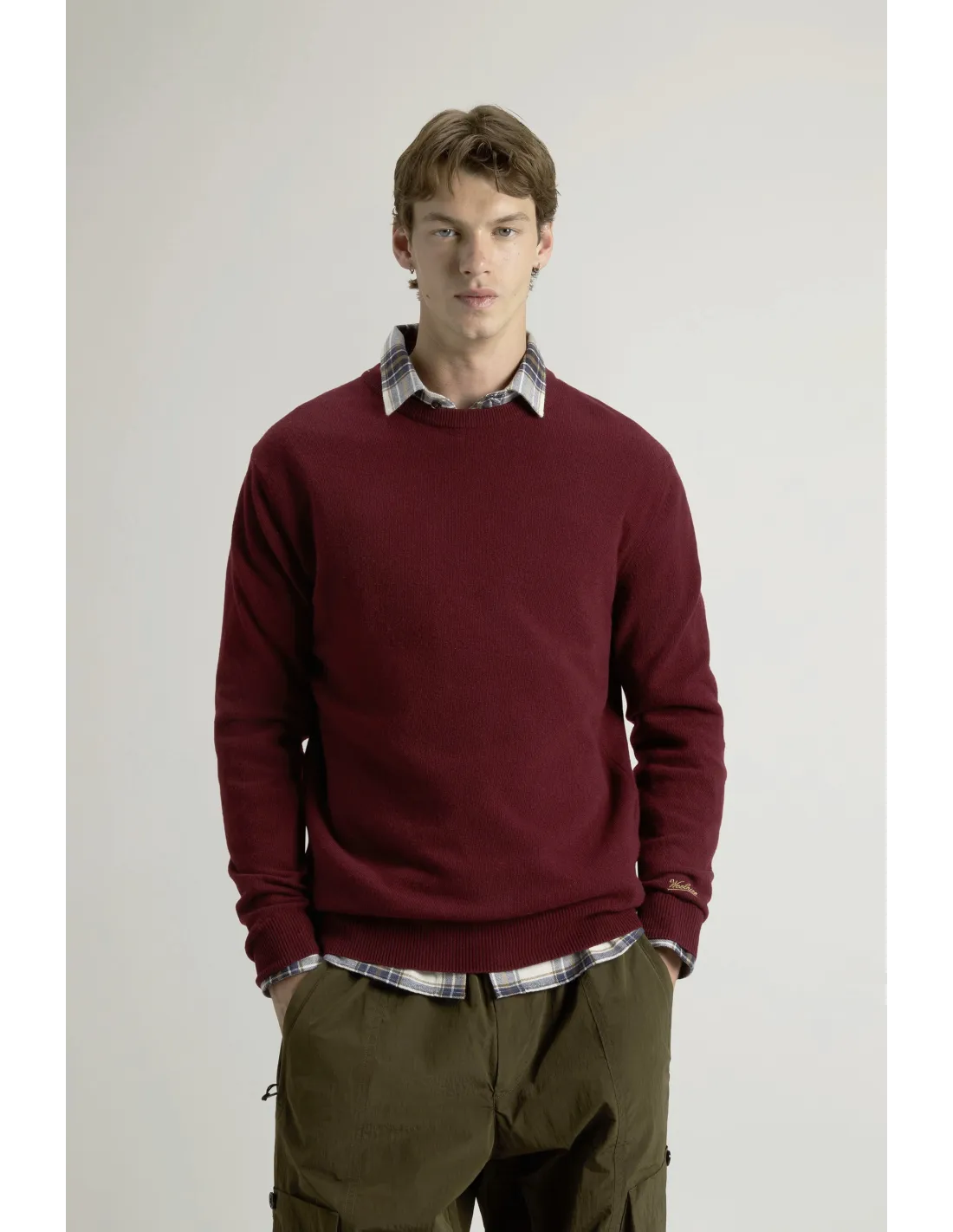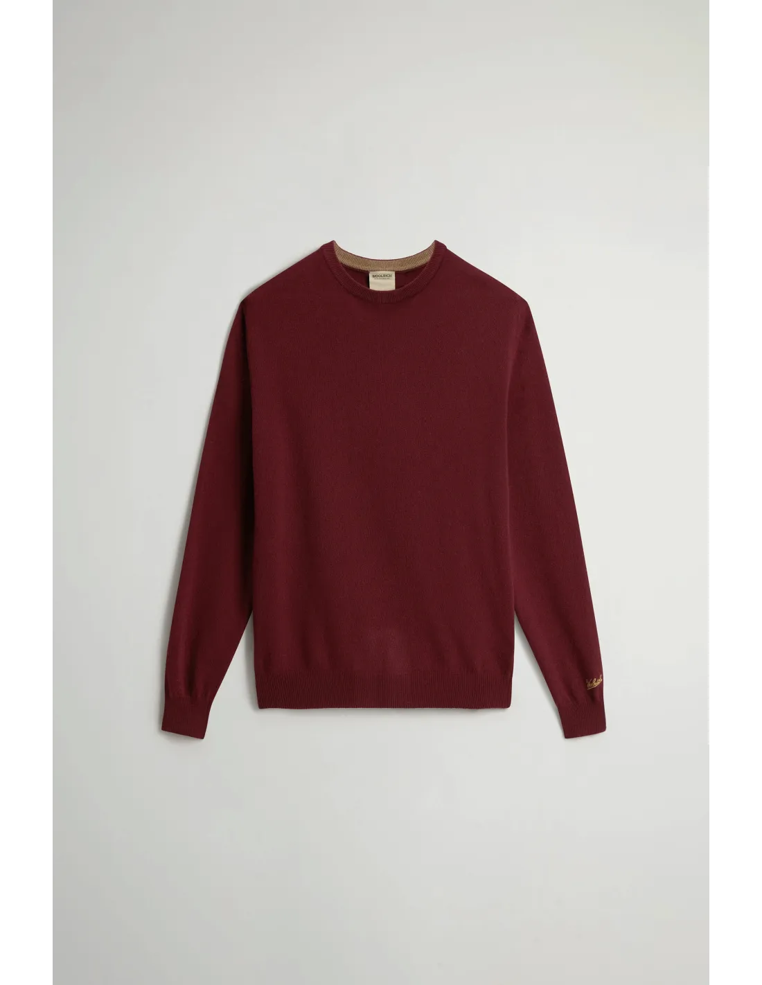 Collezione invernale, Maglione uomo girocollo in lana lambswool di agnello, girocollo e polsini a coste, logo Woolrich ricamato sulla manica.