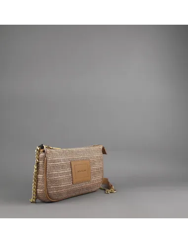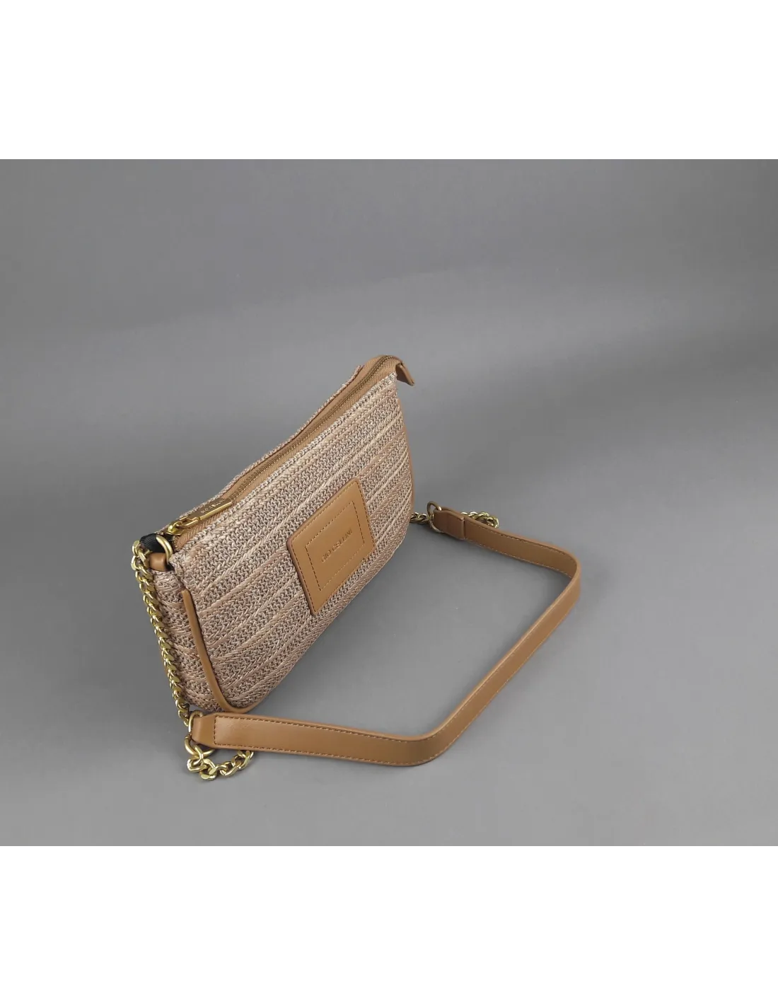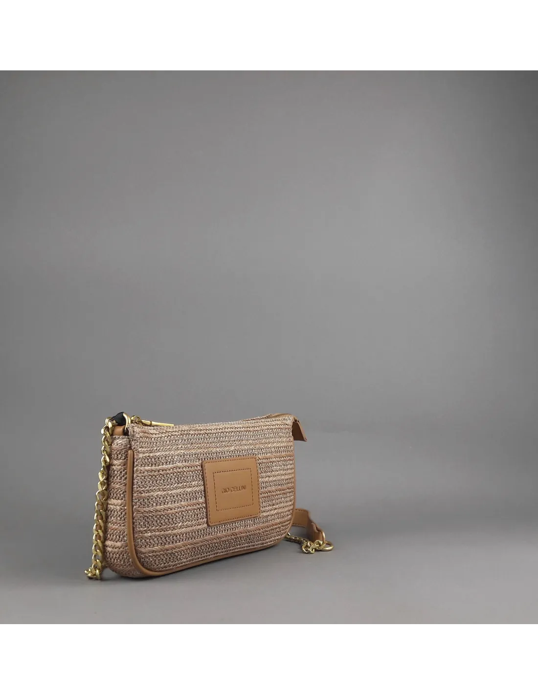 Gio Cellini collezione estiva, Borsa a spalla piccola donna in rafia con dettagli in poliuretano corda, tracolla sganciabile, chiusura con cerniera, logo frontale