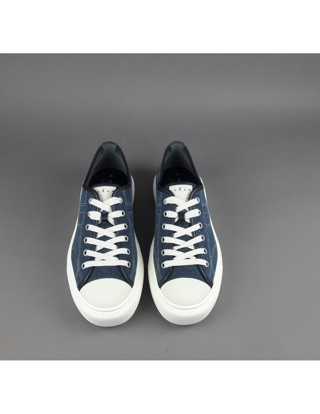 Hogan collezione estiva, sneakers hogan uomo h691, in tessuto denim, h cucita, dettagli in pelle, fussbett in memory foam, fondo gomma.