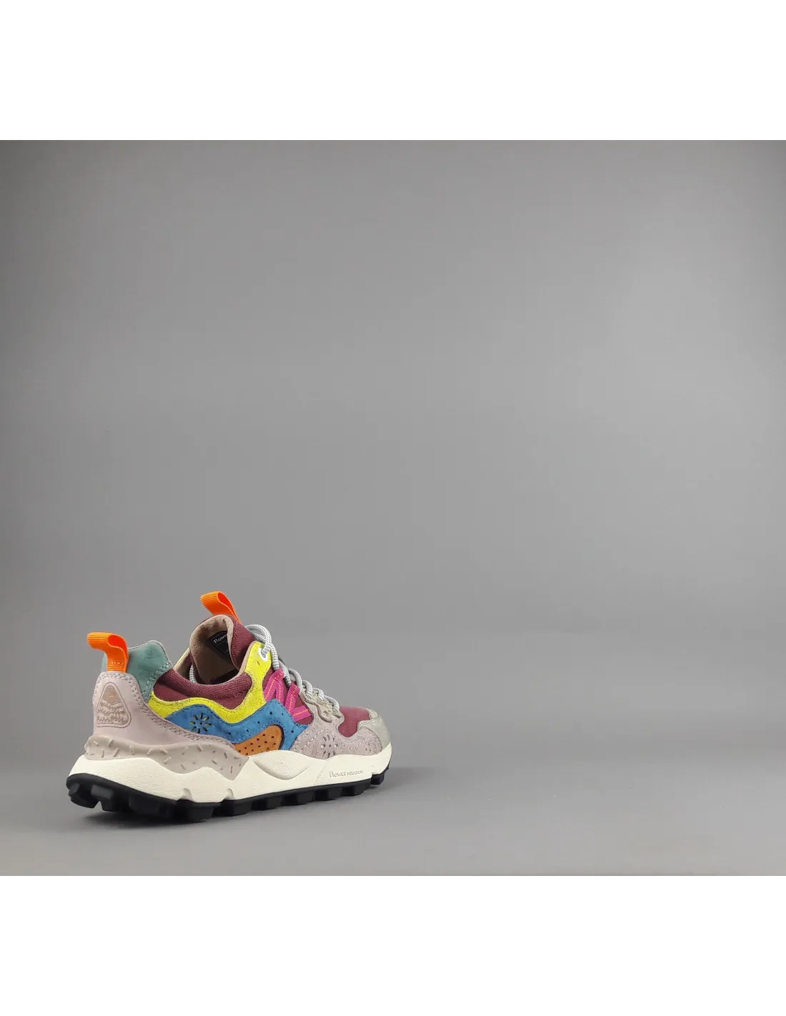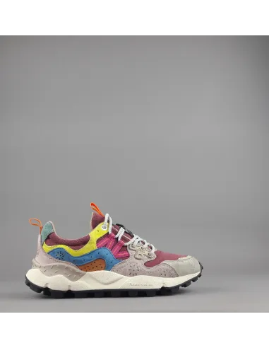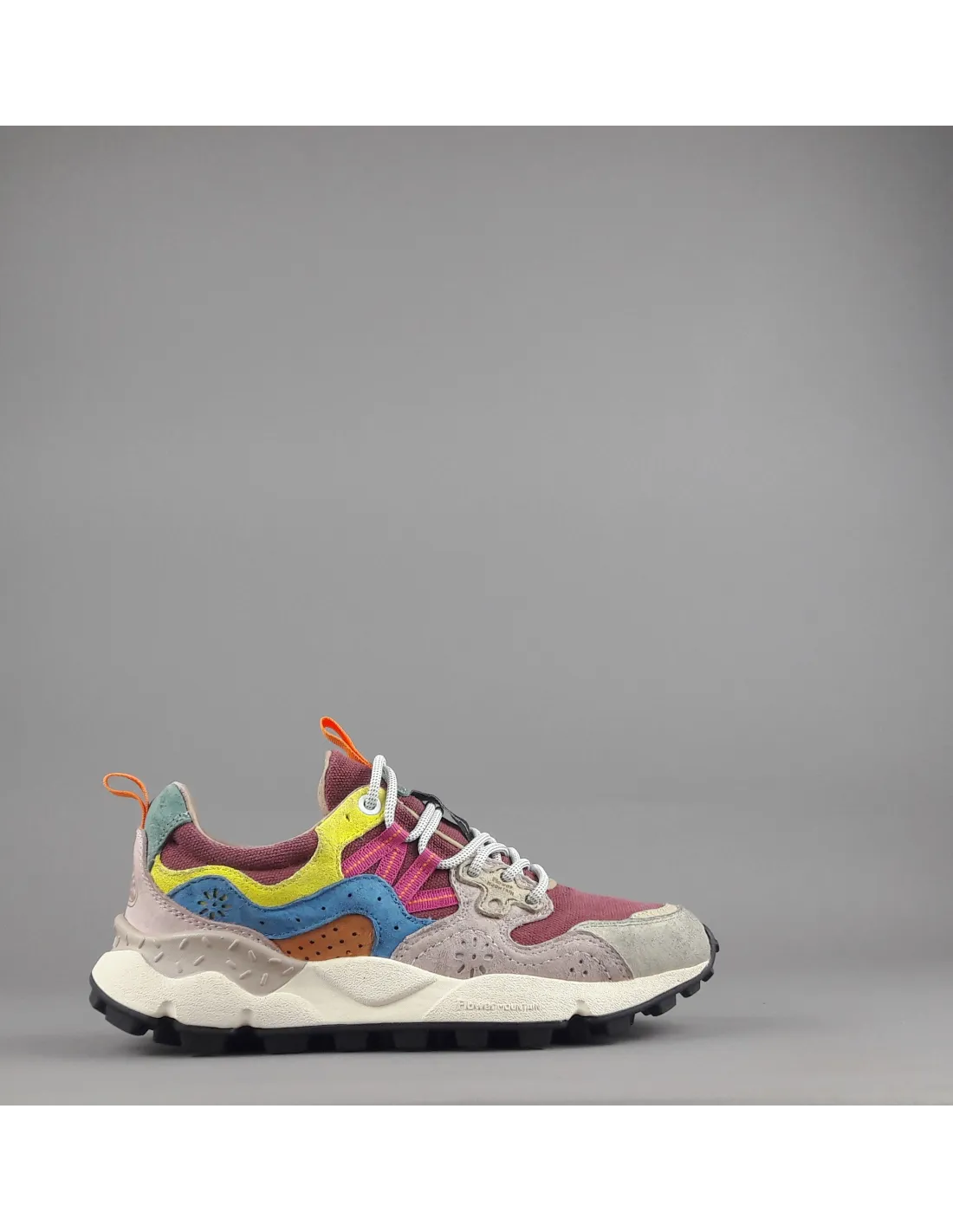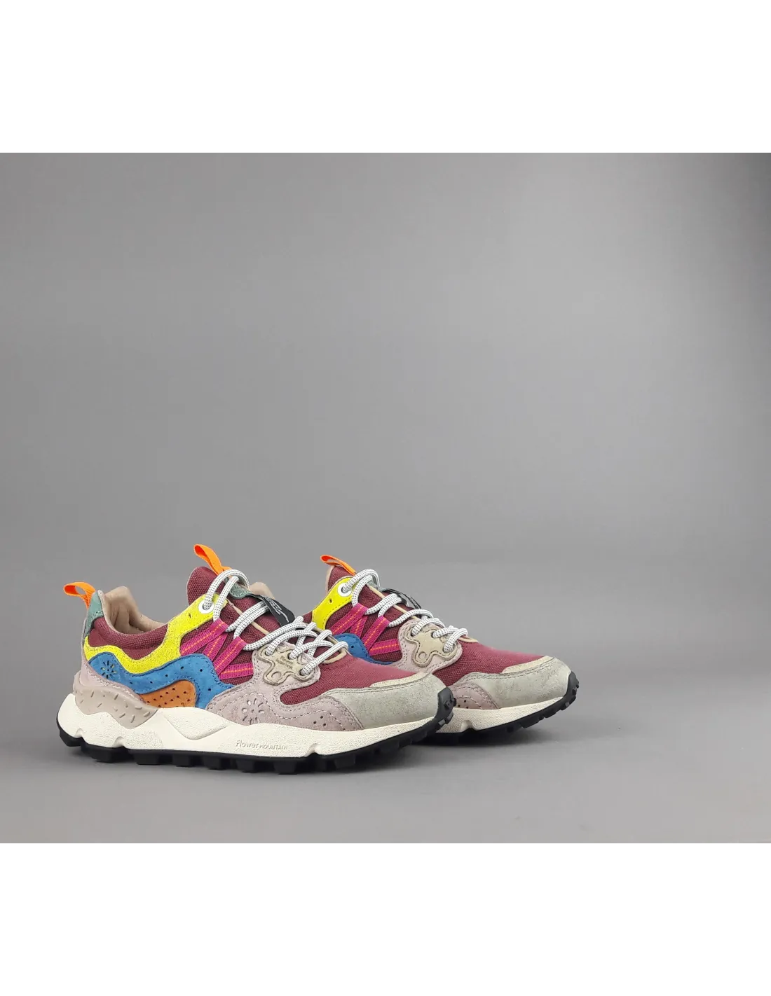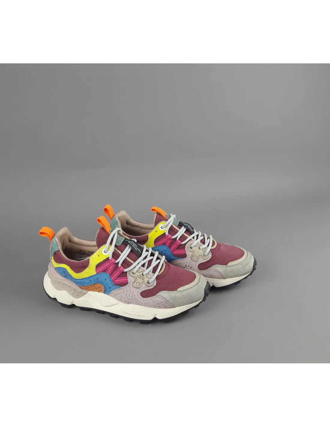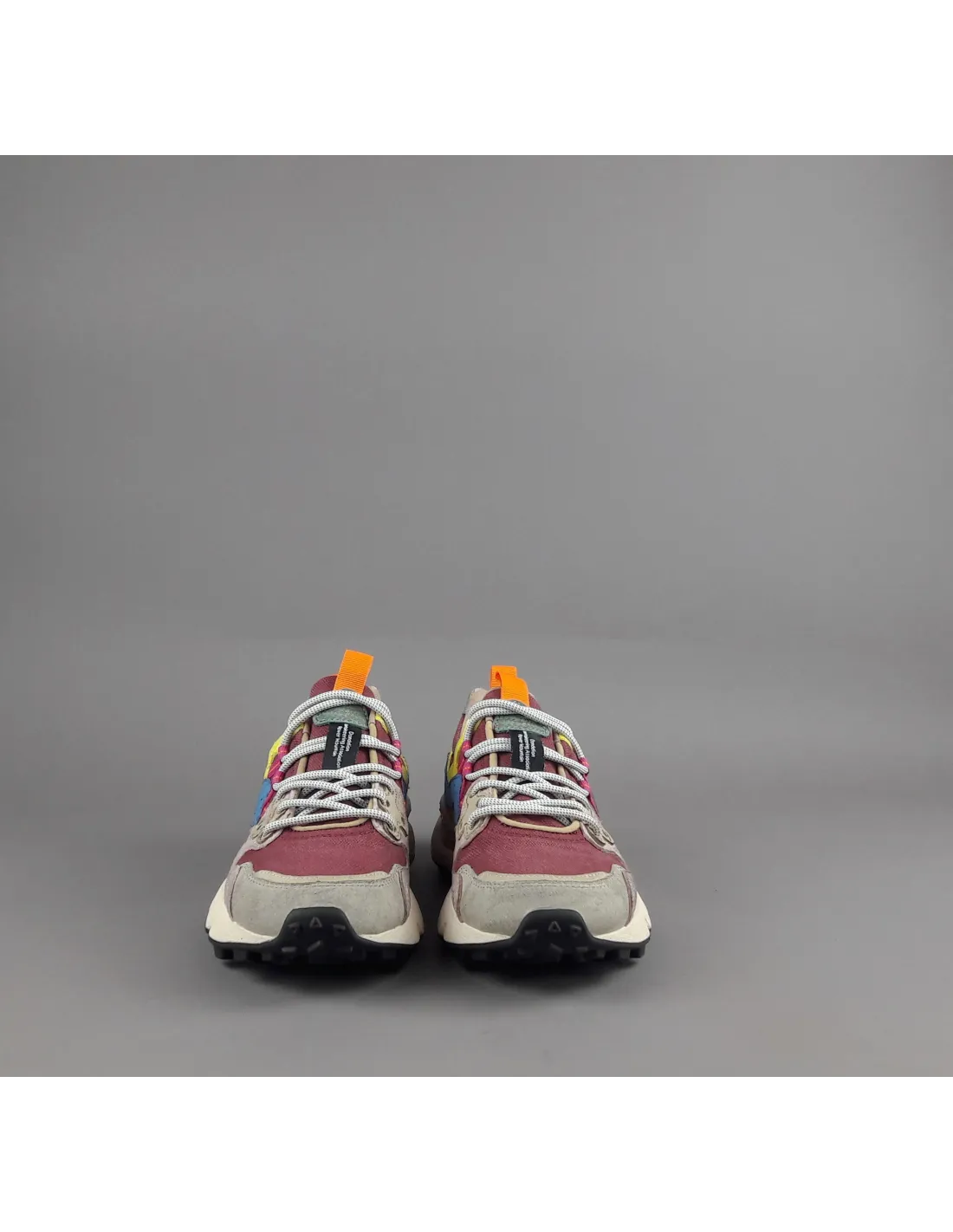 Collezione estiva, sneakers donna yamano 3, in camoscio multicolor con inserti in tela bordeaux, logo laterale in contrasto, spoiler tallone in contrasto, sottopiede estraibile in sughero, fondo gomma