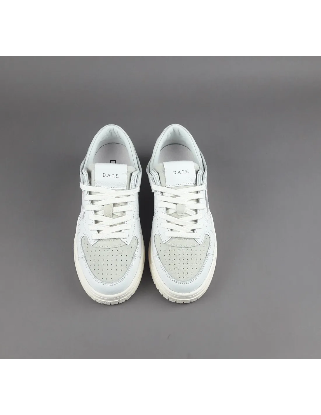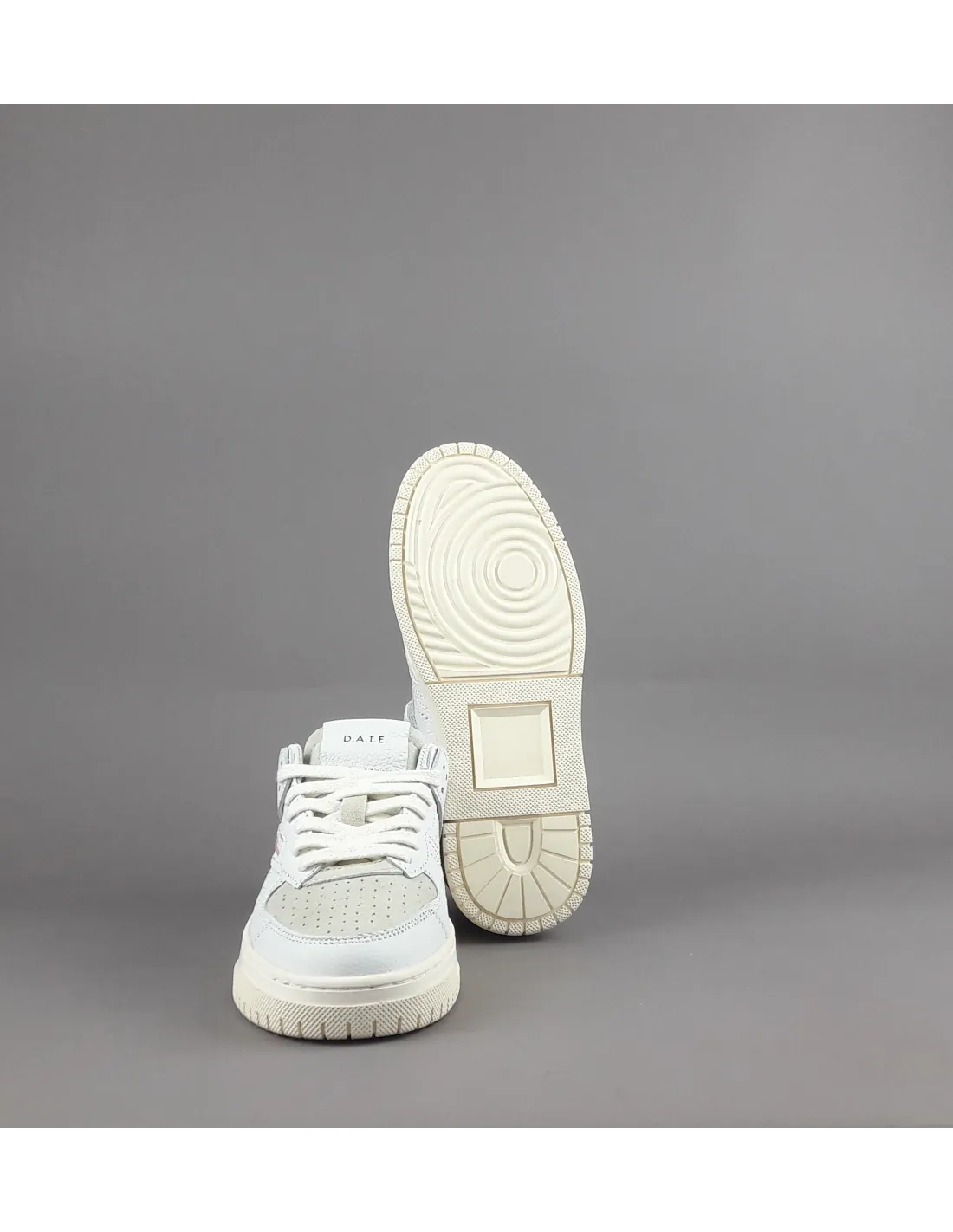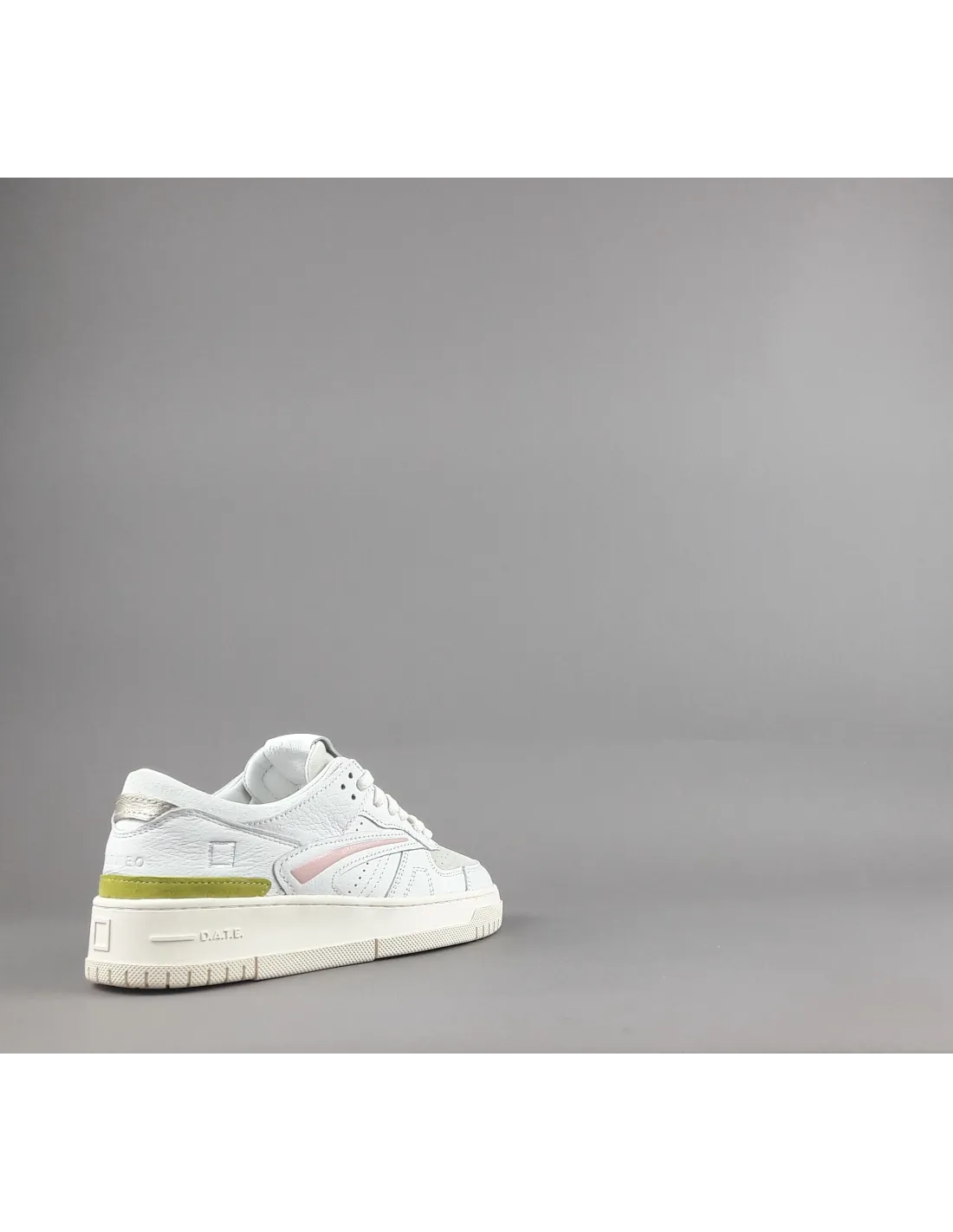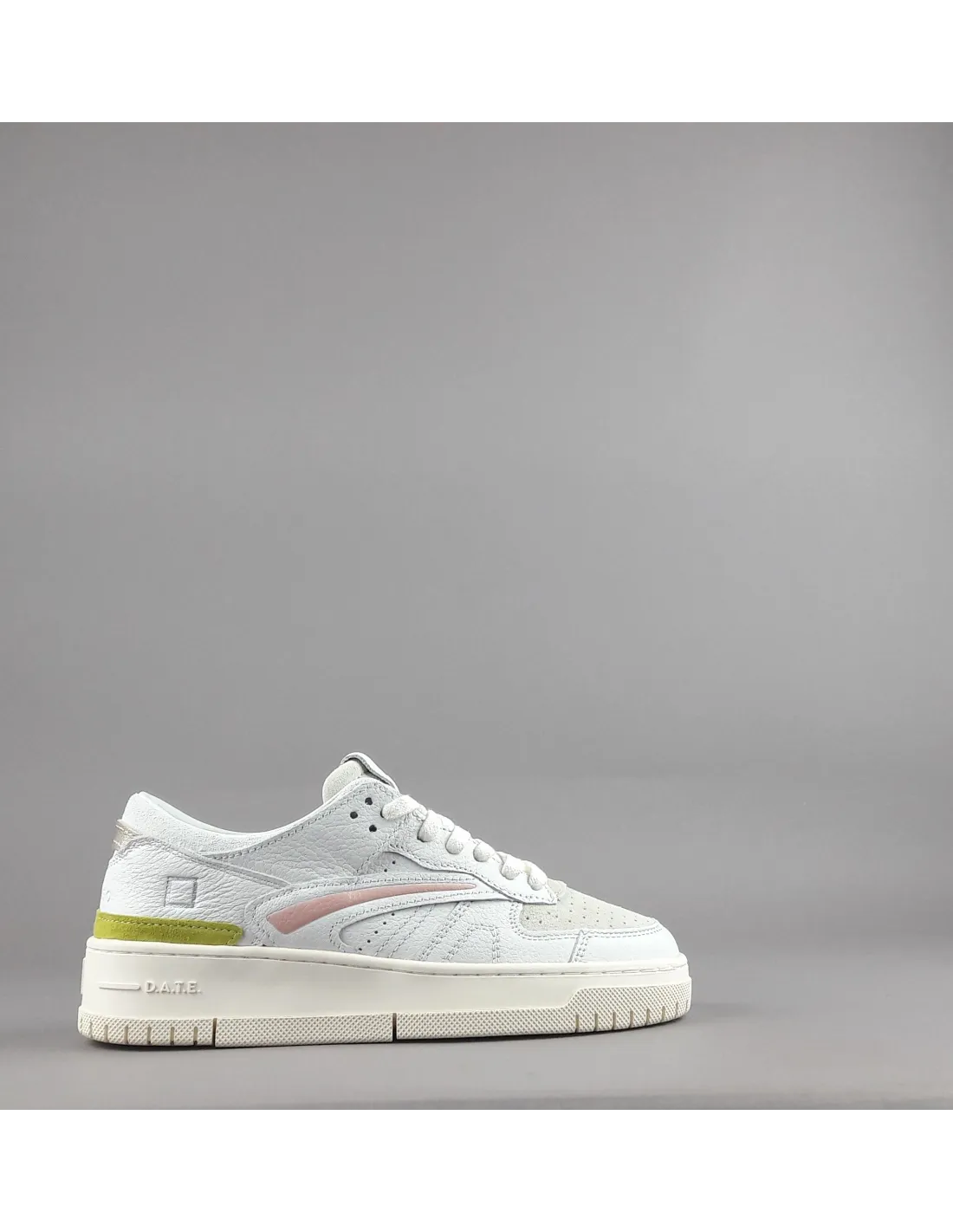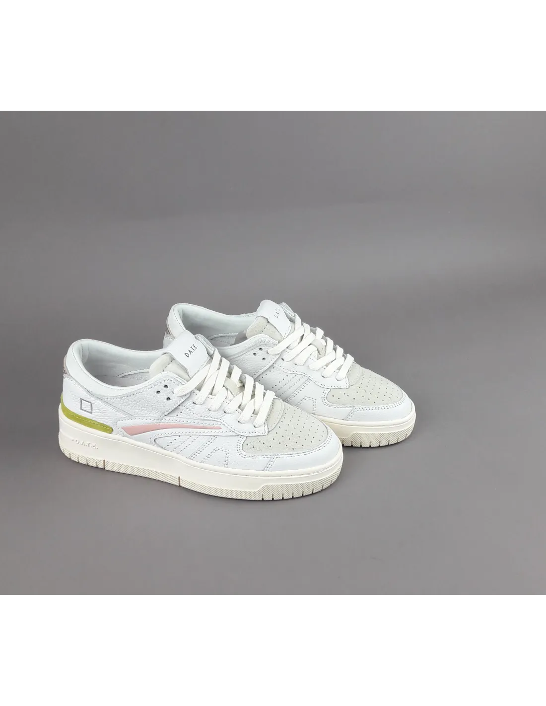 D.A.T.E. collezione estiva, Sneakers donna TORNEO in pelle, dettagli spoiler in camoscio, baffo laterale in pelle rosa, puntale in camoscio forato, logo impresso sul lato del tallone, soletta interna estraibile di 2.5 cm, calzata regolare, suola in gomma cucita 4 cm.