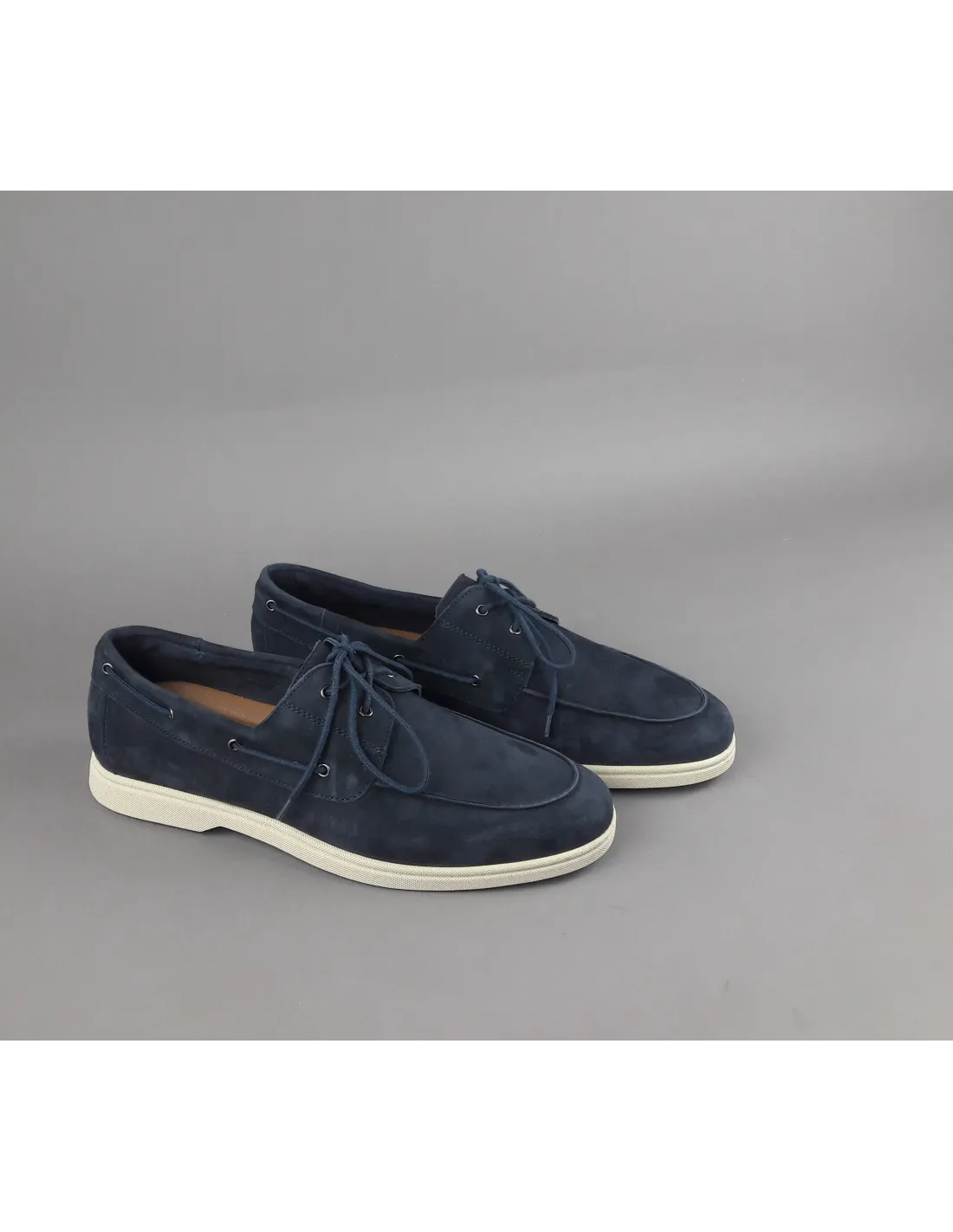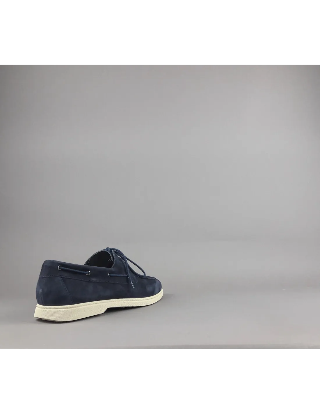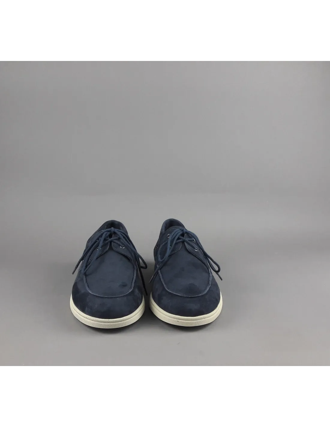 Frau collezione estiva, mocassino da barca uomo in camoscio blu, made in Ilaly, sfoderato con sottopiede foderato in pelle, laccio in cotone e vaschetta cucita, suola in gomma, vestibilità regolare.