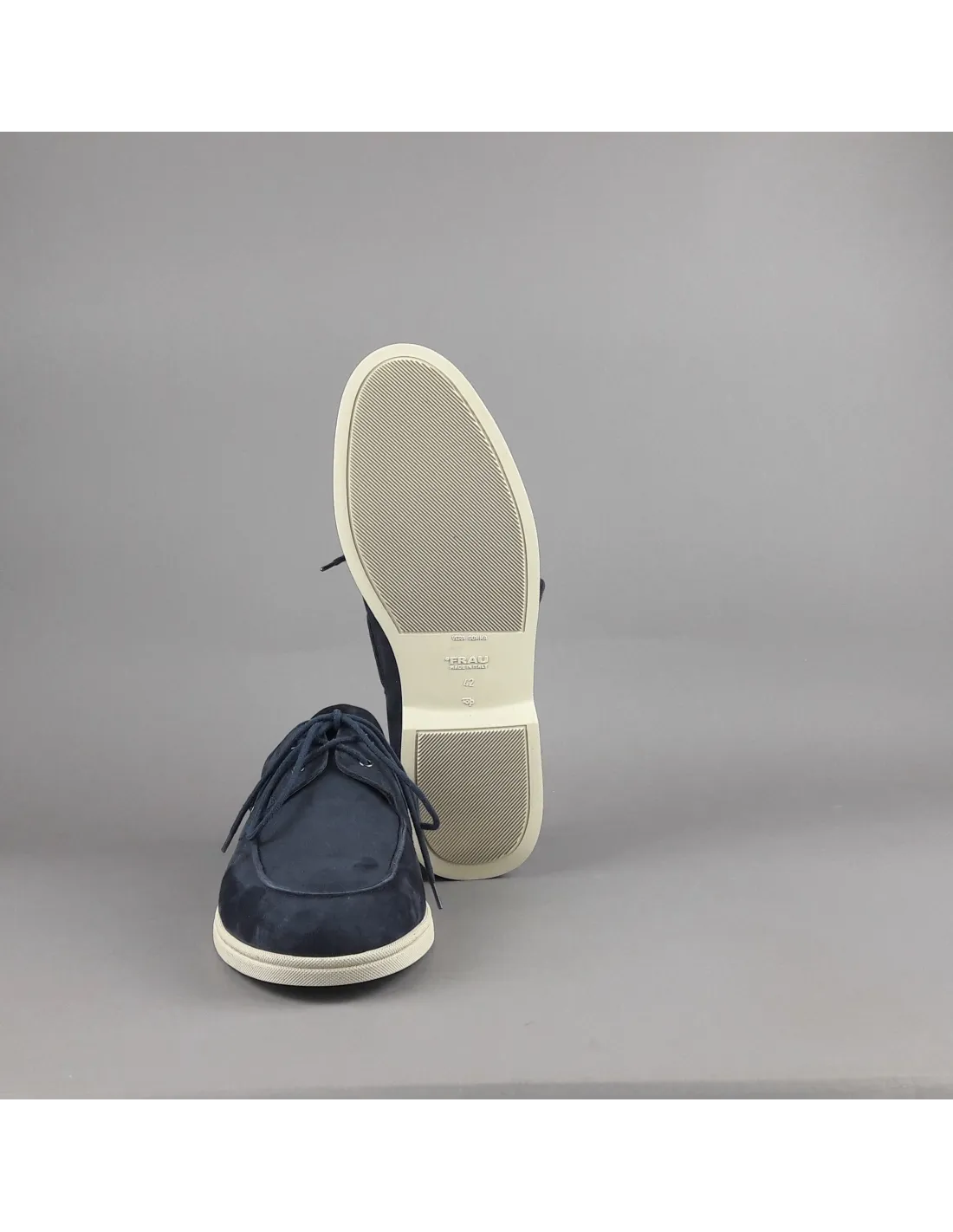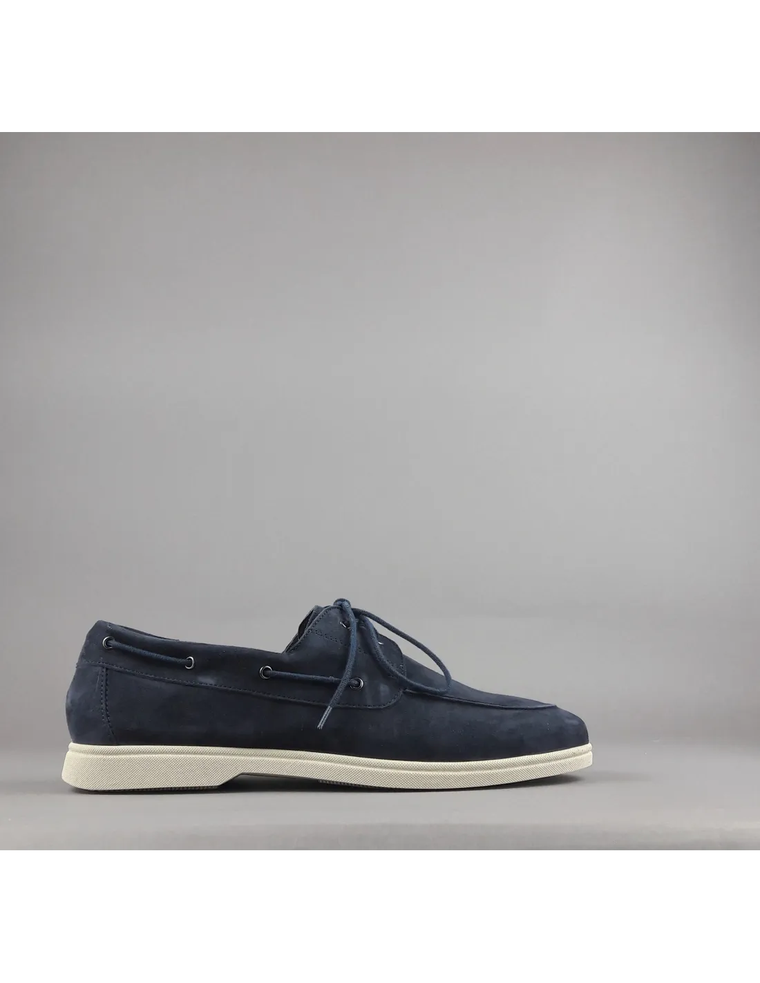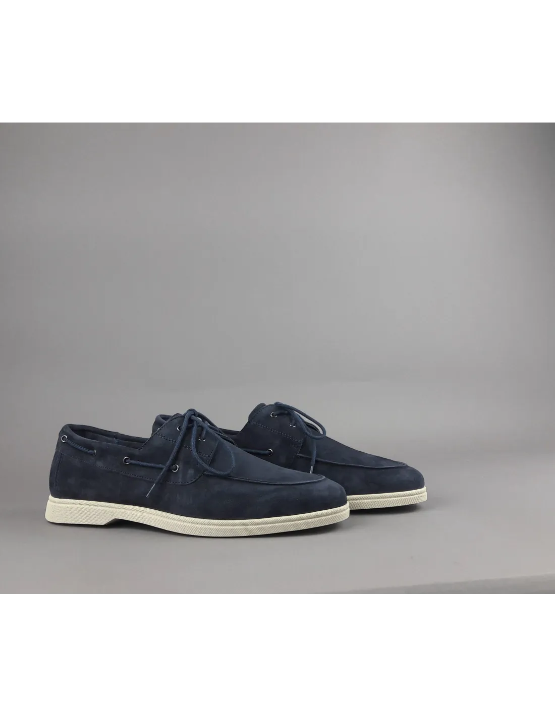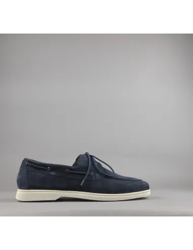 Frau collezione estiva, mocassino da barca uomo in camoscio blu, made in Ilaly, sfoderato con sottopiede foderato in pelle, laccio in cotone e vaschetta cucita, suola in gomma, vestibilità regolare.