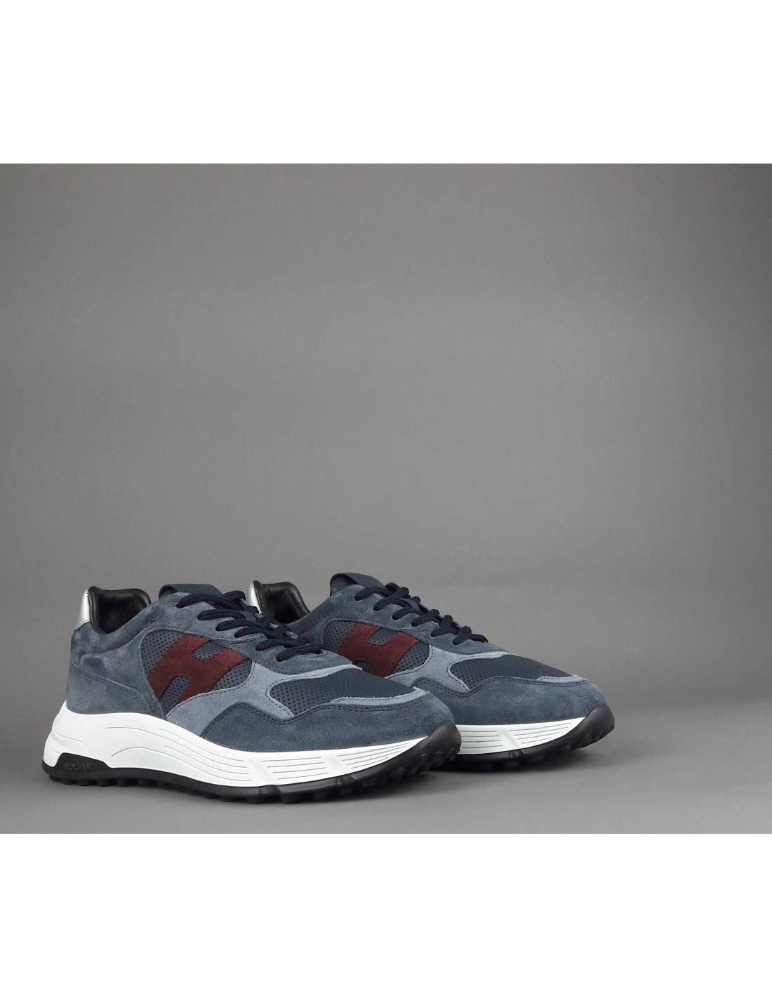 Collezione invernale, sneakers Hogan uomo Hyperlight in camoscio, inserti in pelle, h cucita in camoscio bordeaux, spoiler in pelle metal, fussbett in memory foam, suola in gomma