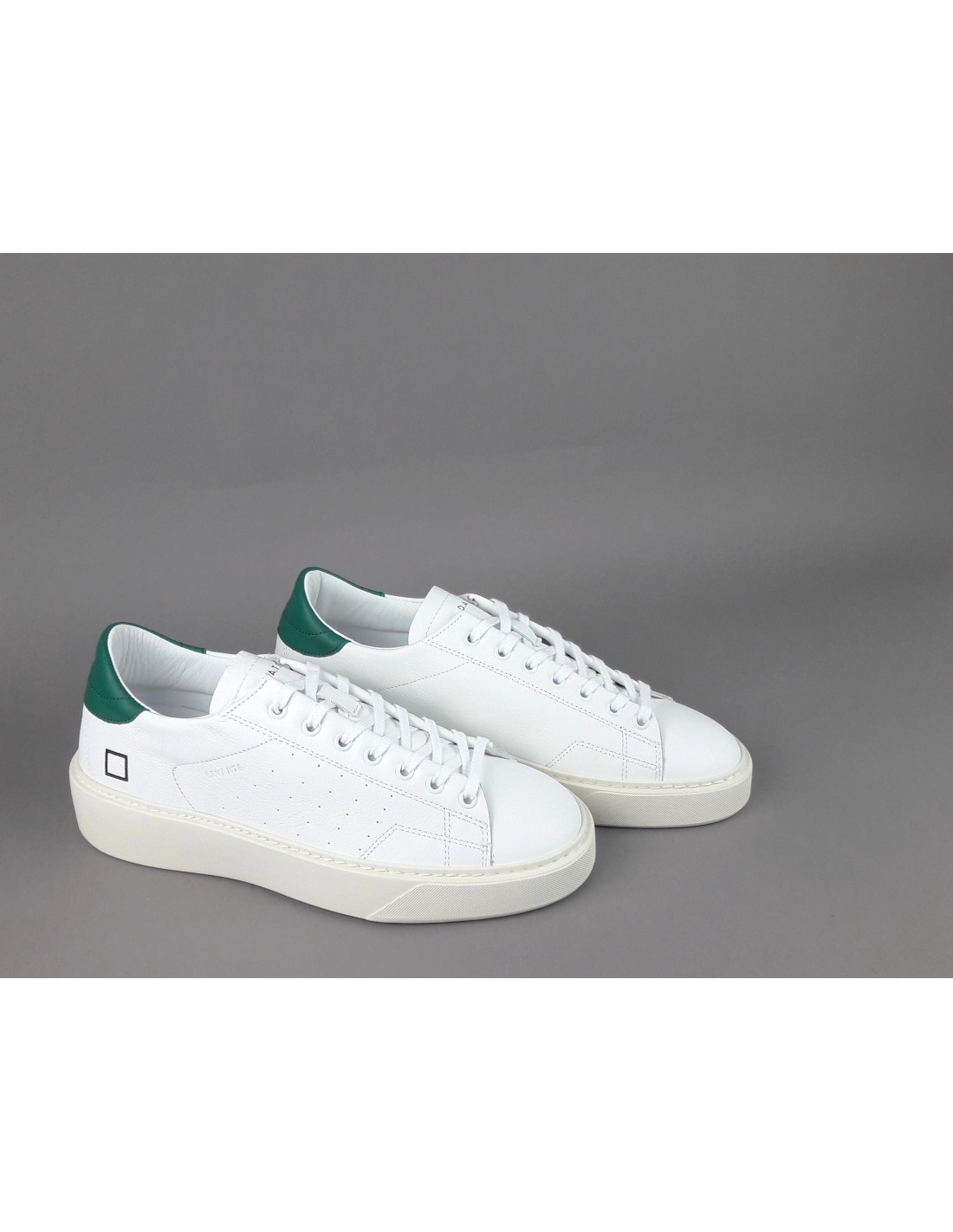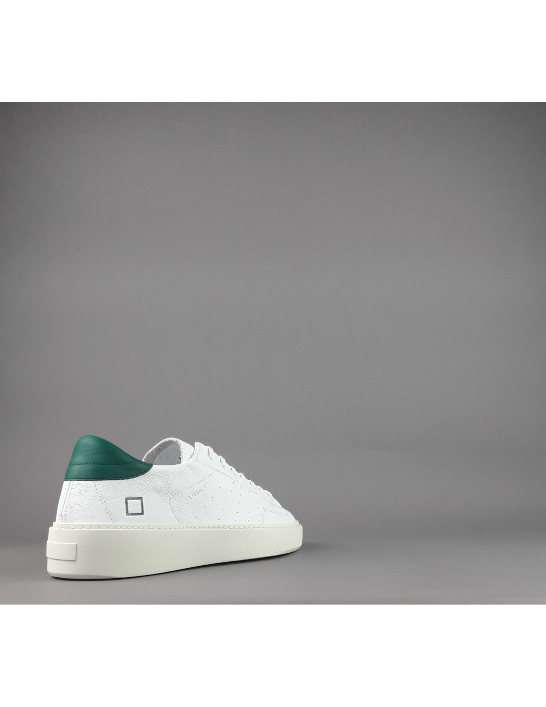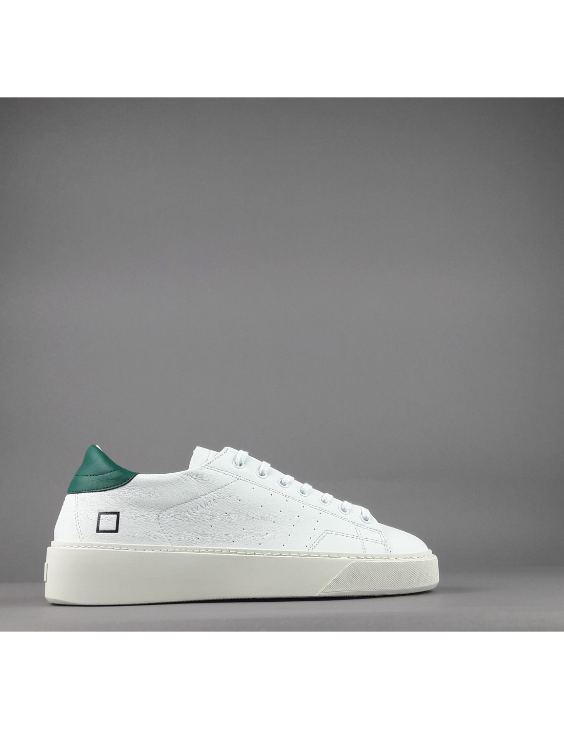 Collezione invernale, Sneakers uomo D.A.T.E. LEVANTE in pelle, forature leterali, logo impresso sulla linguetta, spoiler in pelle verde, soletta interna estraibile di 2.5 cm, calzata regolare, suola in gomma cucita 4 cm.