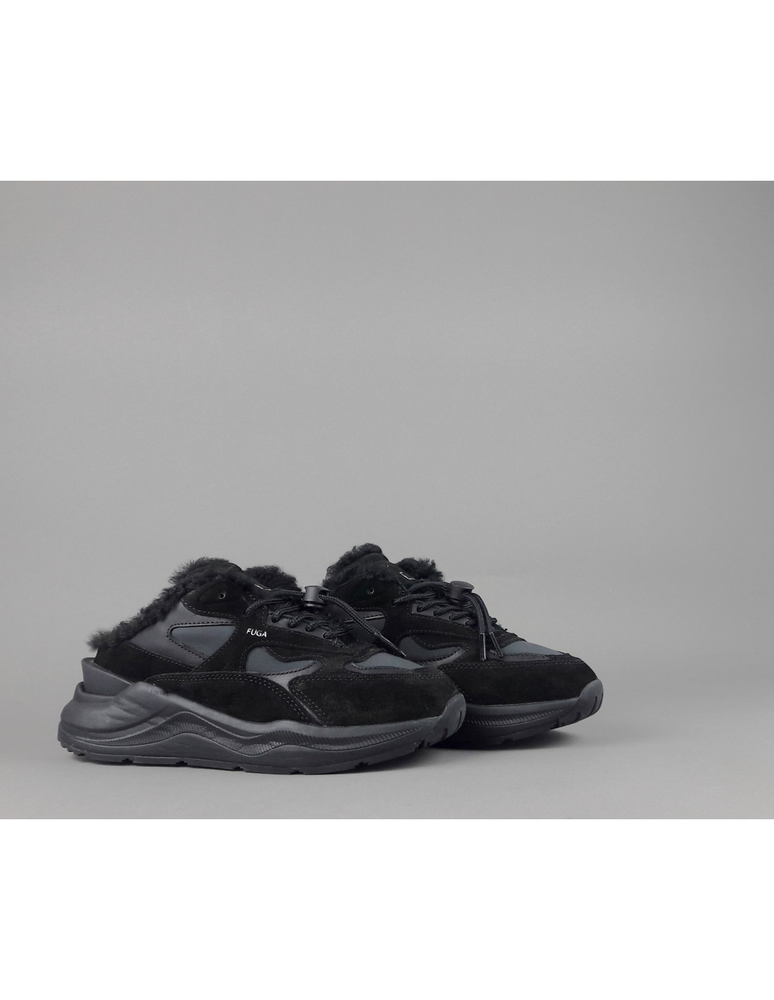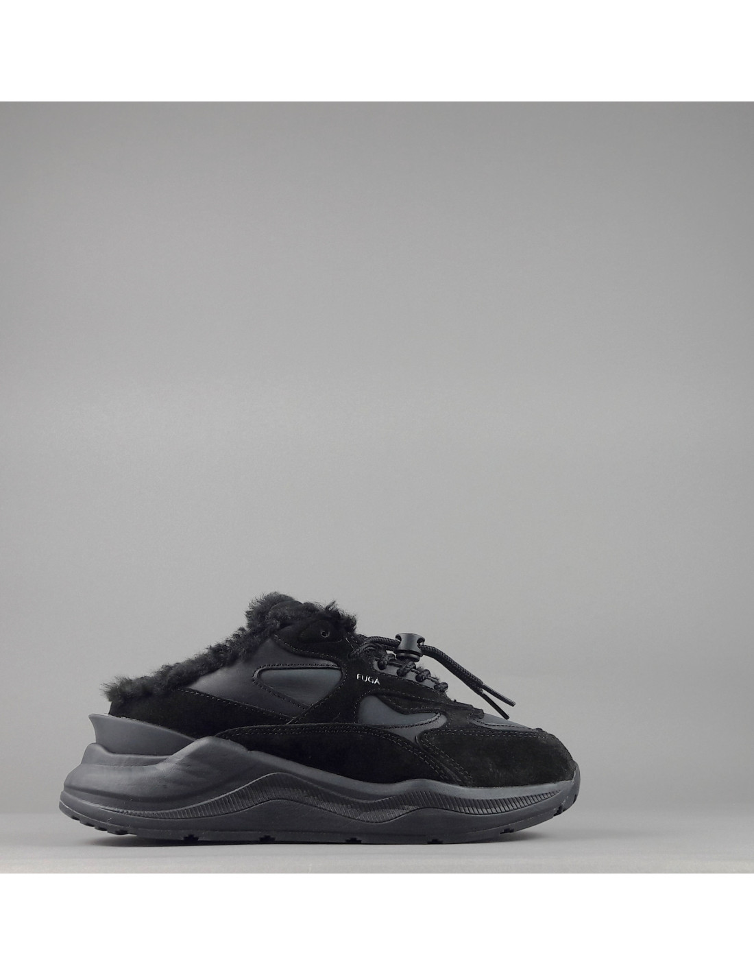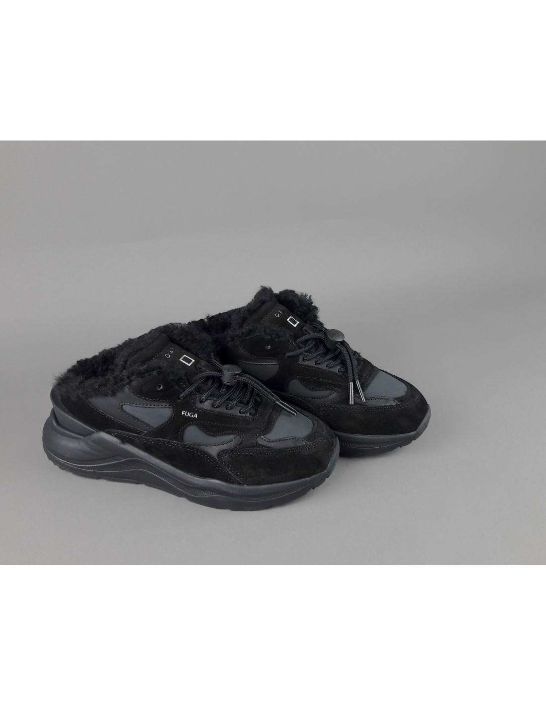 Collezione invernale, Sabot donna D.A.T.E. FUGA in camoscio e tela, logo impresso sulla linguetta, lacci tubolari, interno in eco fur, soletta interna in eco fur e gel estraibile, calzata small, suola in gomma cucita 4 cm.