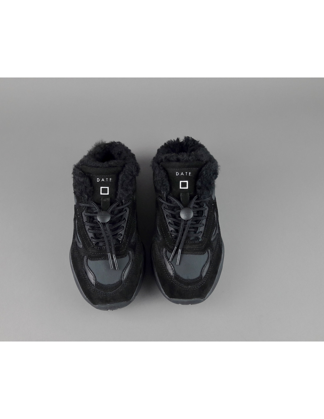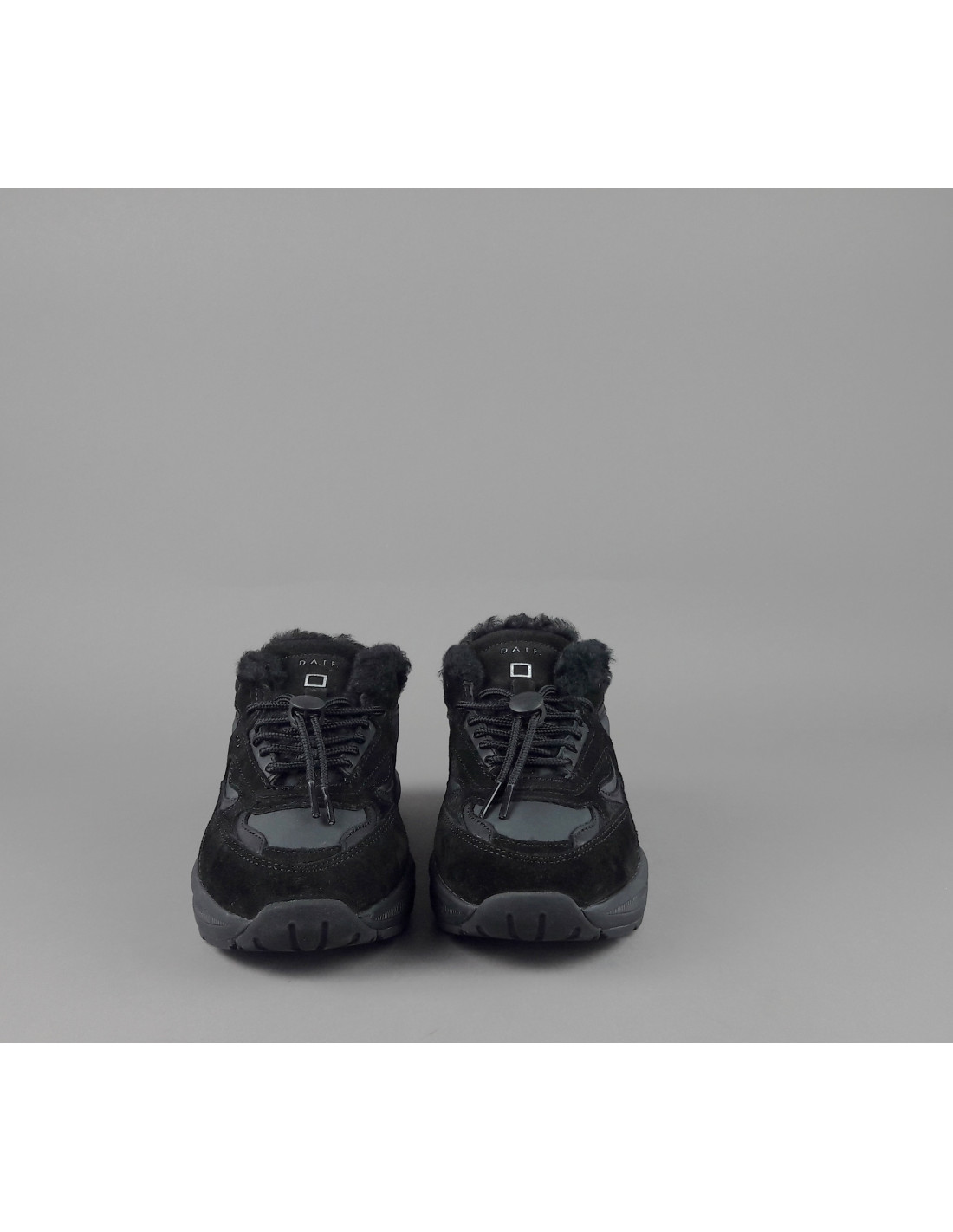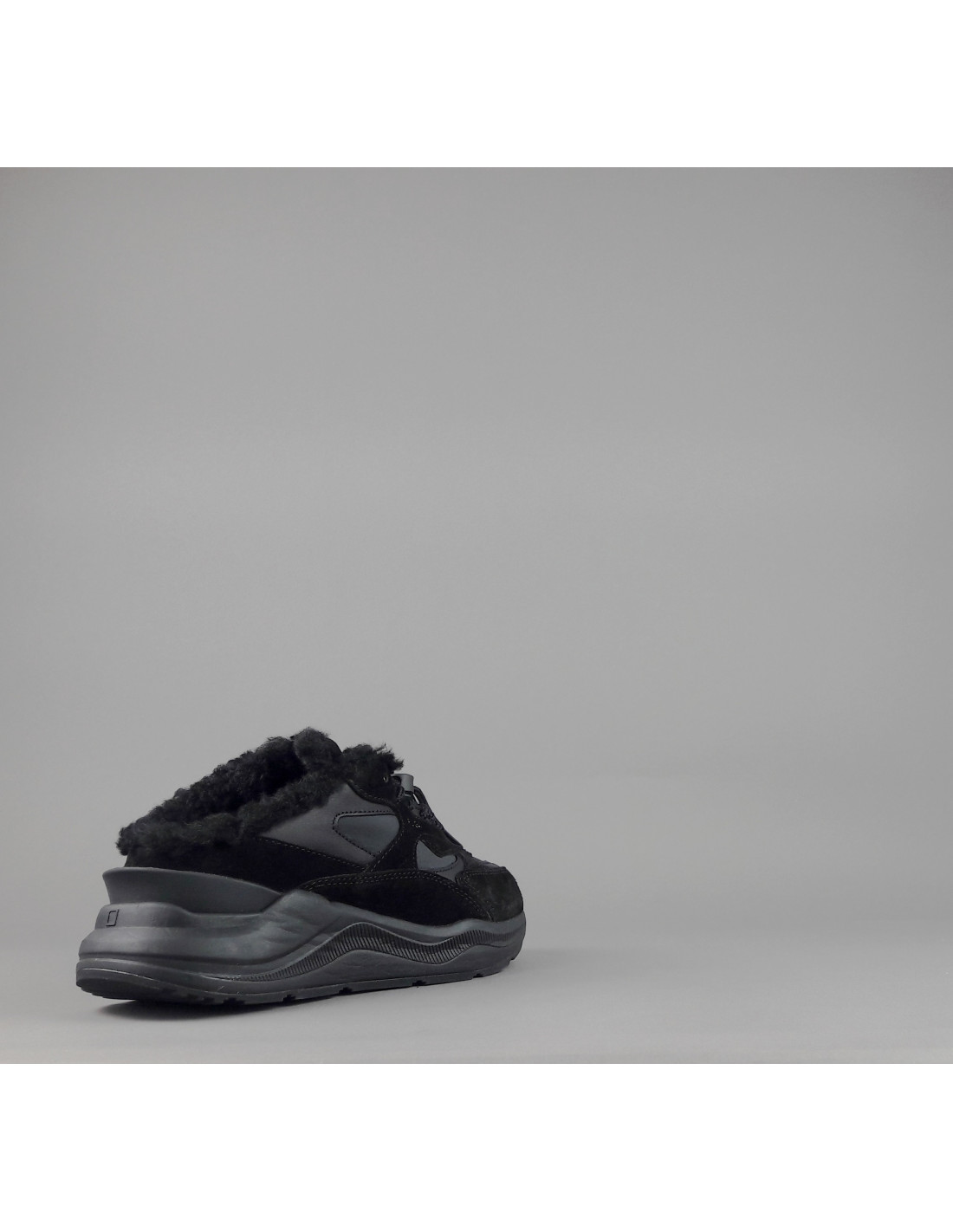 Collezione invernale, Sabot donna D.A.T.E. FUGA in camoscio e tela, logo impresso sulla linguetta, lacci tubolari, interno in eco fur, soletta interna in eco fur e gel estraibile, calzata small, suola in gomma cucita 4 cm.