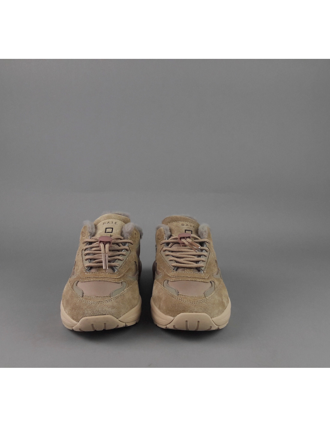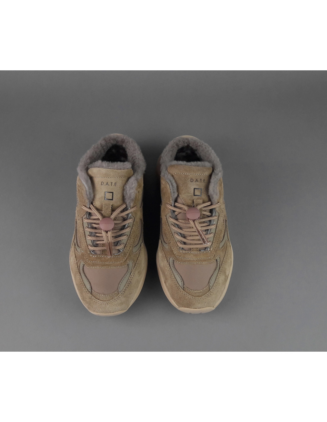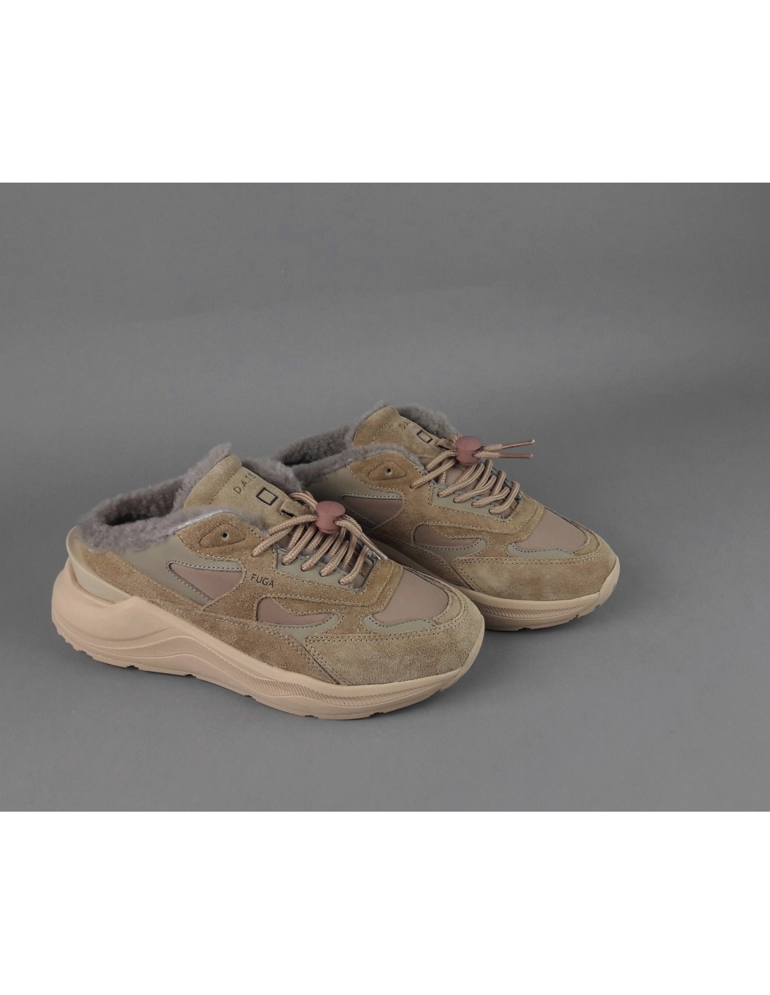Collezione invernale, Sabot donna D.A.T.E. FUGA in camoscio e tela, logo impresso sulla linguetta, lacci tubolari, interno in eco fur, soletta interna in eco fur e gel estraibile, calzata small, suola in gomma cucita 4 cm.
