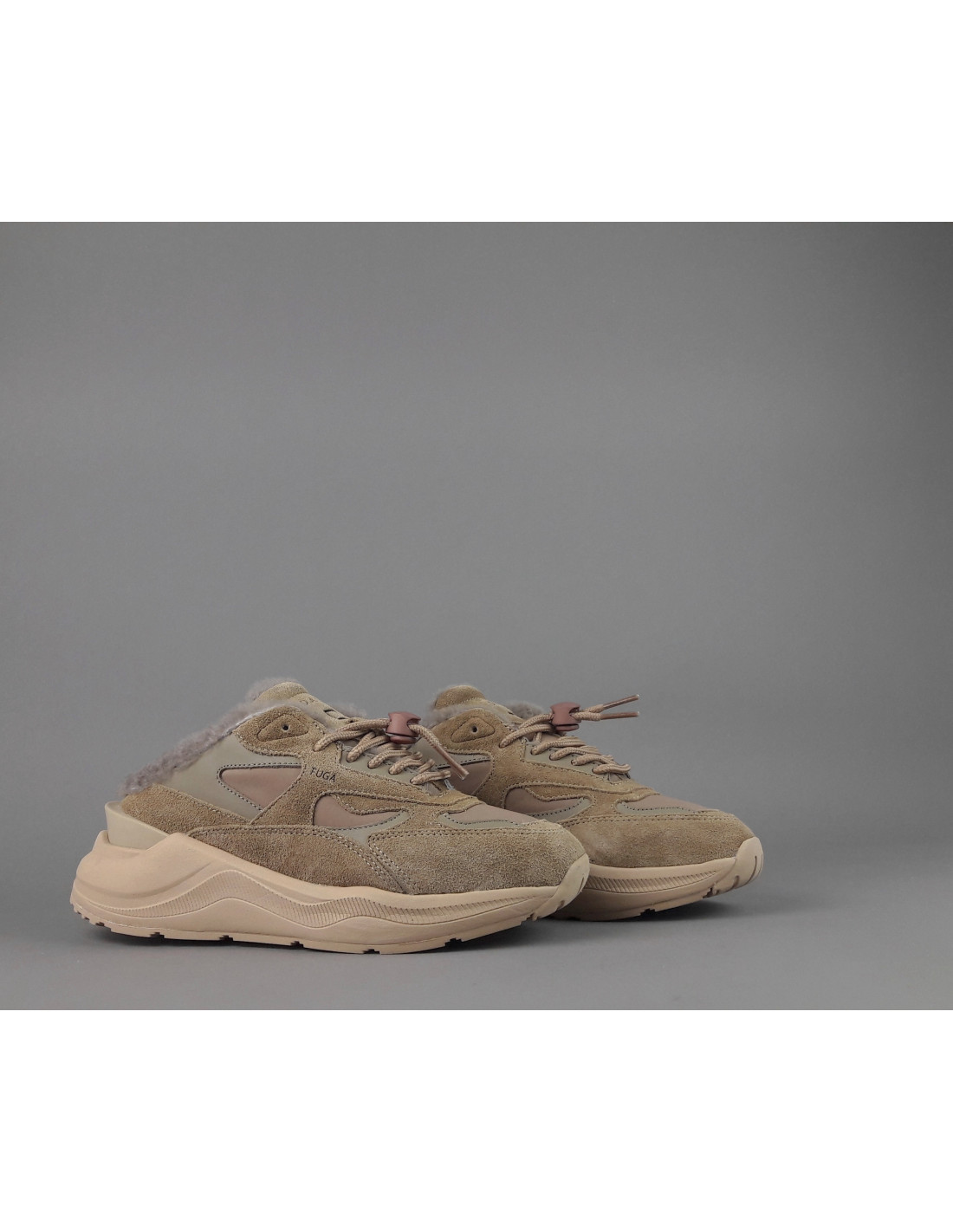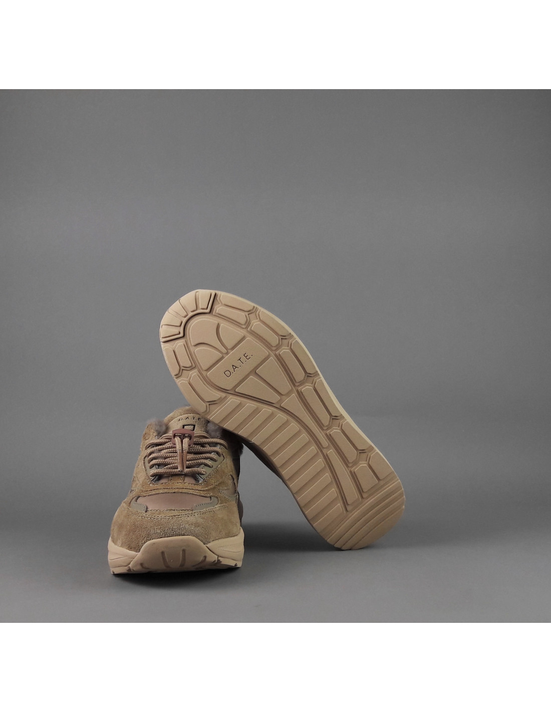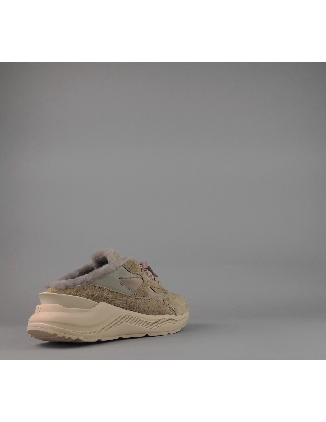Collezione invernale, Sabot donna D.A.T.E. FUGA in camoscio e tela, logo impresso sulla linguetta, lacci tubolari, interno in eco fur, soletta interna in eco fur e gel estraibile, calzata small, suola in gomma cucita 4 cm.