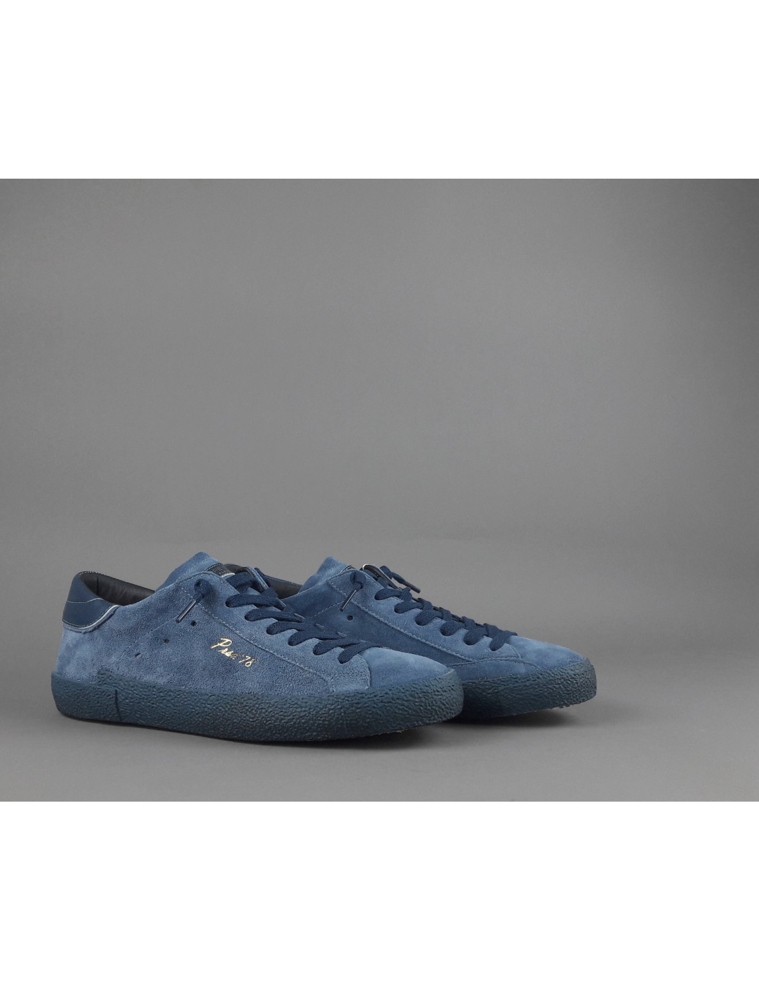 Collezione estiva, sneakers uomo Paris x, in camoscio blu fondo used, logo laterale impresso oro, spoiler tallone in pelle blu con profilo in tinta, fondo gomma.