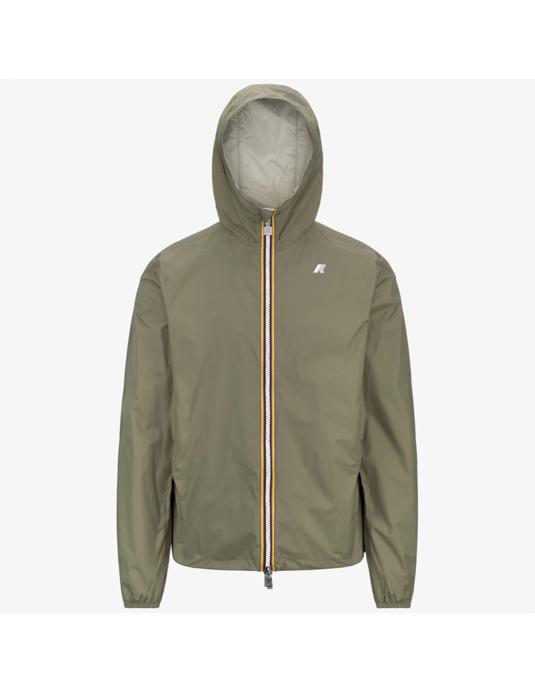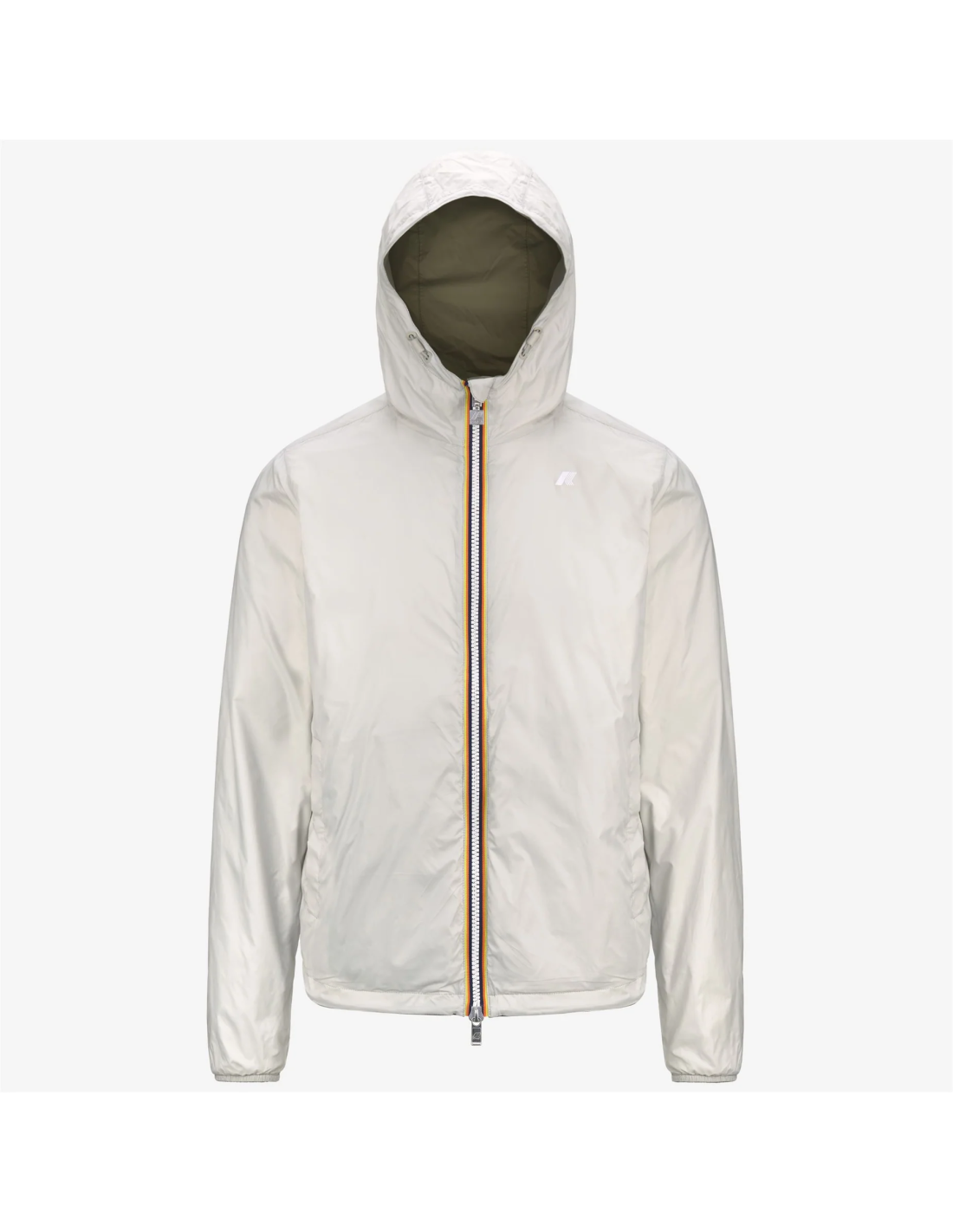 K-Way collezione estiva, K-Way Giubbino uomo Jake Plus Double, in nylon Verde Militare Tenue e Stone, cappuccio fisso, chiusura con cerniera doppio cursore, double face, tasche con zip e bottoni, polsi e fondo con elastici, fit slim, logo silicone.