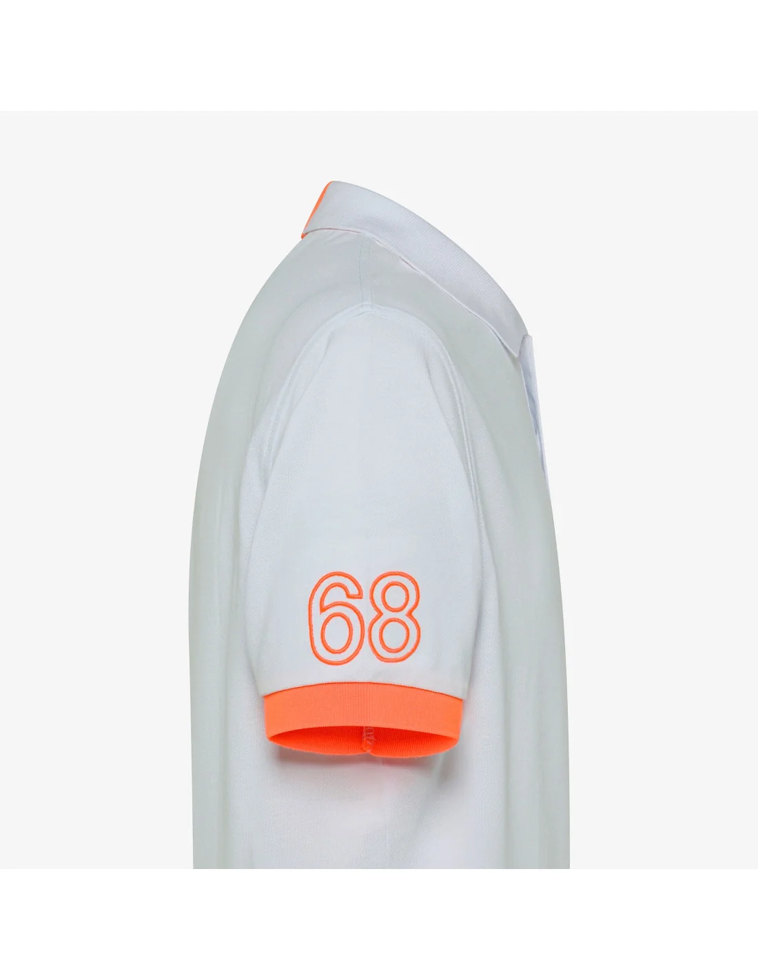 Collezione estiva, polo Sun 68 uomo, in cotone stretch, collo con striscia fluo in contrasto, numero 68 applicato su manica destra, manica corta, due bottoni, logo cucito fluo, vestibilità regular