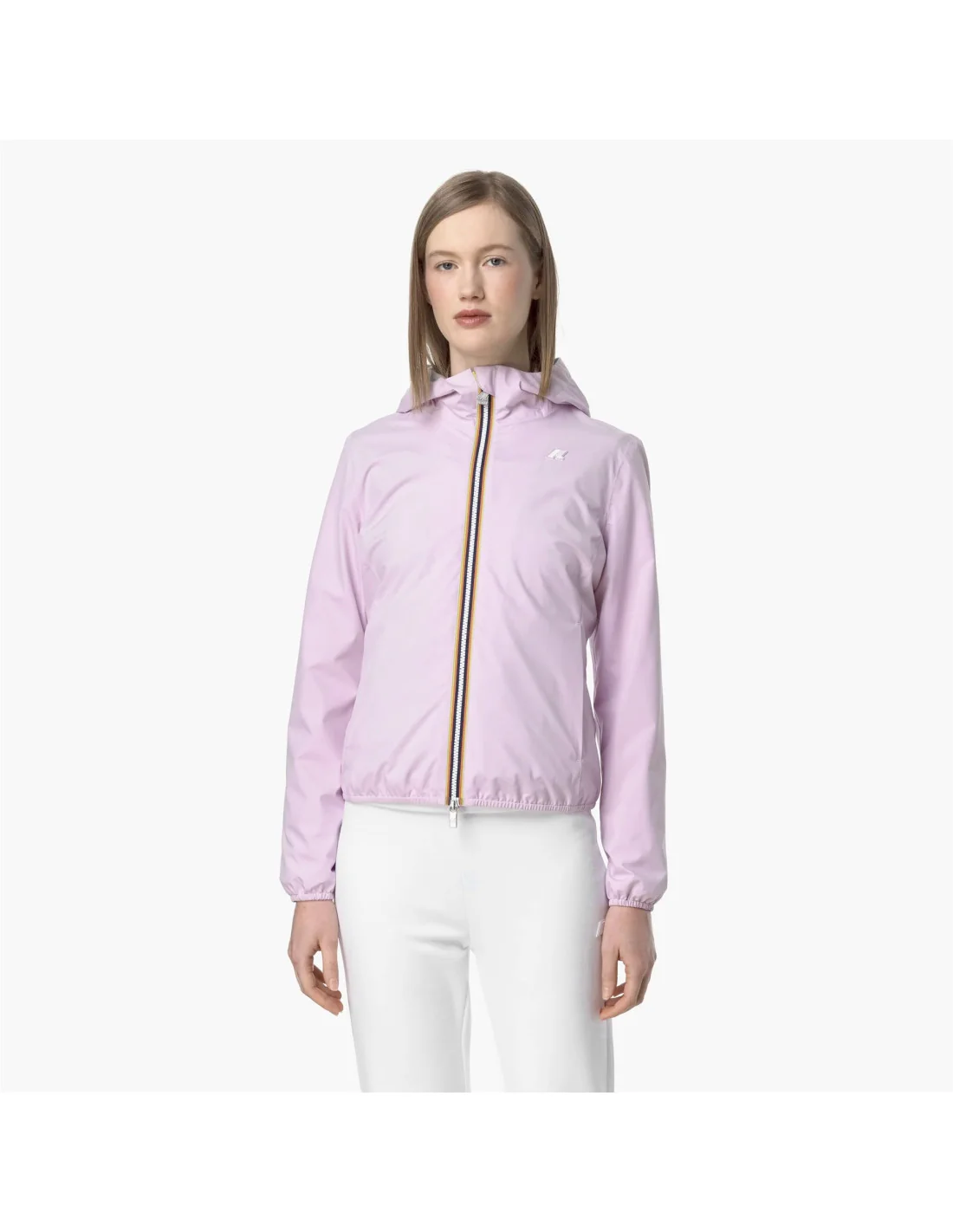 Collezione estiva, K-Way Giubbino donna Lily stretch poly jersey, poliestere stretch con spalmatura impermeabile e antivento, fodera in morbido jersey, zip doppio cursore, cappuccio fisso, cuciture termonastrate, polsi con elastico, fit slim, logo silicone.
