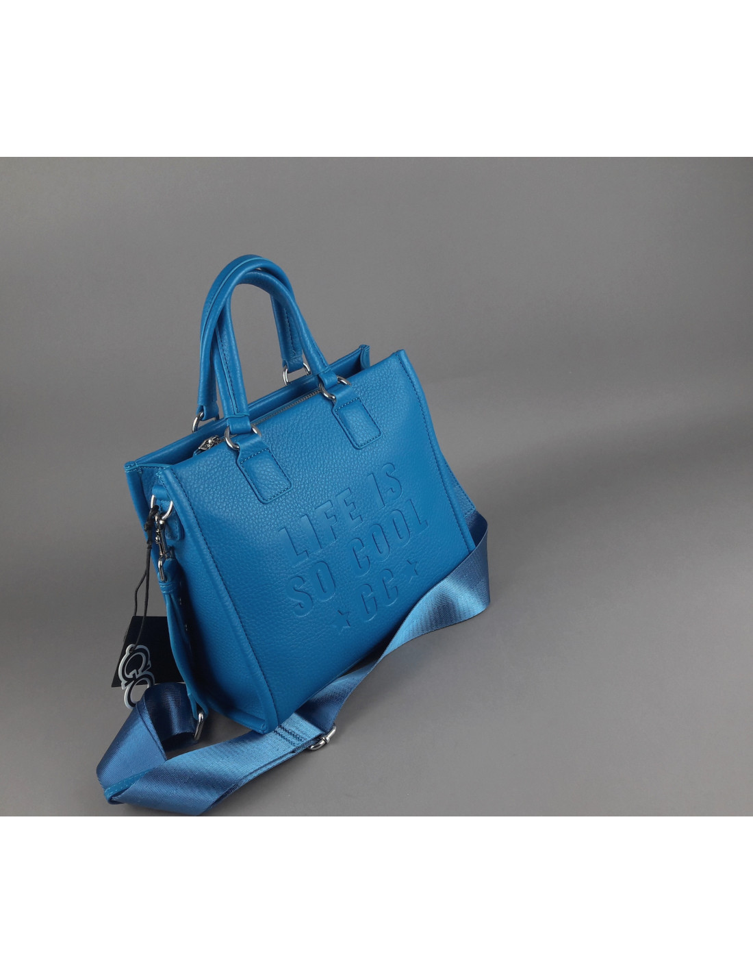 Gio Cellini collezione estiva, borsa a mano donna in poliuretano trapuntato, Scritta impressa frontale, doppio manico centrale, tracolla in tessuto, chiusura con cerniera, logo