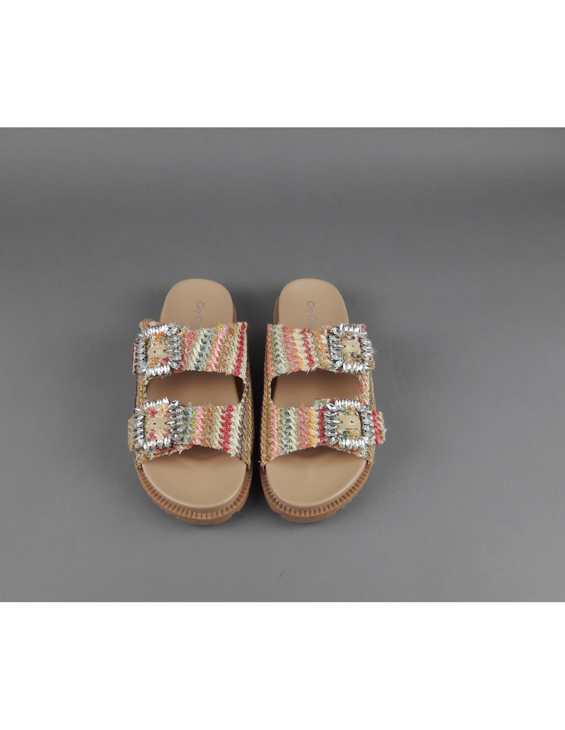 Collezione estiva, Sandalo donna Gio Cellini, tessuto ecologico PU effetto rafia, doppia fascia a fibia con applicazioni, sottopiede in PU, fondo gomma.
