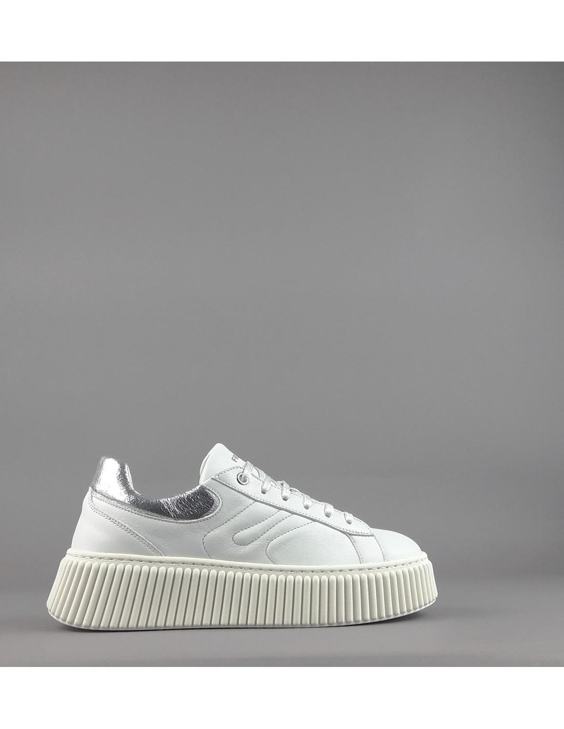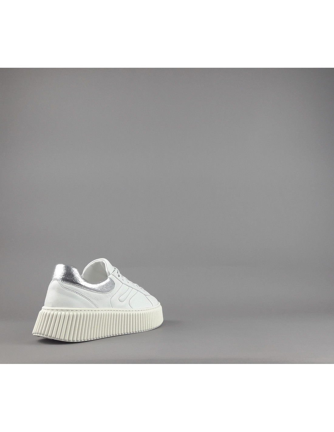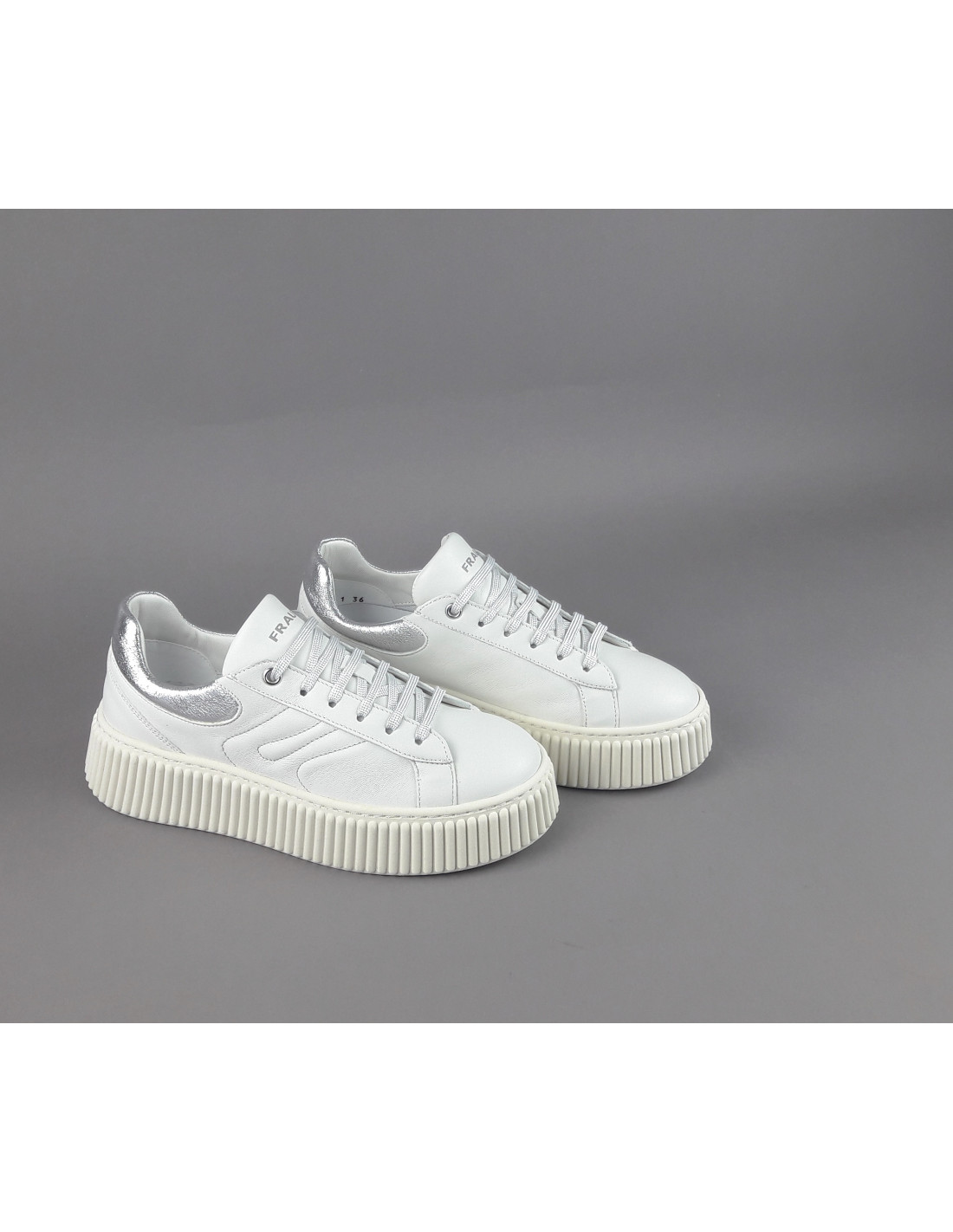Frau collezione estiva, sneaker donna in pelle liscia bianco, sottopiede in tessuto estraibile, spoiler pelle metal argento, logo cucito, fondo gomma a strisce 4cm.