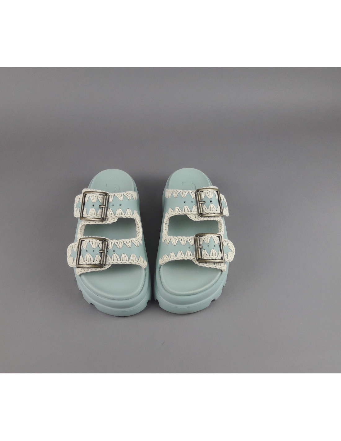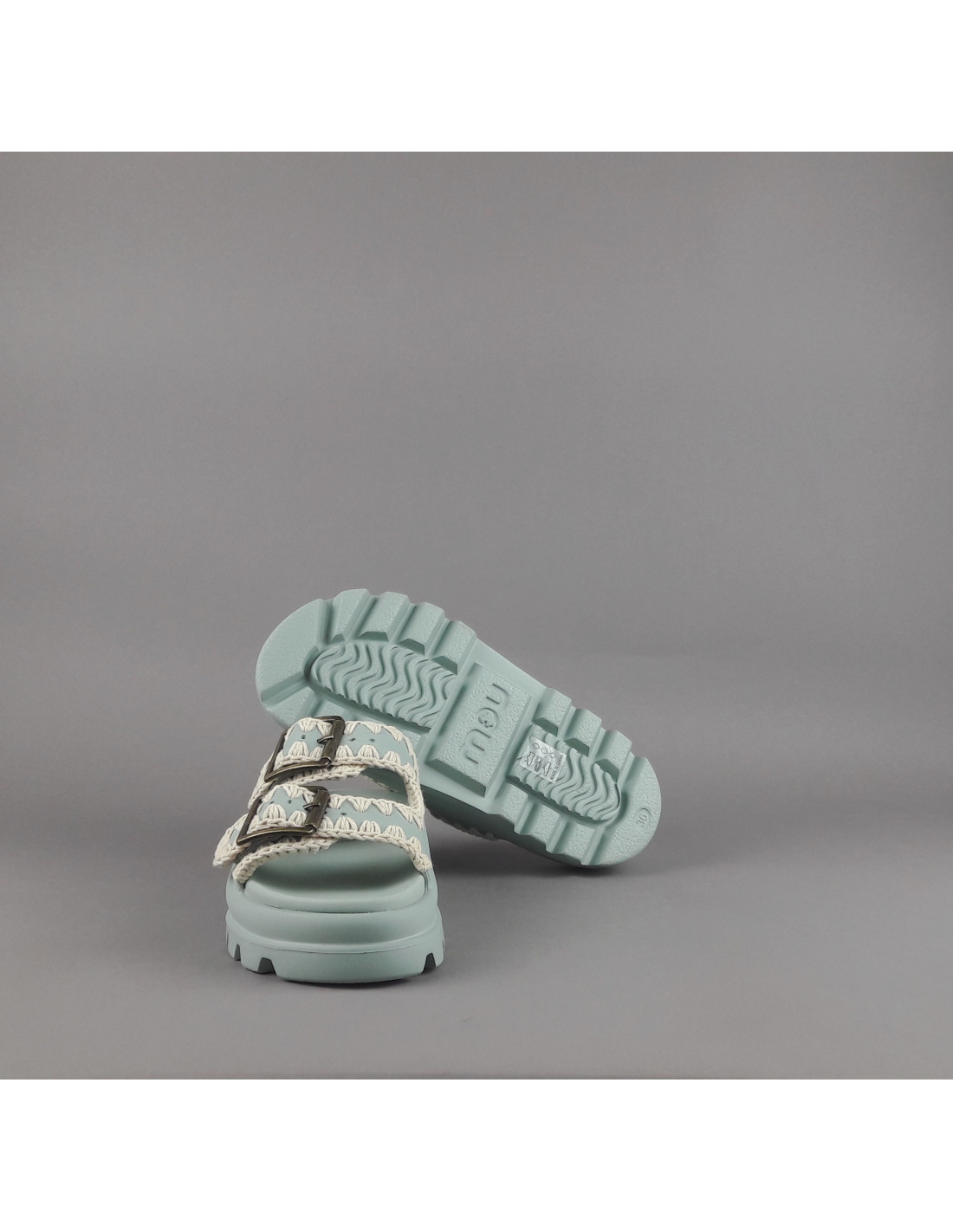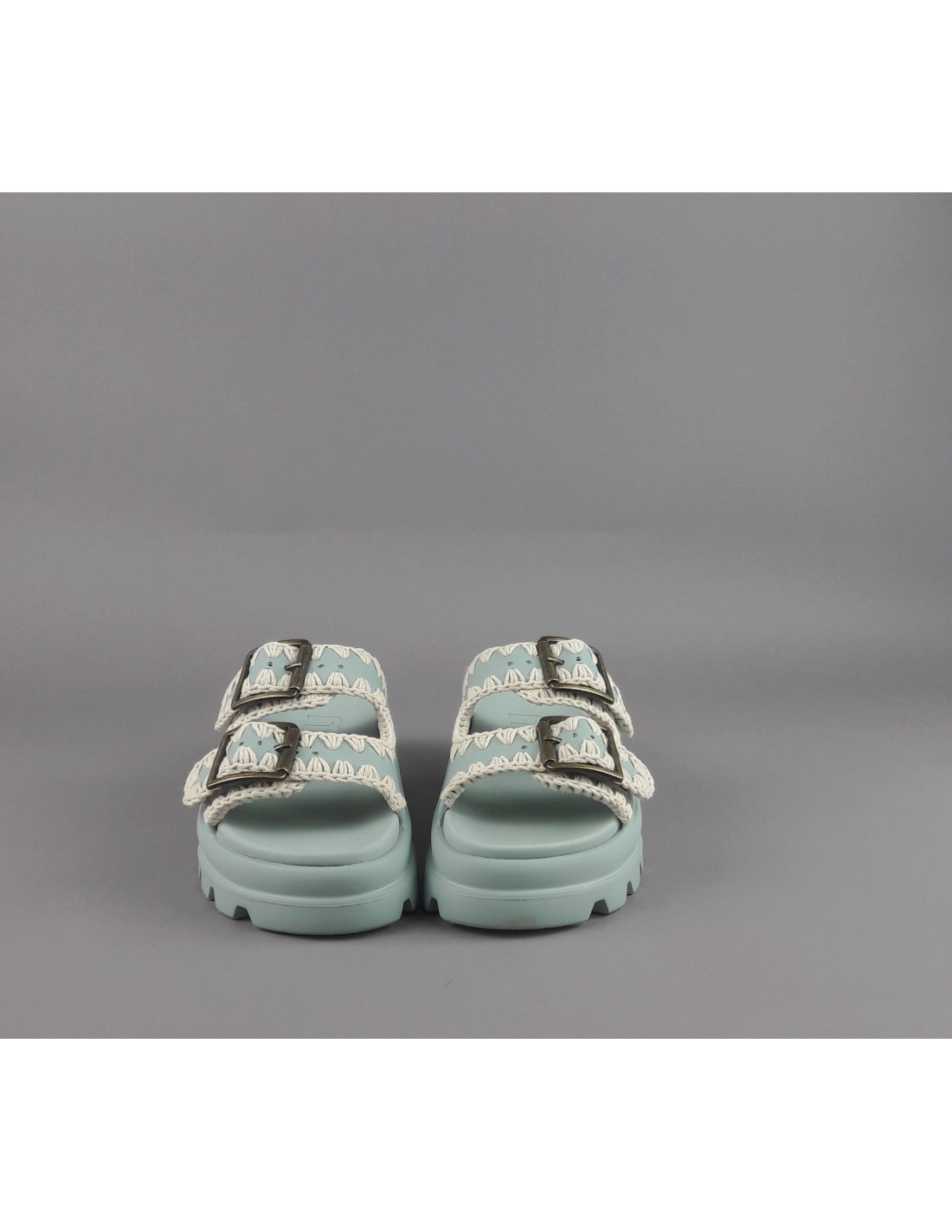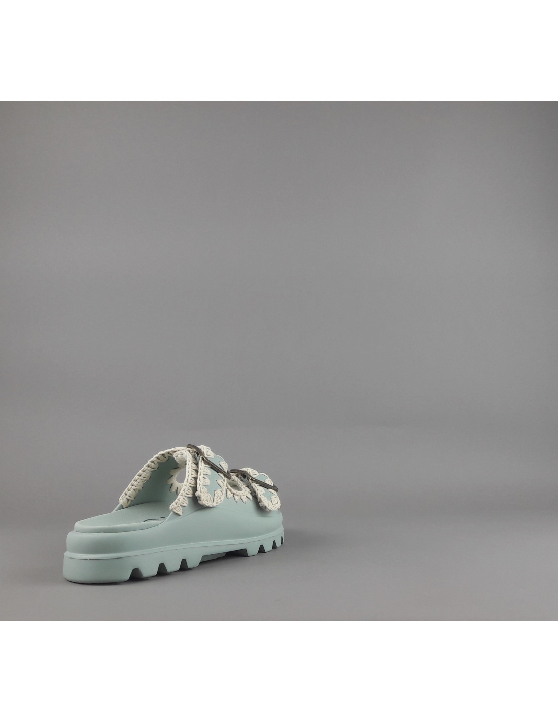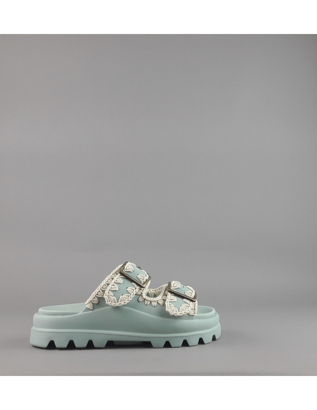 Collezione estiva, Mou Sandalo one piece slide donna, tomaia e fondo in EVA color verde salvia tenue, doppia fascia con fibbie, dettagli all'uncinetto lavorati a mano.