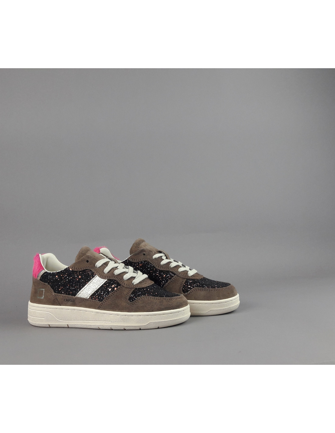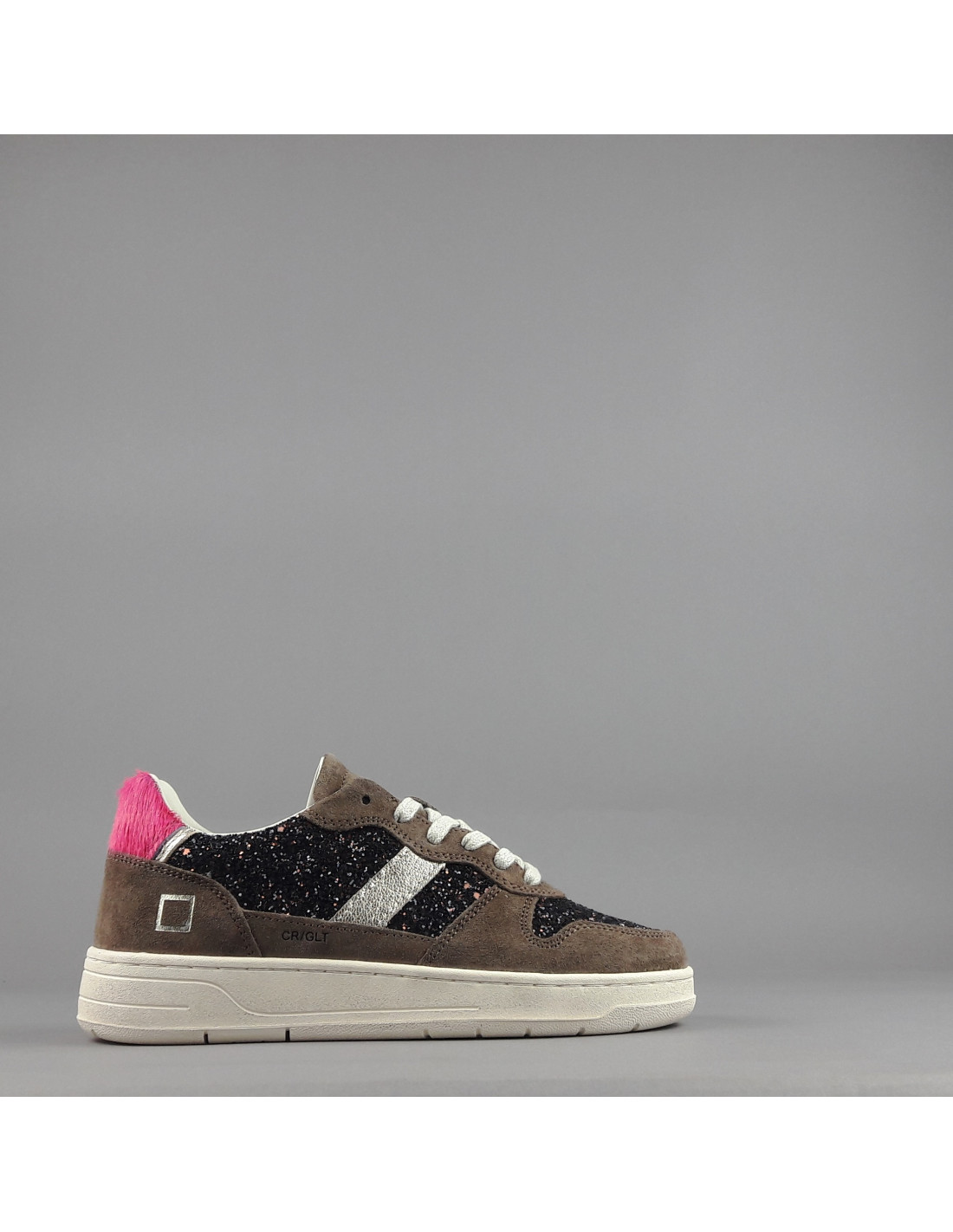 Collezione invernale, Sneakers donna D.A.T.E. COURT in camoscio e glitter, spoiler in cavallino fuxia, dettagli in pelle metal oro, logo laterale impresso stampato, fondo cucito, soletta interna removibile di 2,5 cm, suola in gomma.
