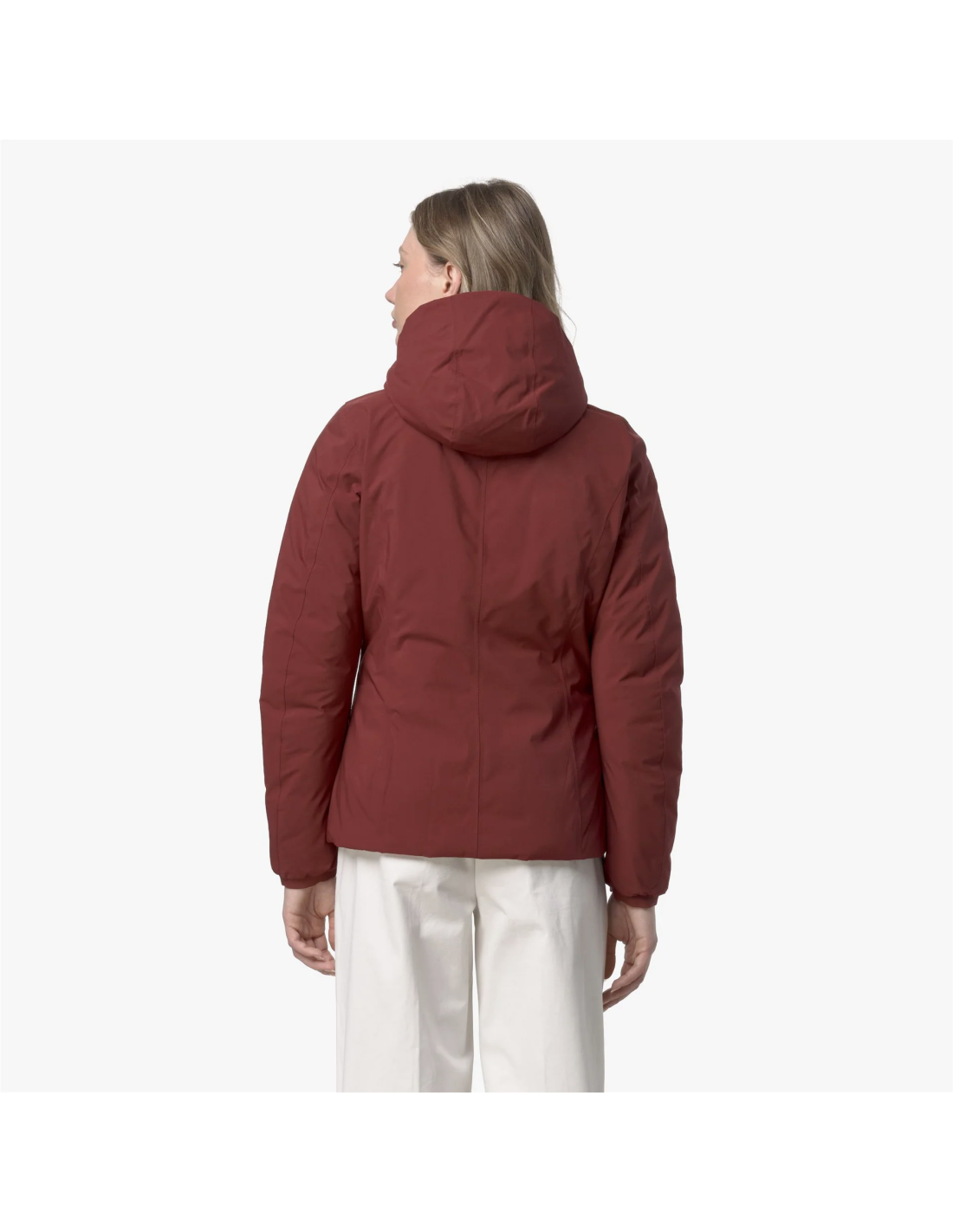 Collezione invernale, K-Way donna Giacca corta LILY THERMO DOUBLE, da un lato tessuto tecnico liscio e l'altro con nylon trapuntato, imbottitura in piuma, tasche laterali, zip centrale, cappuccio fisso, fit slim, logo silicone.