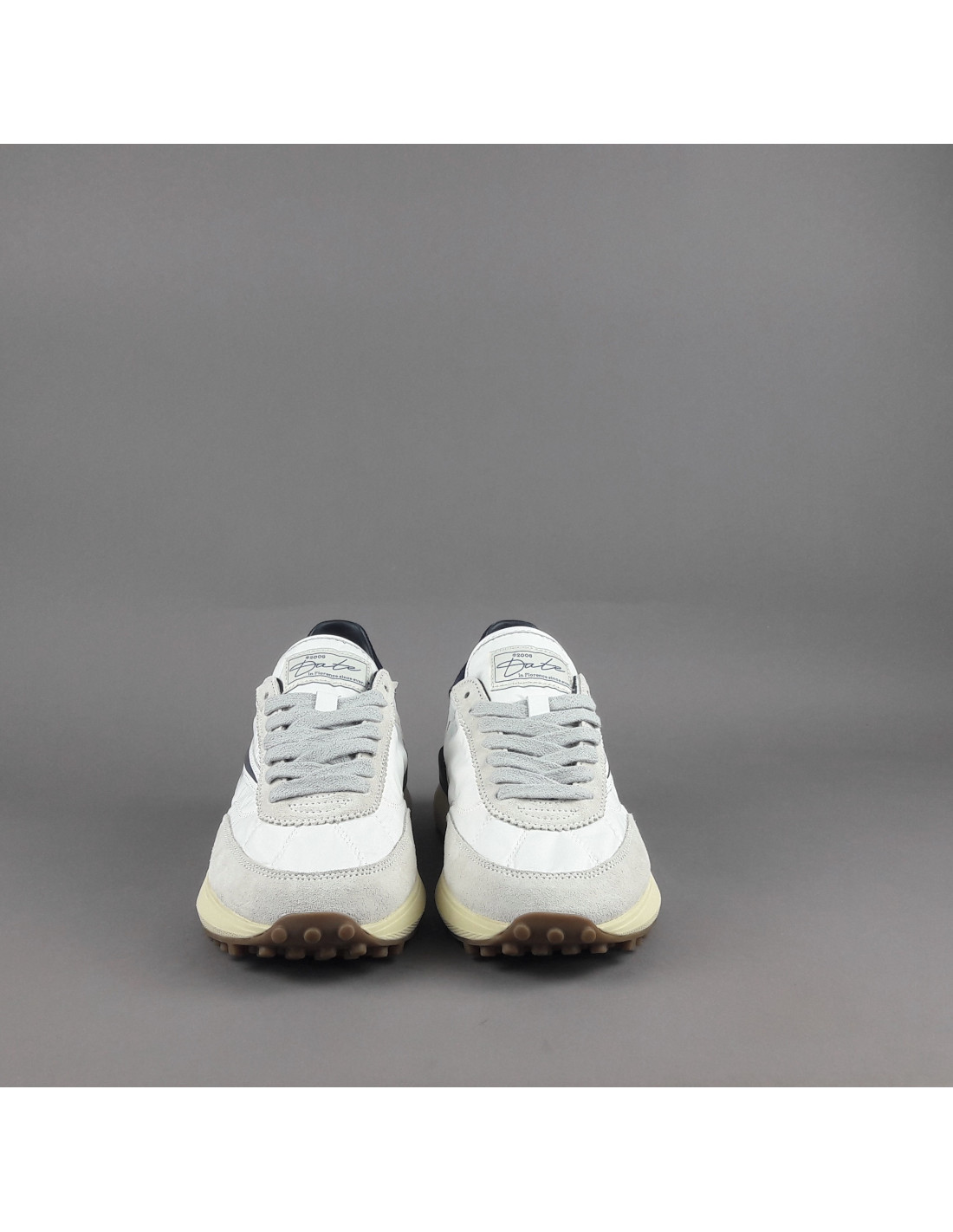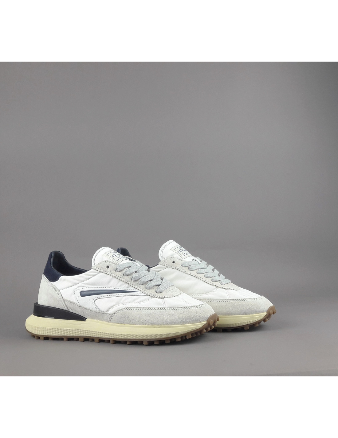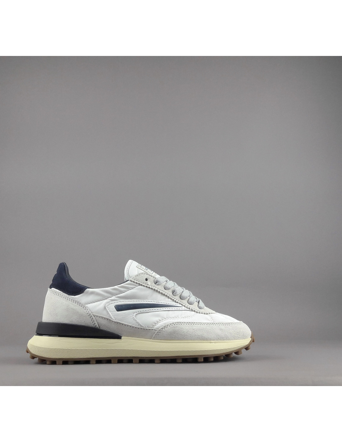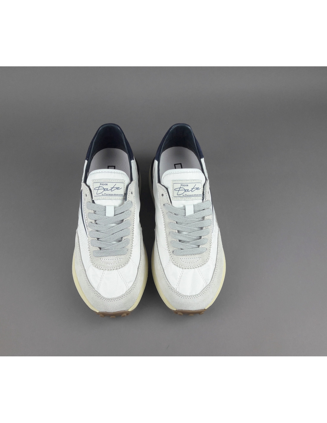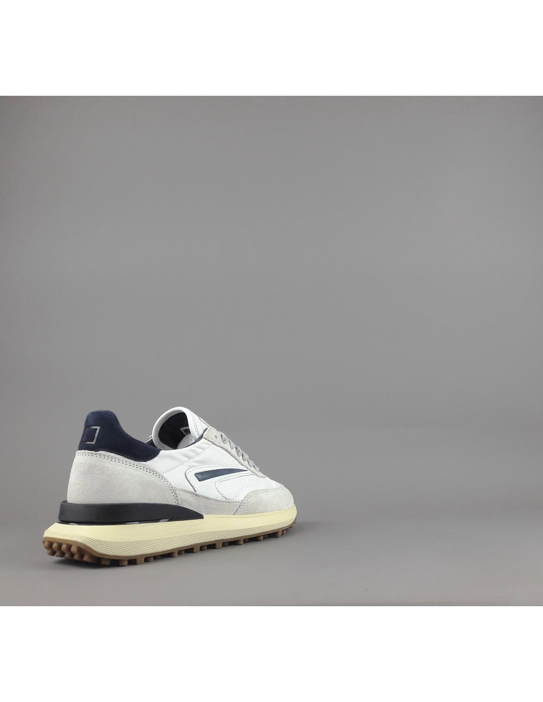D.A.T.E collezione estiva, Sneakers uomo ATHLETA in camoscio ghiaccio e tessuto tecnico bianco, spoiler e baffo laterale blu scuro, soletta interna removibile di 2 cm, suola in gomma.