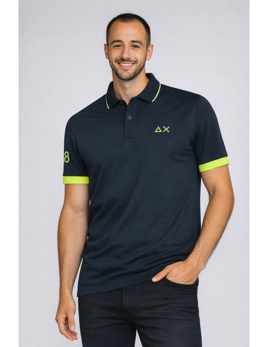 Sun 68 collezione estiva, polo uomo, in cotone stretch, manica corta, due bottoni, collo e maniche con bordo fluo, maxi logo sulla manica, logo cucito, vestibilità regular
