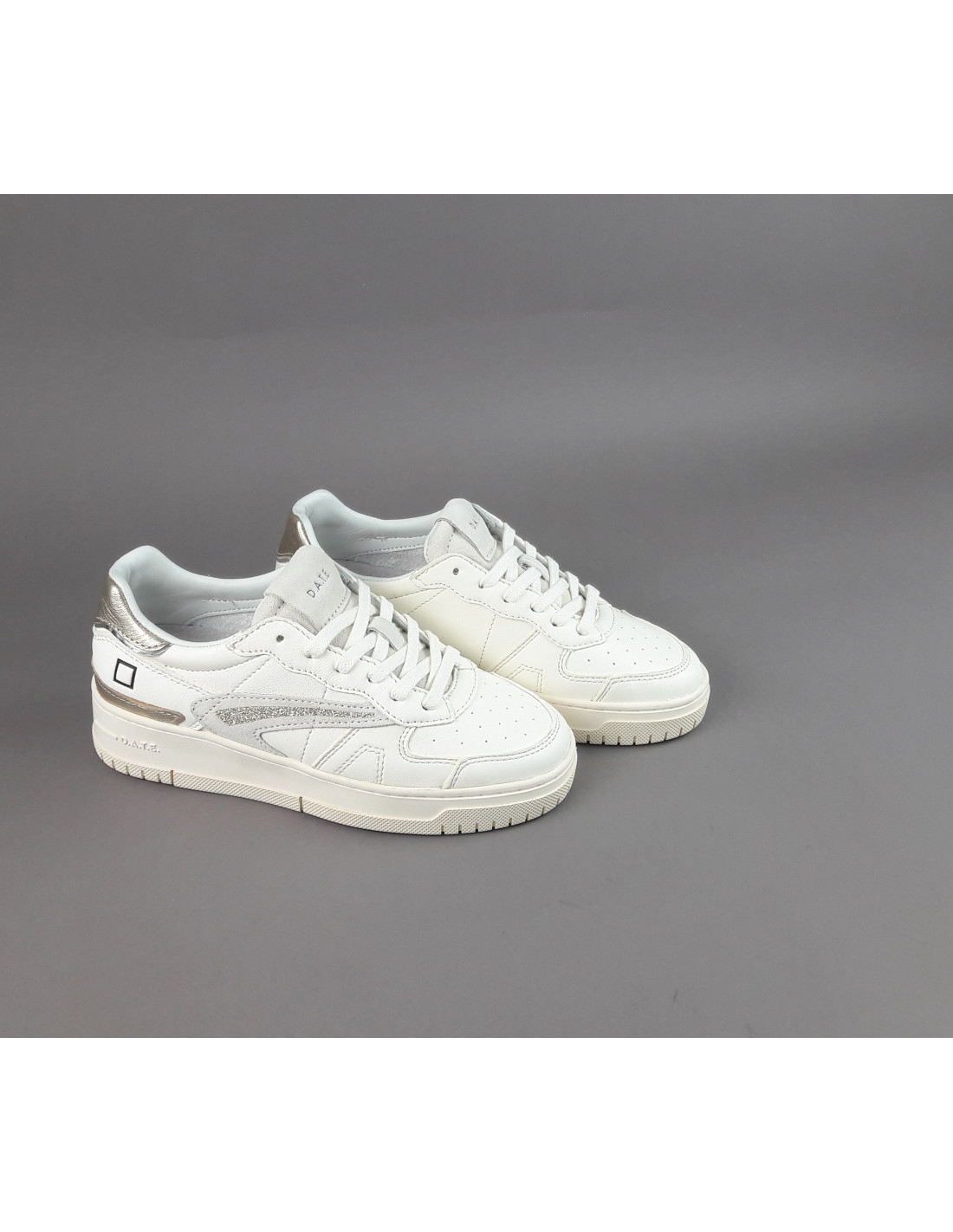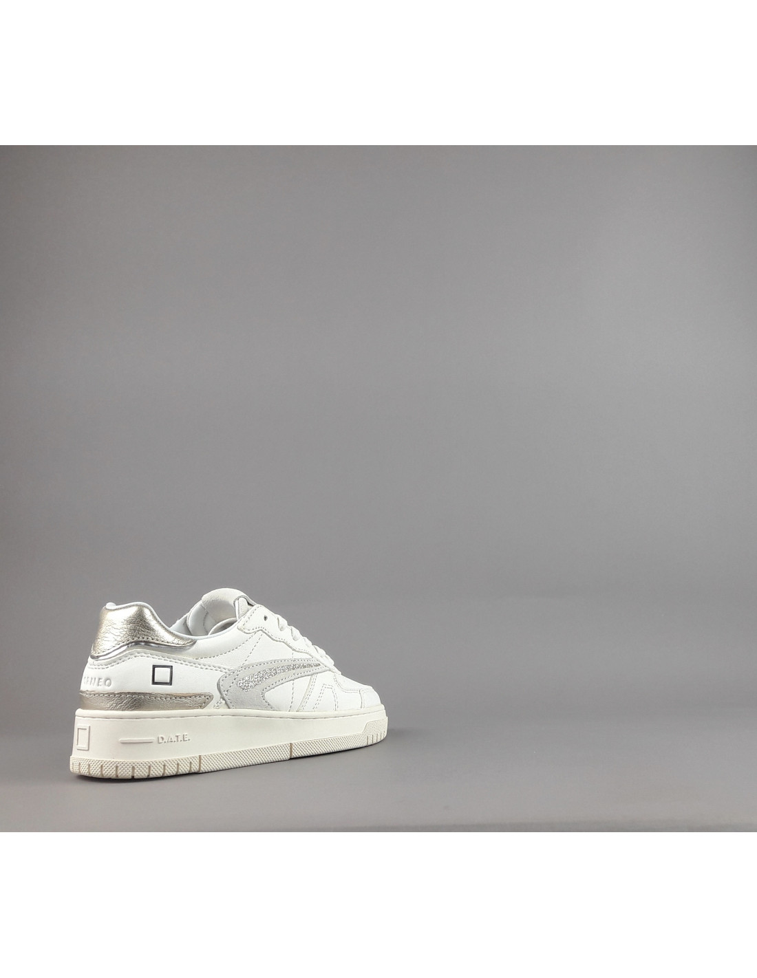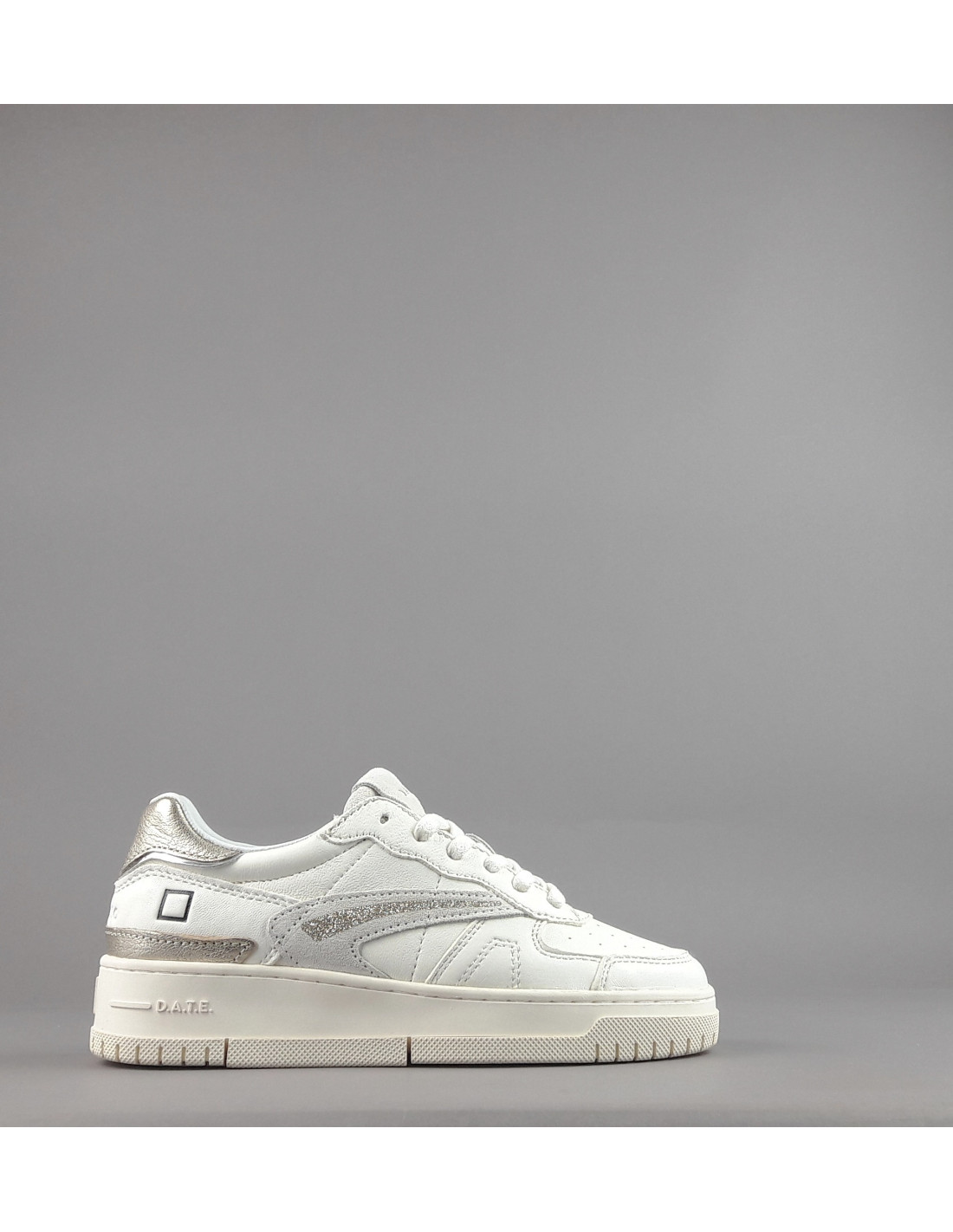 D.A.T.E. collezione estiva, Sneakers donna TORNEO in pelle, dettagli spoiler in pelle platino, baffo laterale in glitter argento, puntale forato, logo impresso sul lato del tallone, soletta interna estraibile di 2.5 cm, calzata regolare, suola in gomma cucita 4 cm.