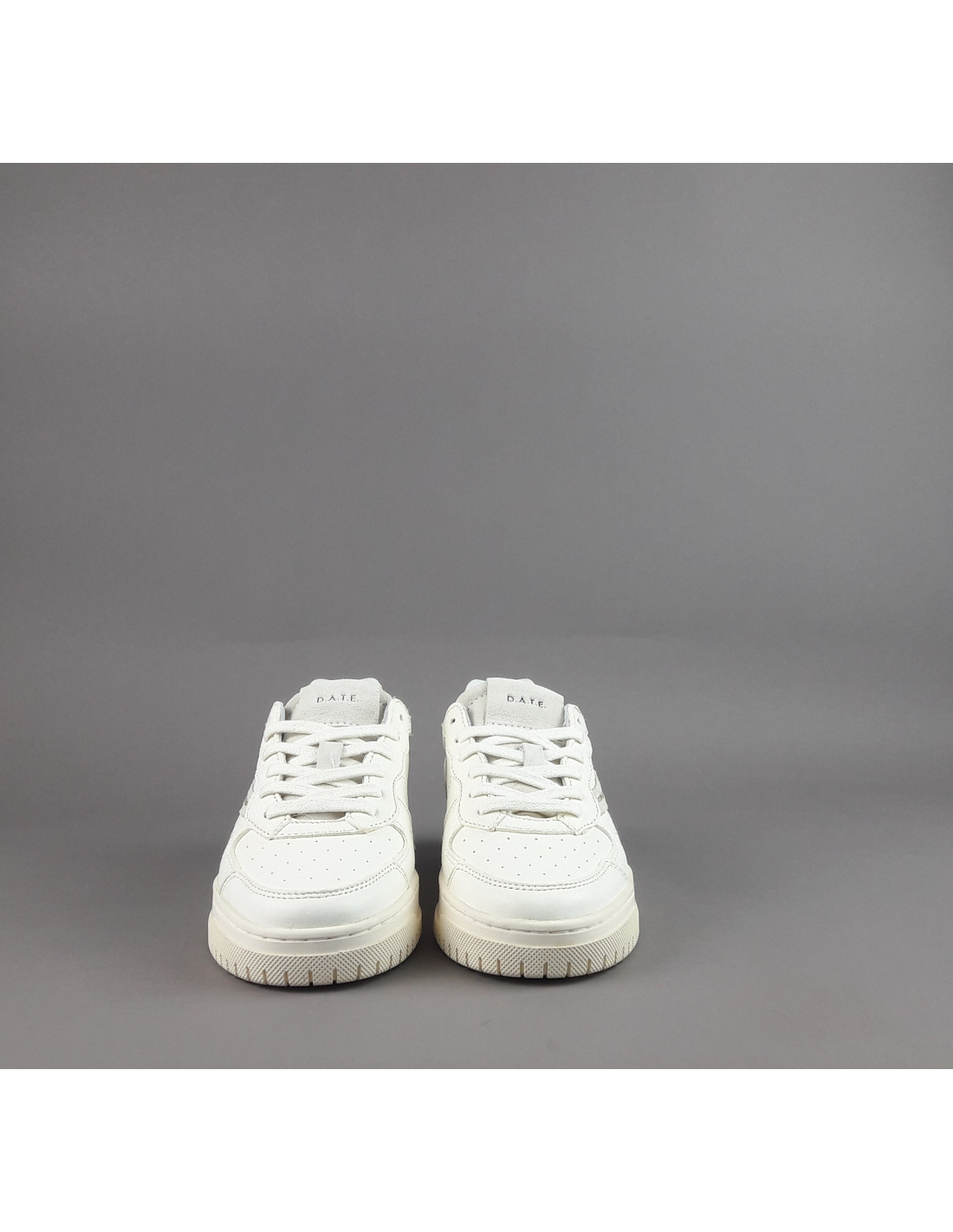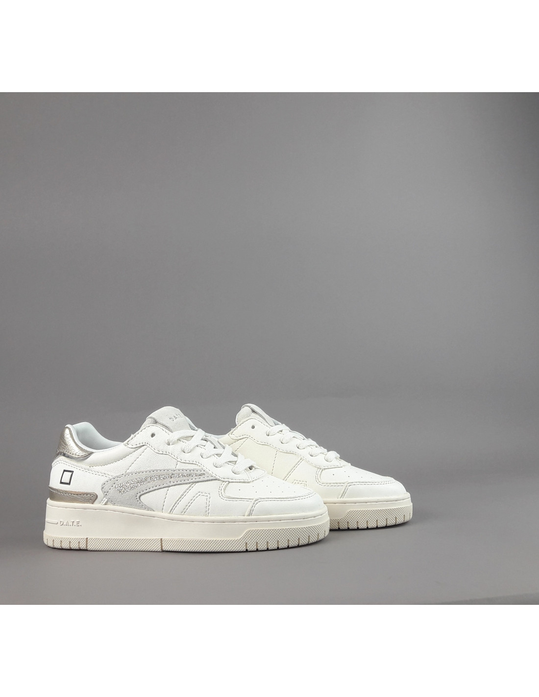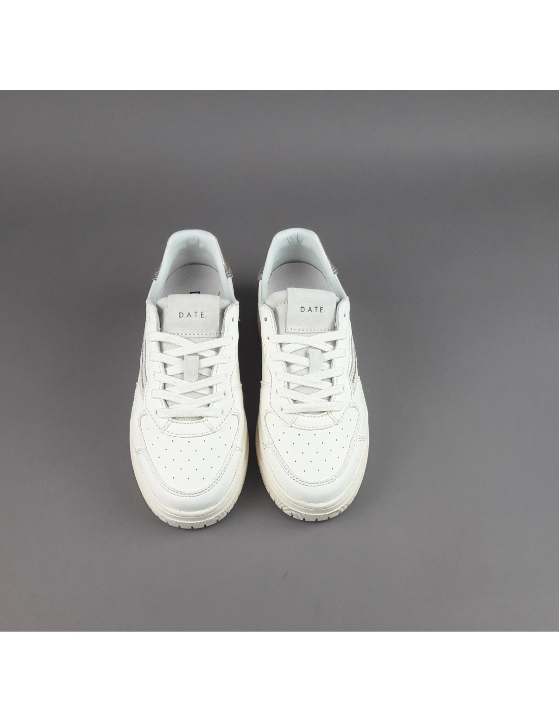 D.A.T.E. collezione estiva, Sneakers donna TORNEO in pelle, dettagli spoiler in pelle platino, baffo laterale in glitter argento, puntale forato, logo impresso sul lato del tallone, soletta interna estraibile di 2.5 cm, calzata regolare, suola in gomma cucita 4 cm.