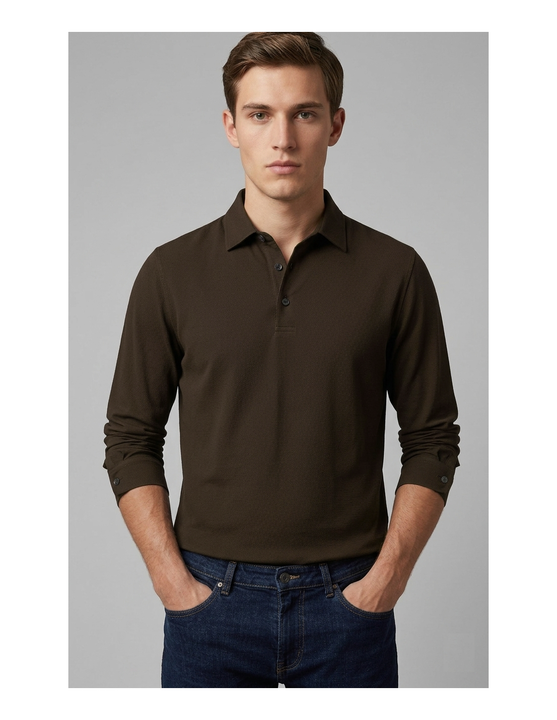 Filippo De Laurentiis collezione estiva, polo uomo manica lunga, in crepe di cotone leggero, tre bottoni, collo con lavorazione paramontura, maniche lunghe con bottone, fondo a coste, vestibilità regular
