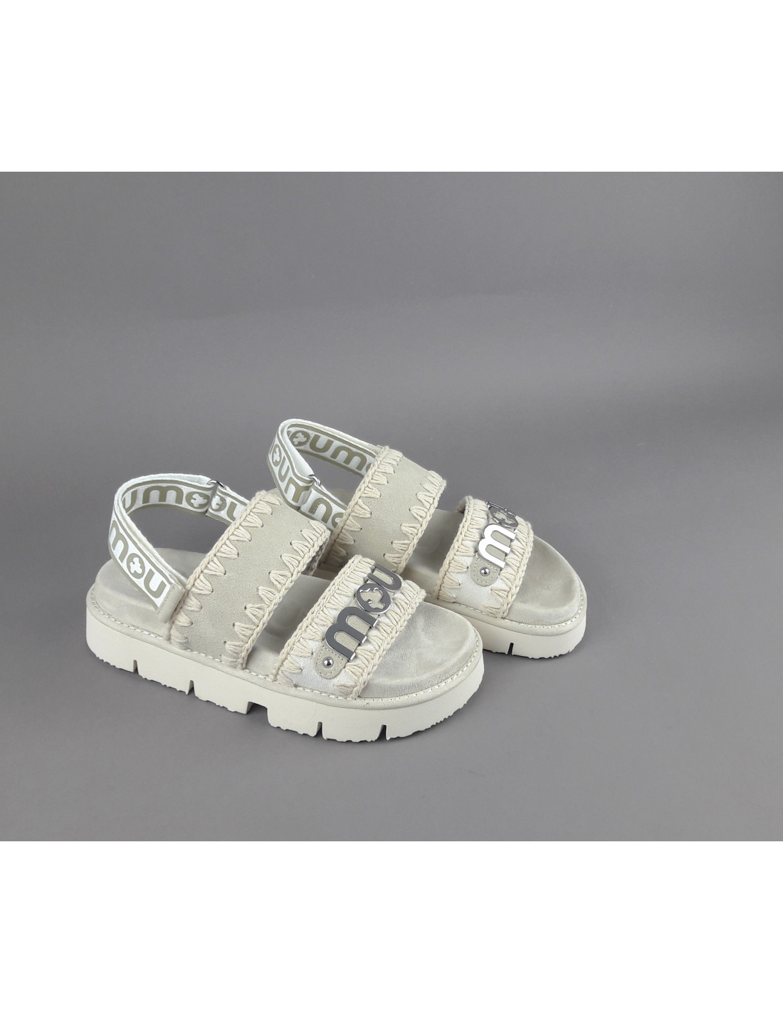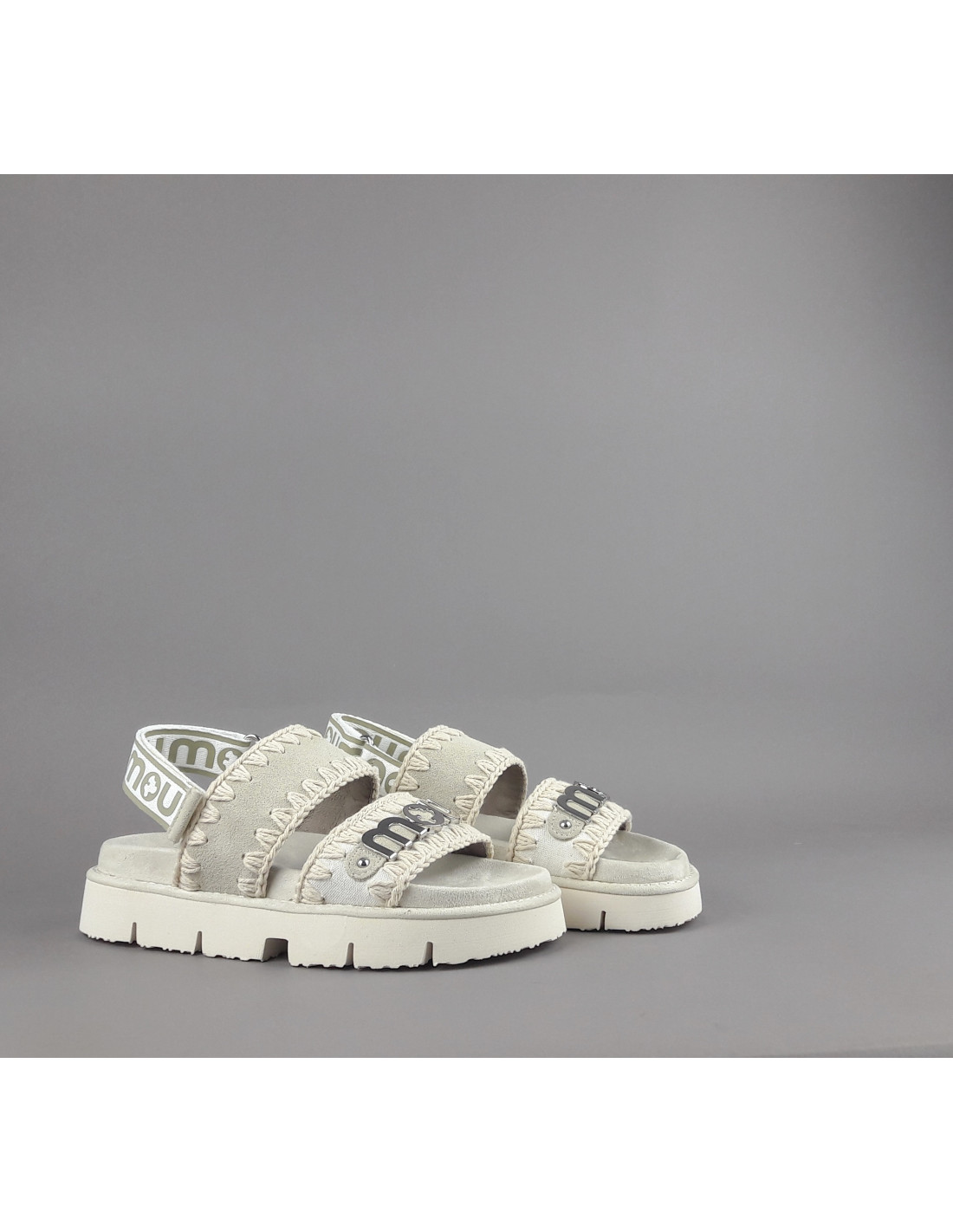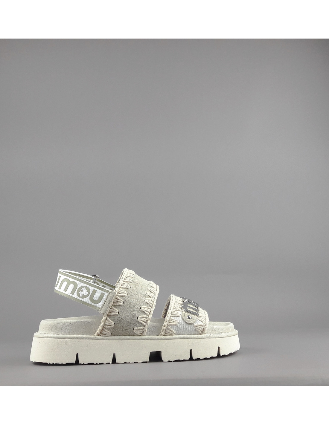 Mou collezione estiva, Sandalo BIo donna, tomaia in camoscio e tela canvas doppia fascia, foderato in pelle con sottopiede in tessuto effetto velluto, fibbia posteriore logata con velcro, dettagli a uncinetto fatti a mano, logo in metallo, suola gomma.