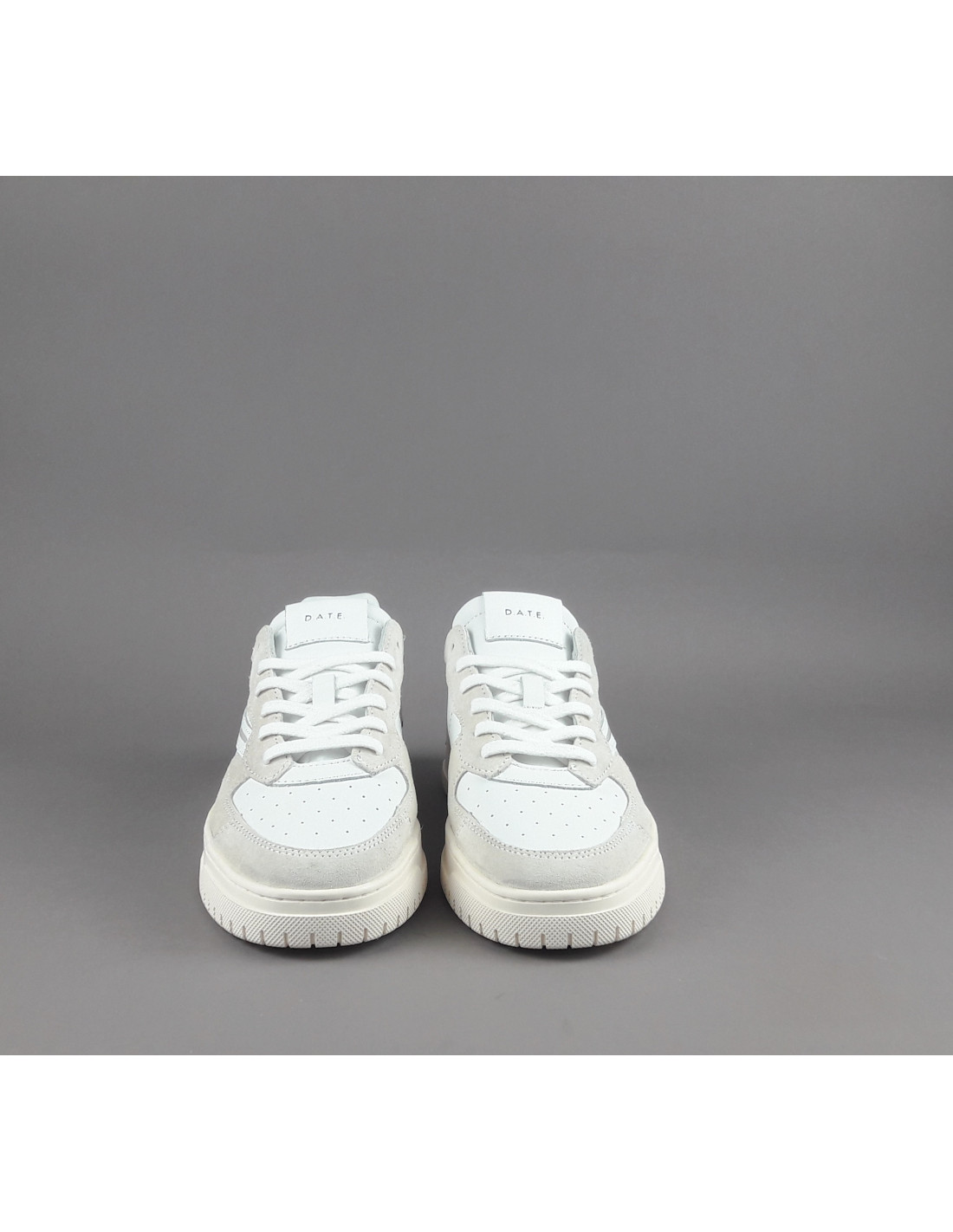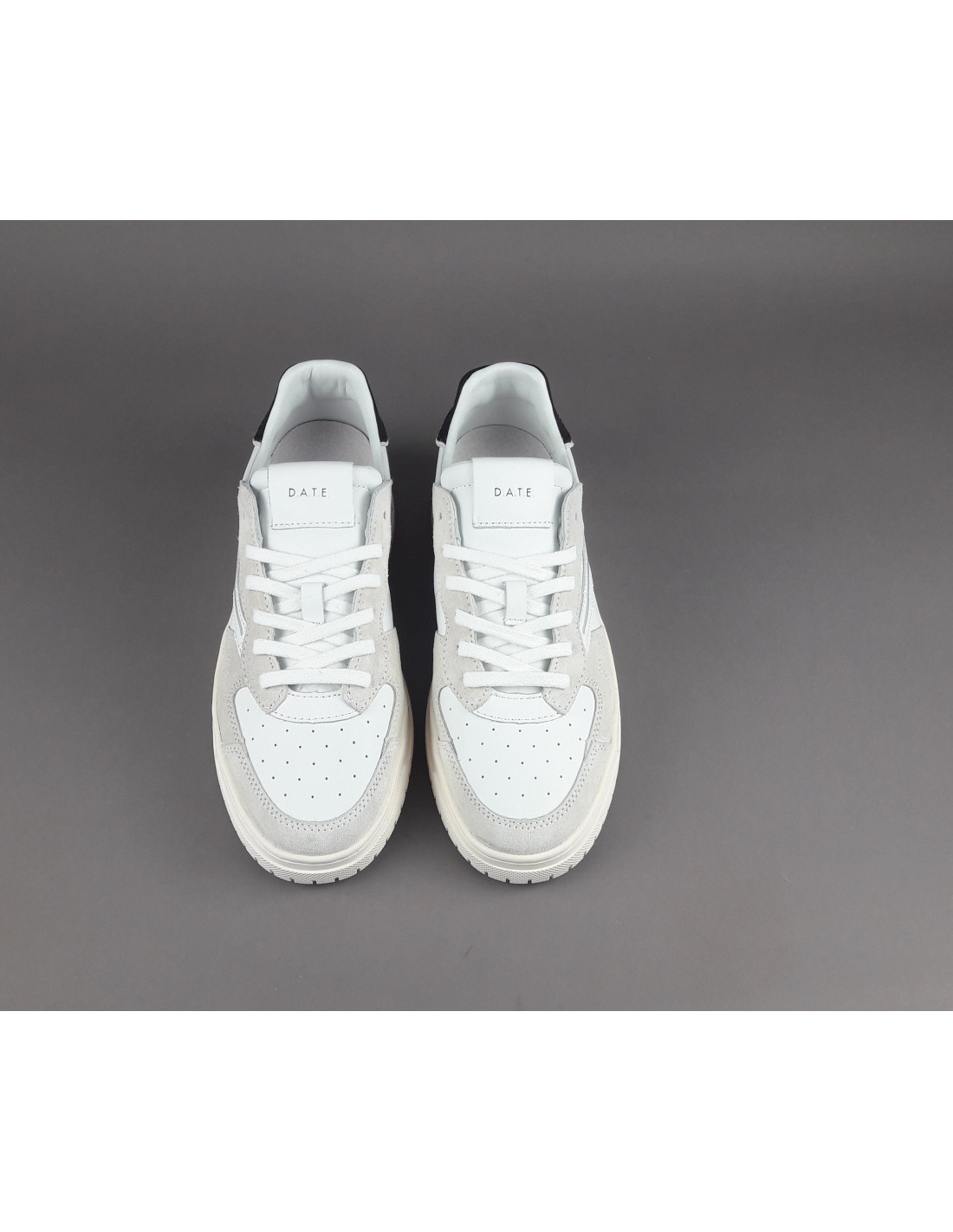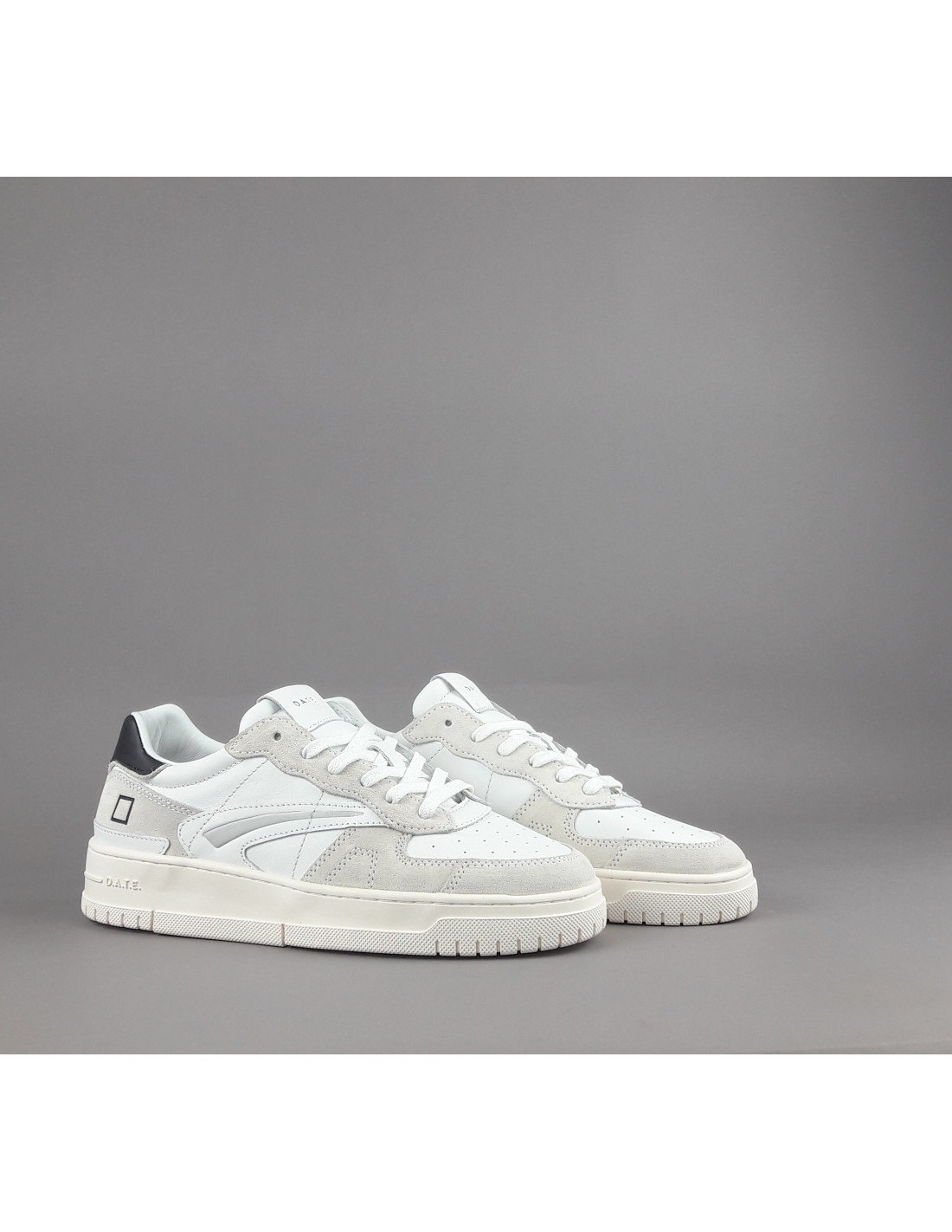 D.A.T.E. collezione estiva, Sneakers uomo TORNEO in pelle bianca e camoscio ghiaccio, spoiler in pelle nero, baffo laterale grigio, fondo cucito, soletta interna removibile di 2,5 cm, suola in gomma.