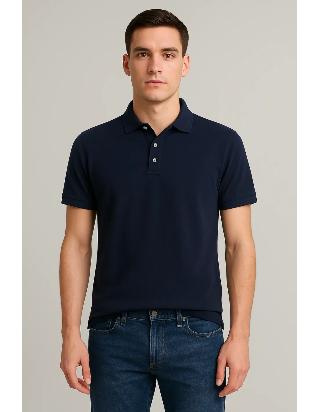 Collezione estiva, polo uomo Filippo De Laurentiis, in piquet di cotone blu scuro, manica corta, chiusura con tre bottoni, vestibilità regular