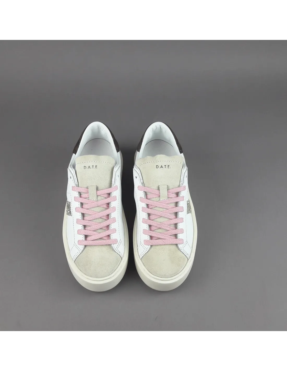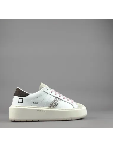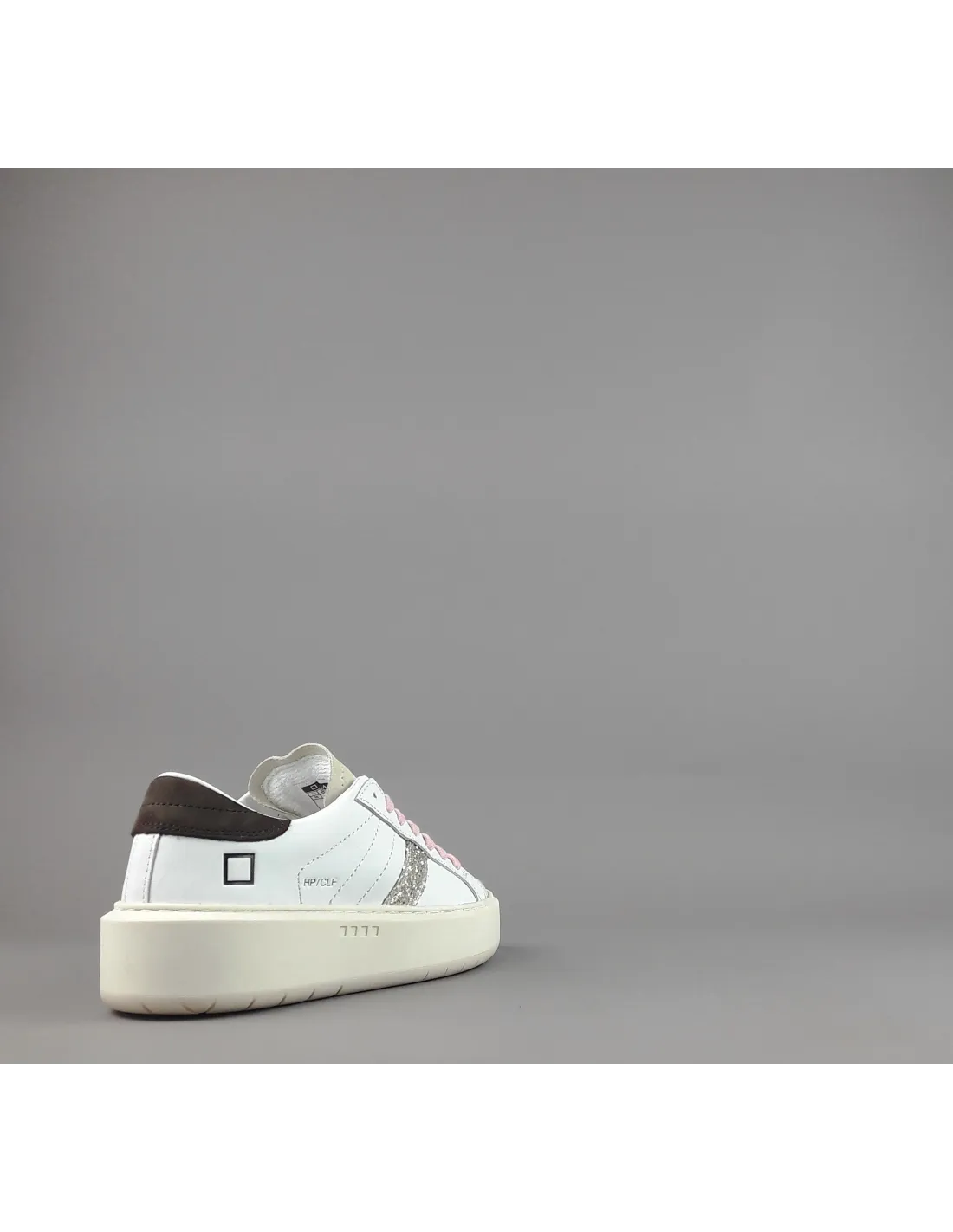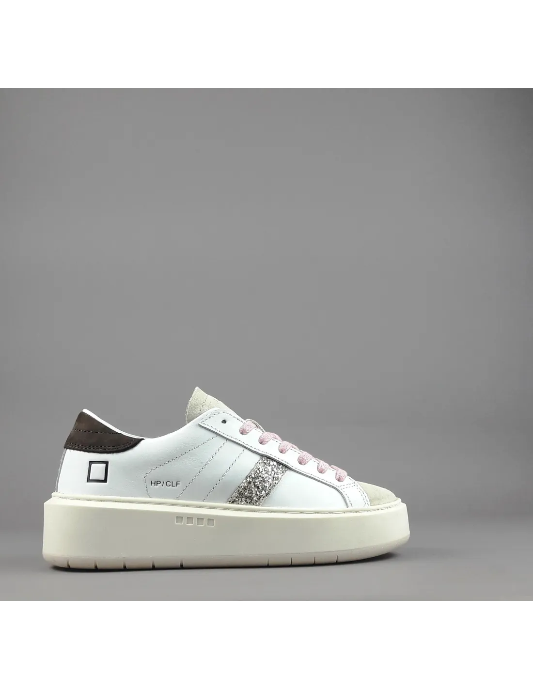 Collezione invernale, Sneakers donna D.A.T.E. HILL PLATFORM in pelle e camoscio, spoiler in camoscio marrone, banda laterale in glitter, linguetta e puntale in camoscio, logo laterale impresso, soletta interna removibile di 2,5 cm, suola in gomma.