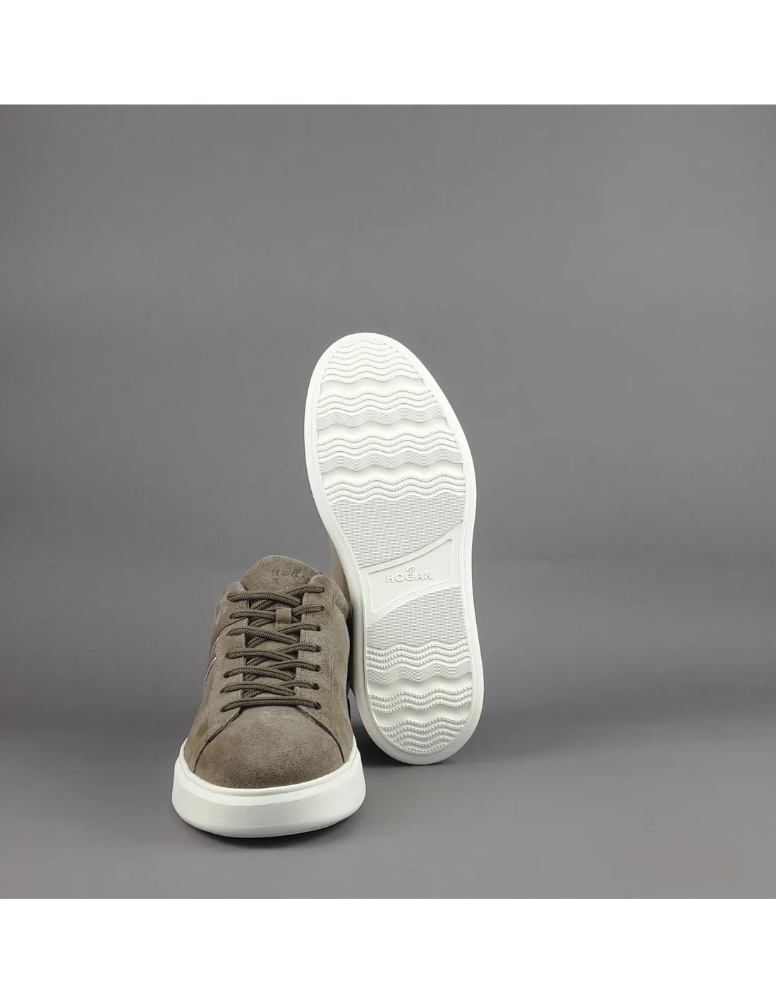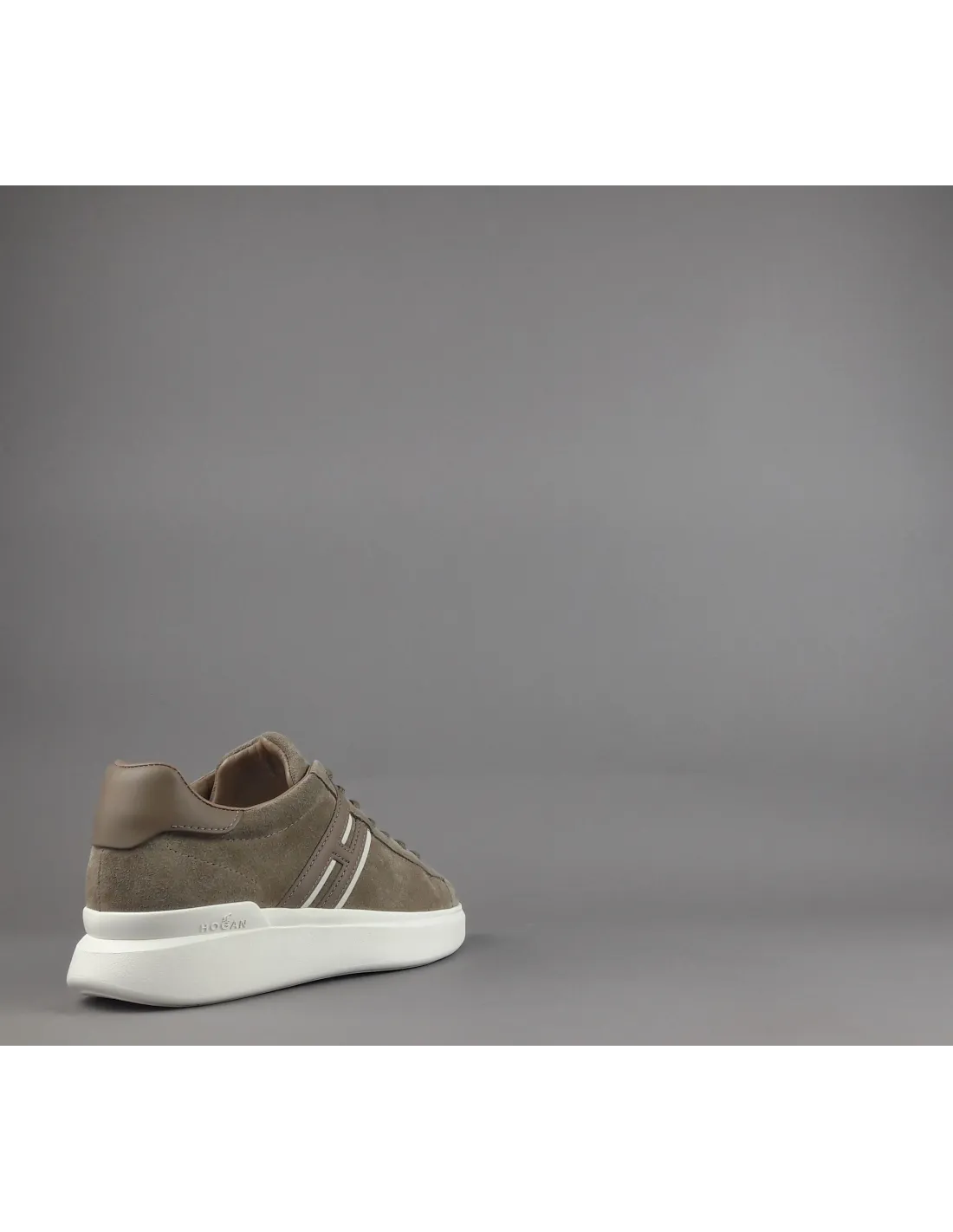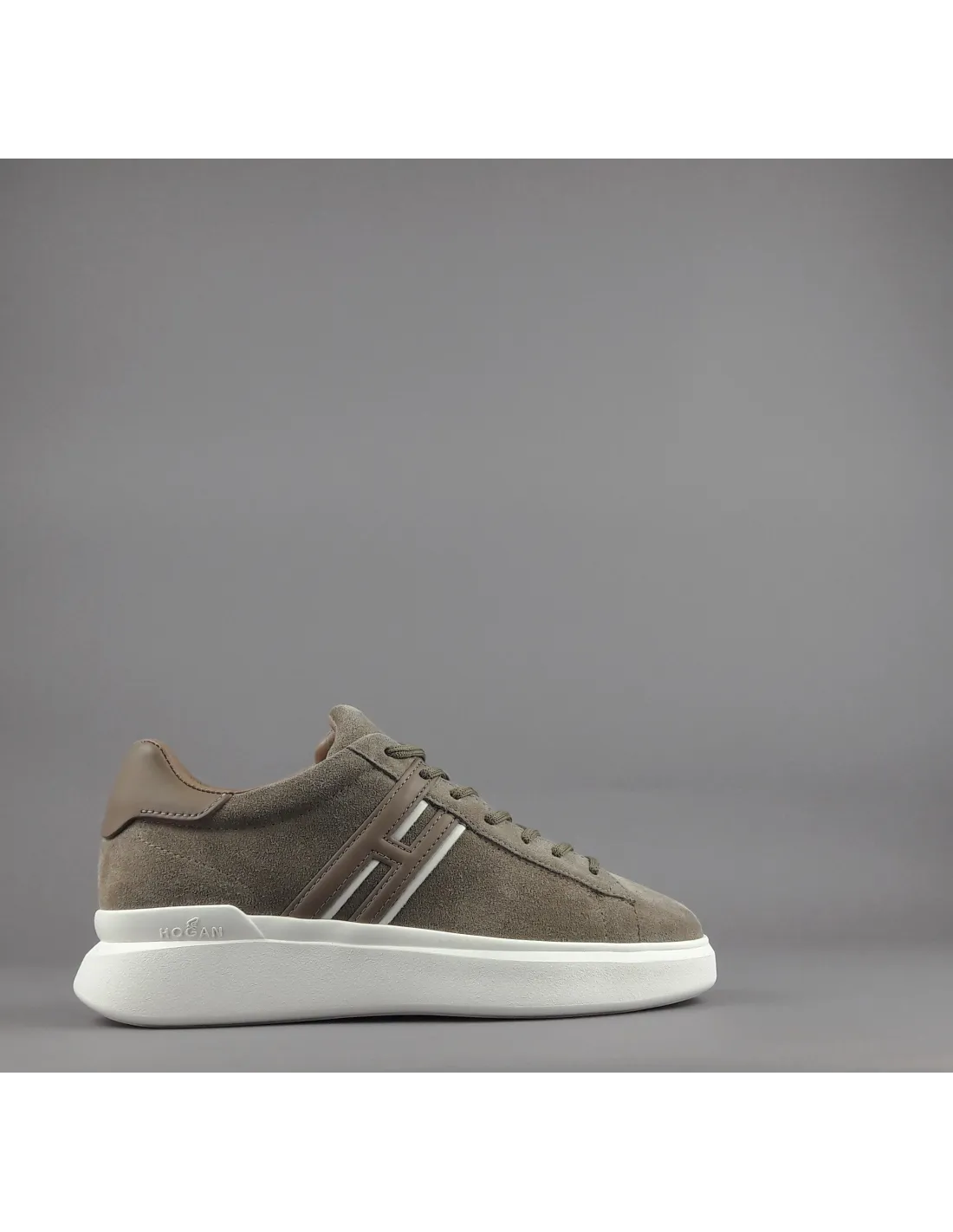 Collezione invernale, sneakers hogan H580 uomo, in camoscio, h cucita in pelle talpa con profilo bianco, spoiler in pelle in contrasto, fussbett in memory foam, fondo gomma.