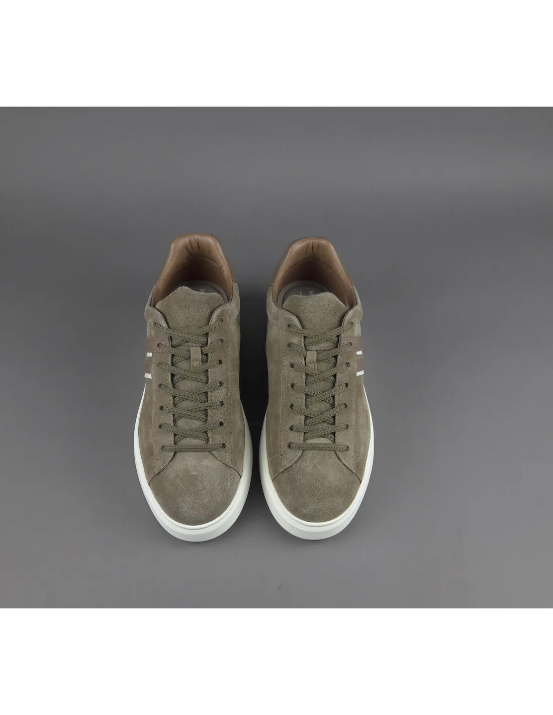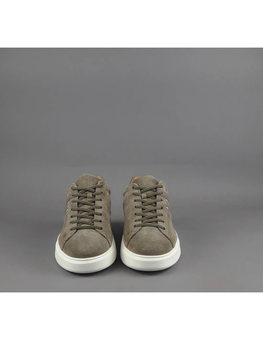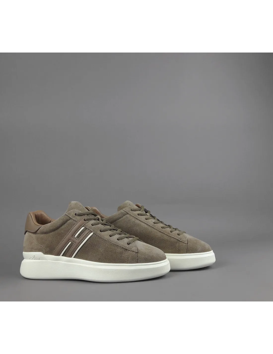 Collezione invernale, sneakers hogan H580 uomo, in camoscio, h cucita in pelle talpa con profilo bianco, spoiler in pelle in contrasto, fussbett in memory foam, fondo gomma.